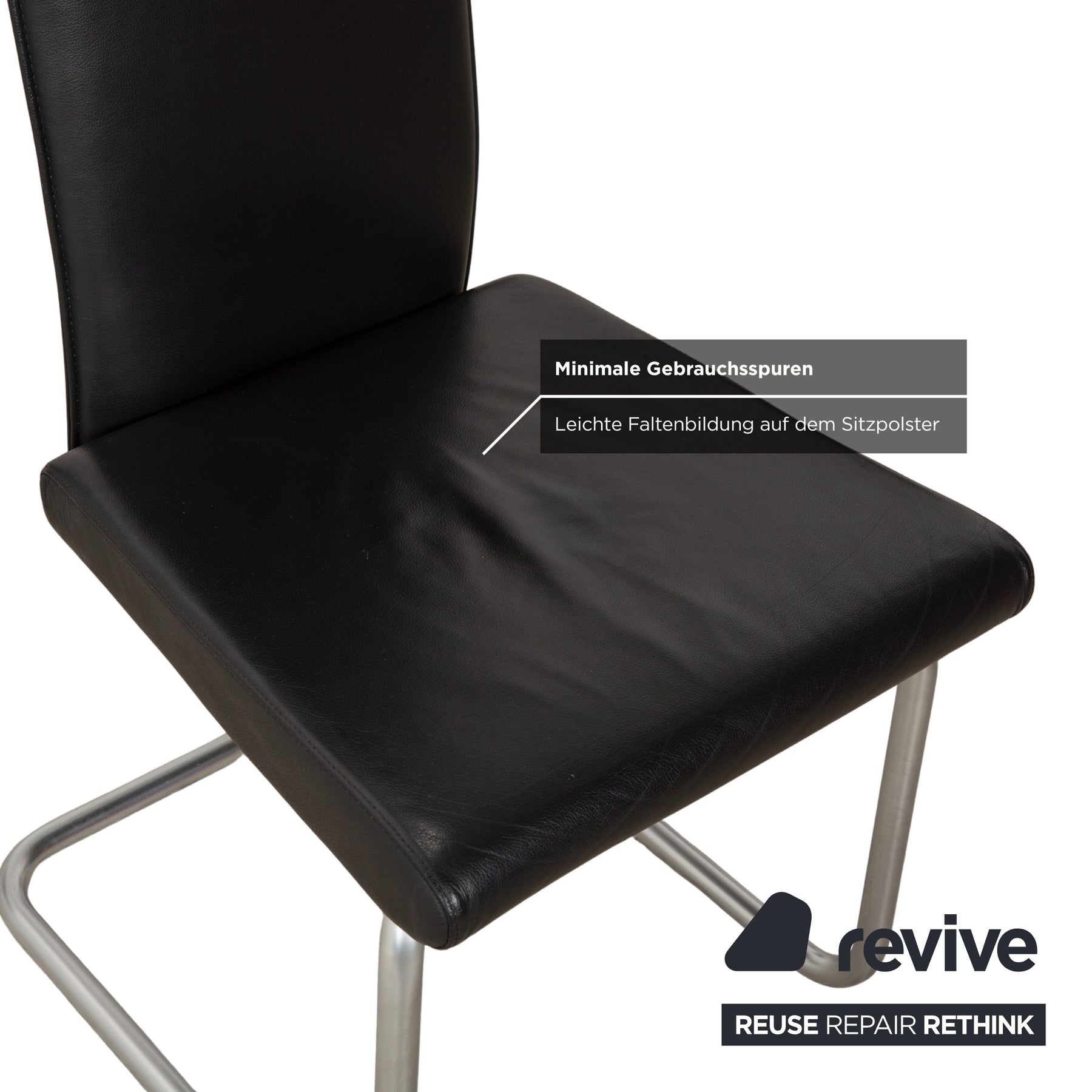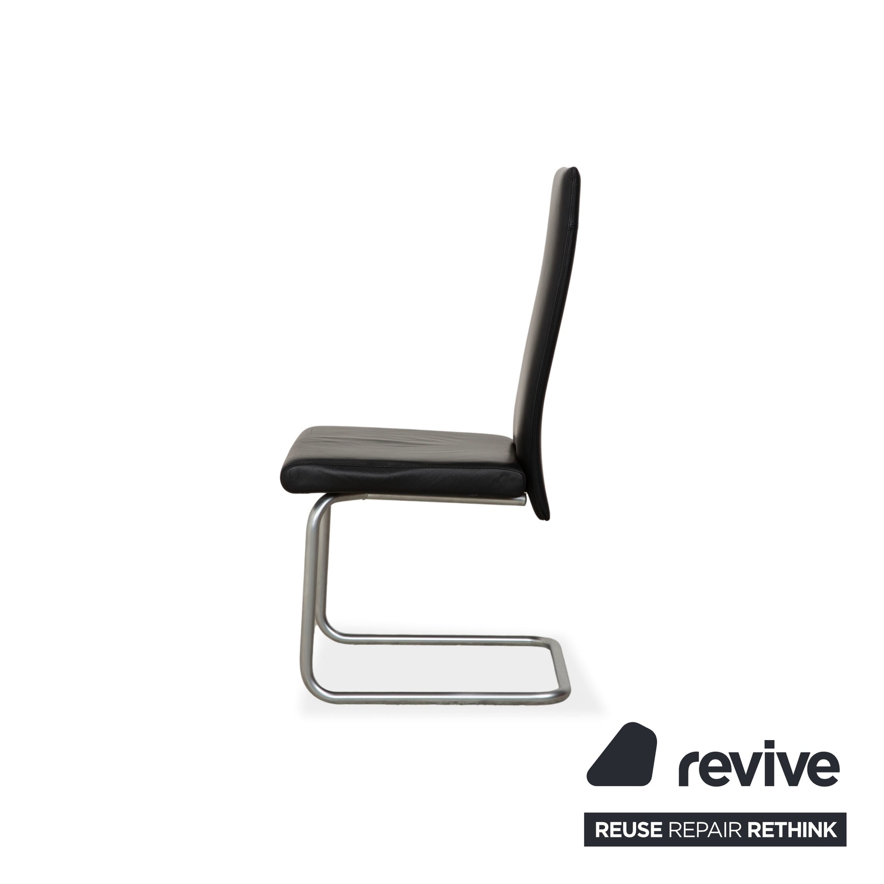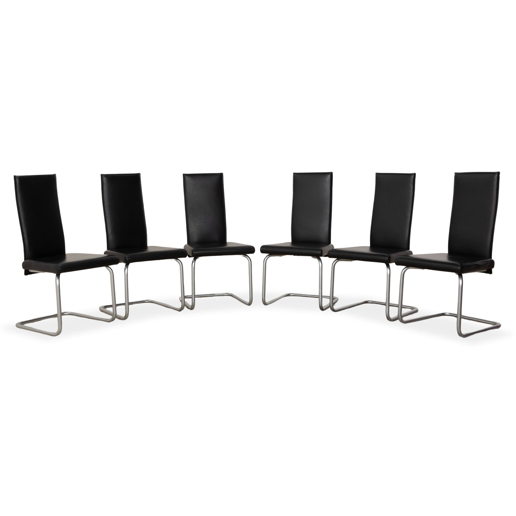 This set of six modern cantilever chairs by Ronald Schmitt features a simple, clean design with a high backrest and a continuous chrome-look metal frame. The seat and back are fully upholstered in black leather, ensuring an easy-care surface.