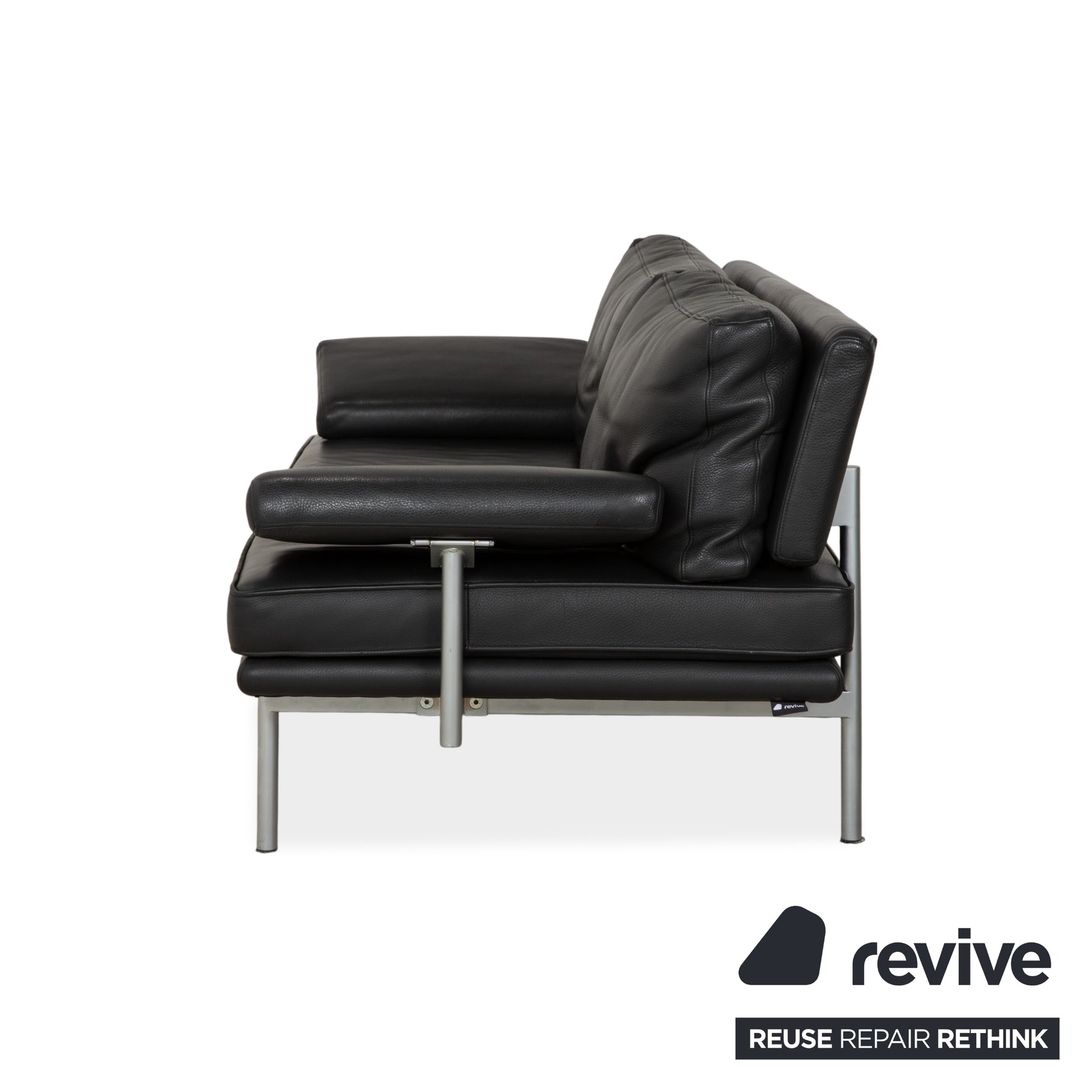 The Walter Knoll Living Platform Sofa is a modern design classic that impresses with its minimalist design and uncompromising quality. Upholstered in deep black, premium leather, this two-seater exudes a sophisticated elegance that blends seamlessly into refined living or office environments. The defining characteristic of this model is its visual lightness: the cubic cushion rests on a delicate frame of matte metal, giving the sofa the appearance of floating in the room.