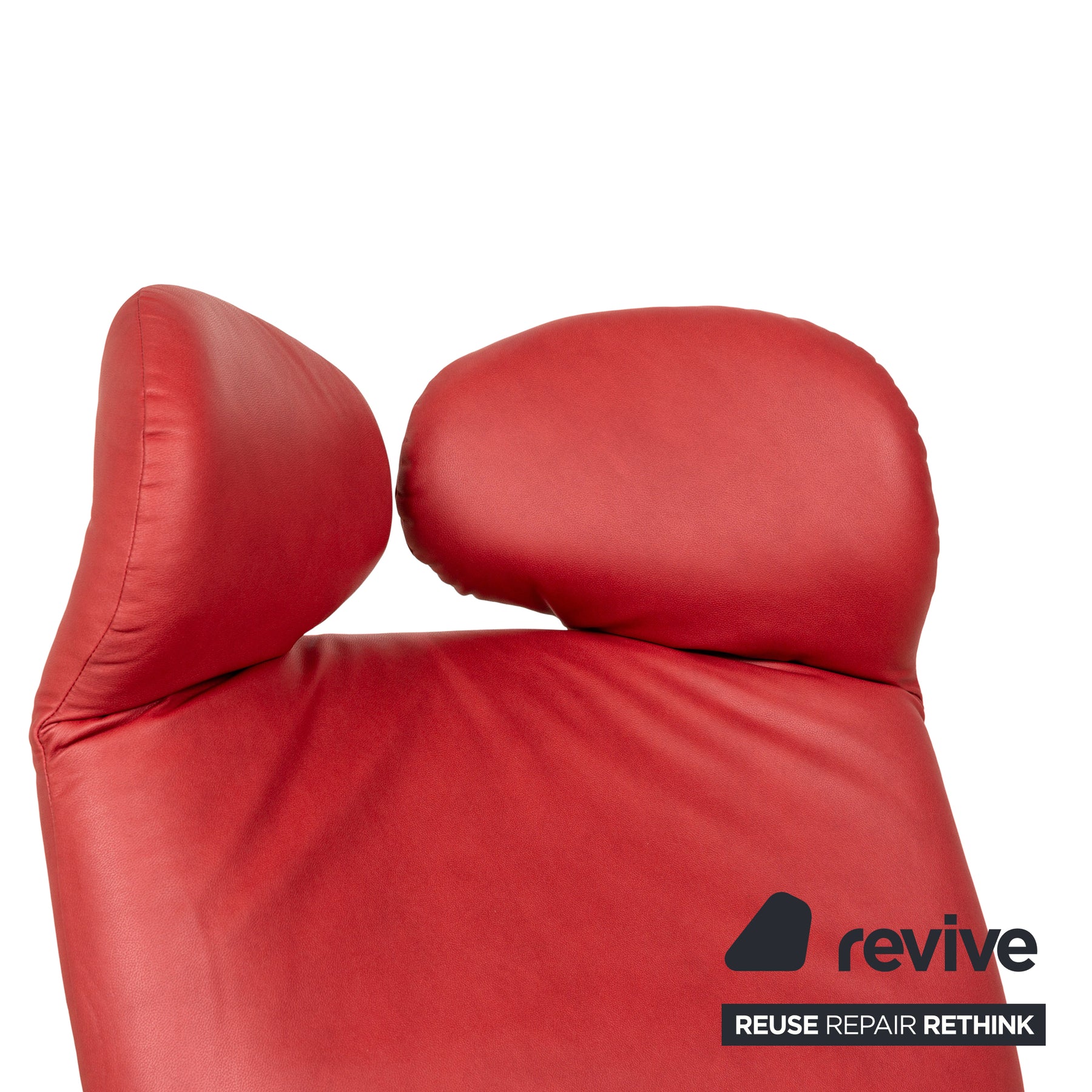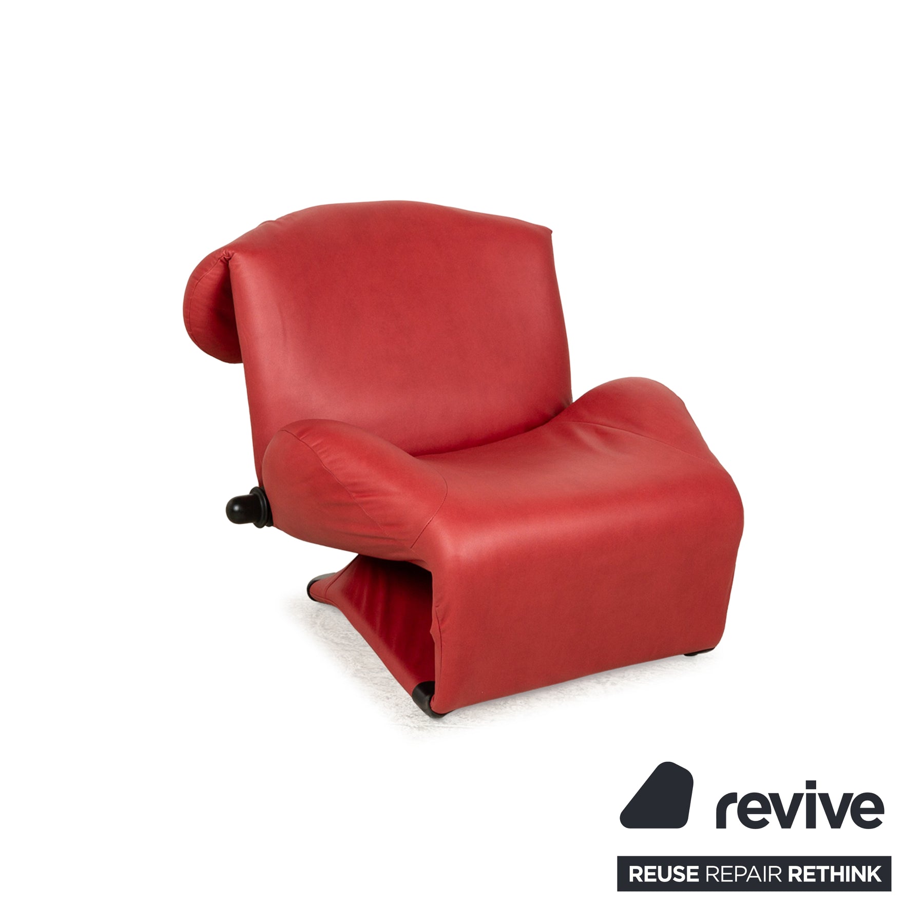 The Wink armchair by Cassina is covered with red vegan leather (GAVIN 107) and stands on small, black feet. It is characterized by its practical relaxation function and minimalist design.