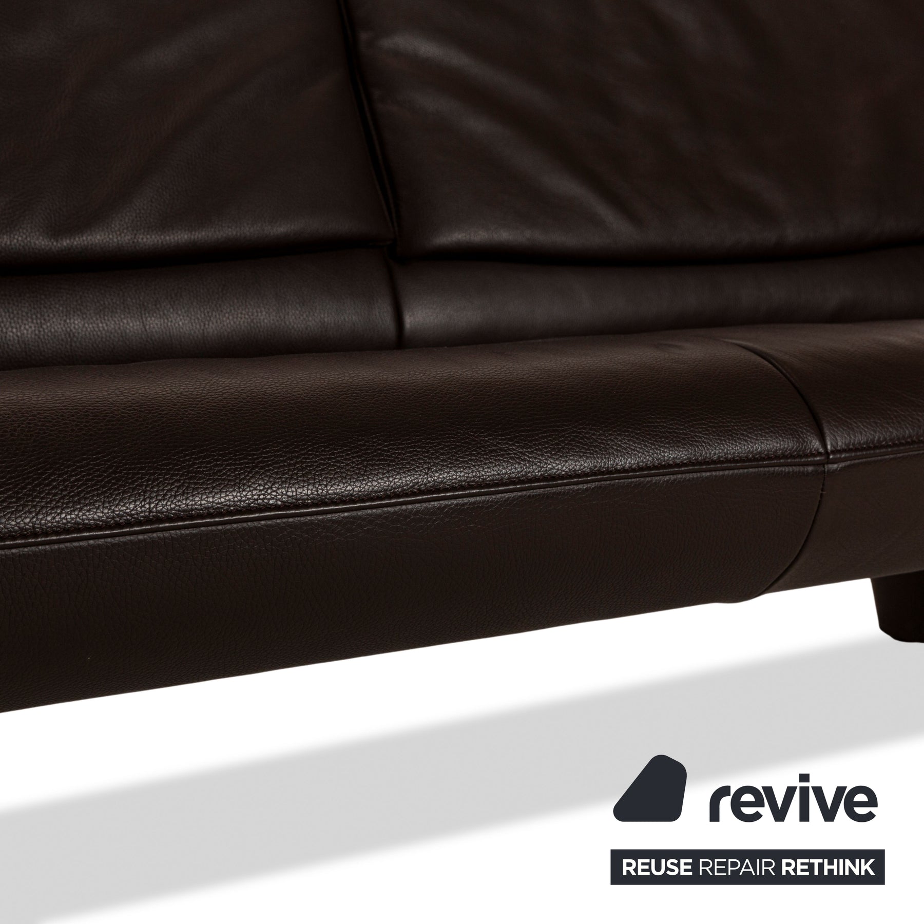 The Angel JR-3250 sofa by Jori is covered with dark brown genuine leather. Its sides end in elegant metal caps.