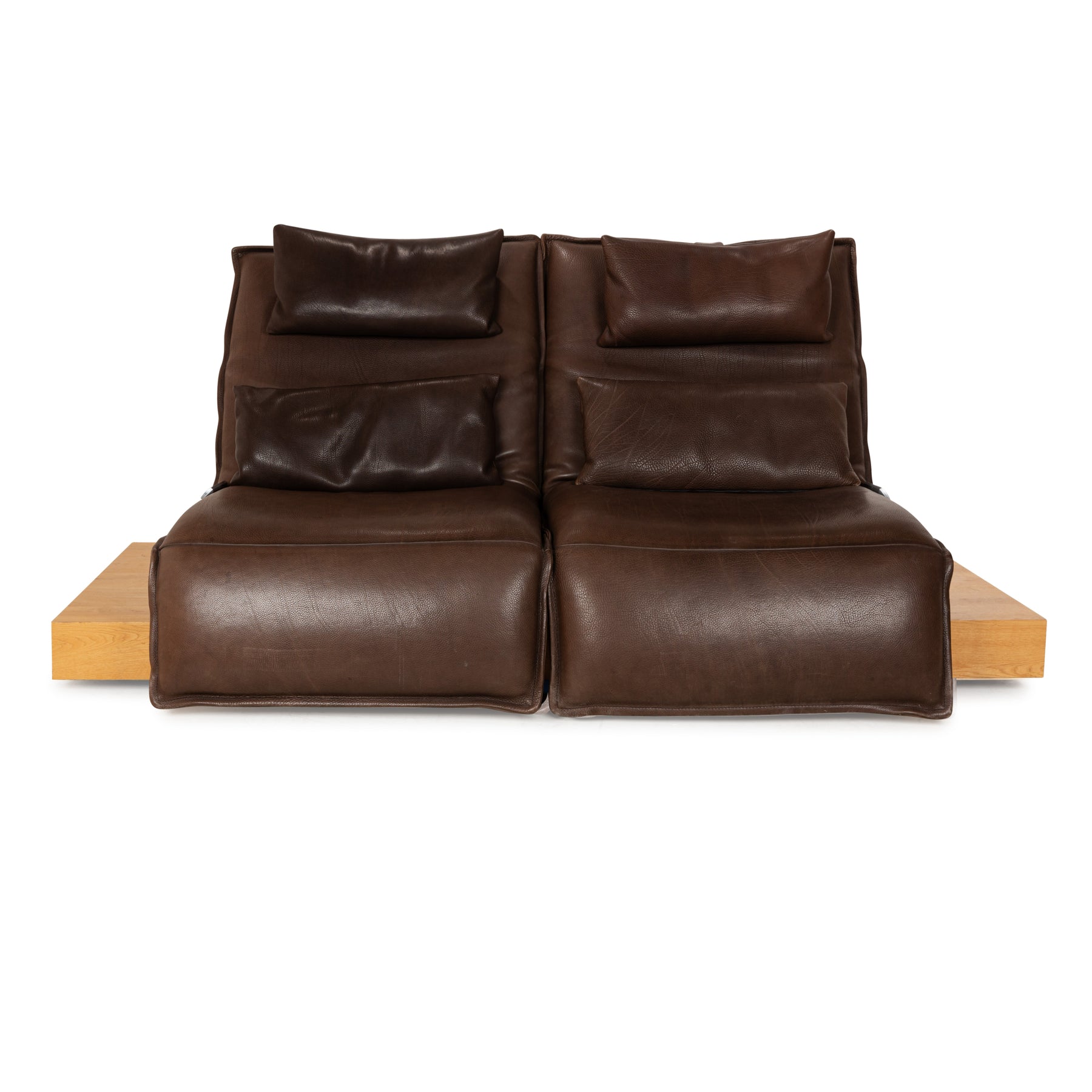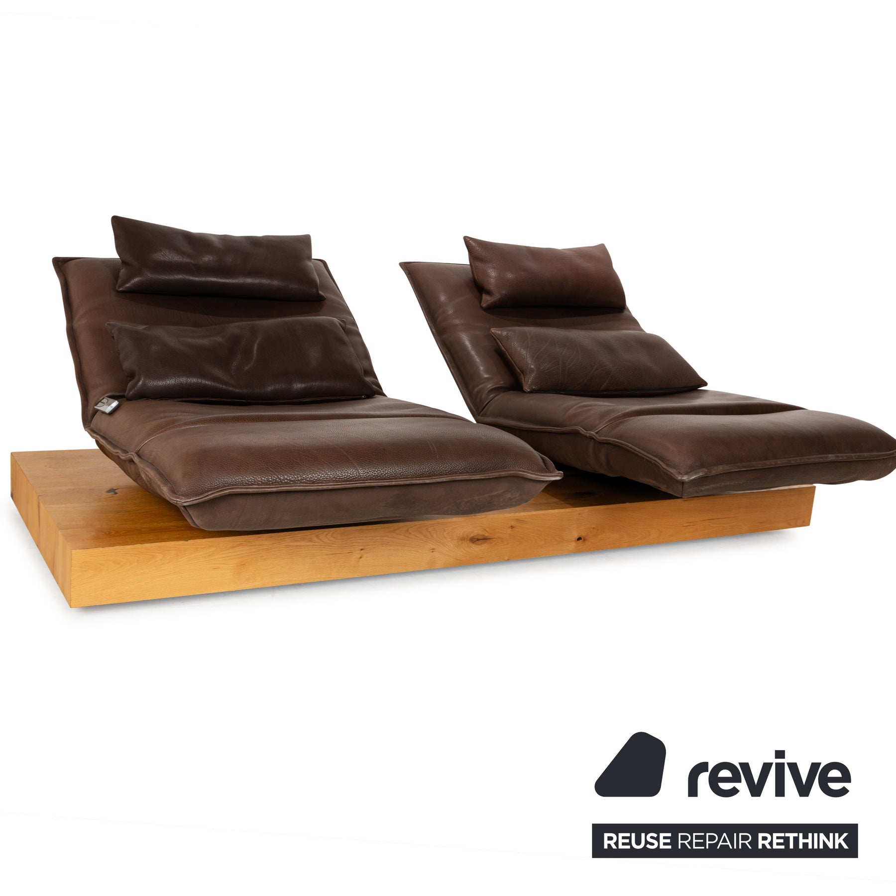 The Free Motion Epos 3 sofa from Koinor is upholstered in brown leather and sits on a square wooden platform. Its room-dominating, exclusive design and various electrical adjustment options distinguish this two-seater. Whether used as a single seat or as individual armchairs, this sofa brings the highest level of comfort into your home.