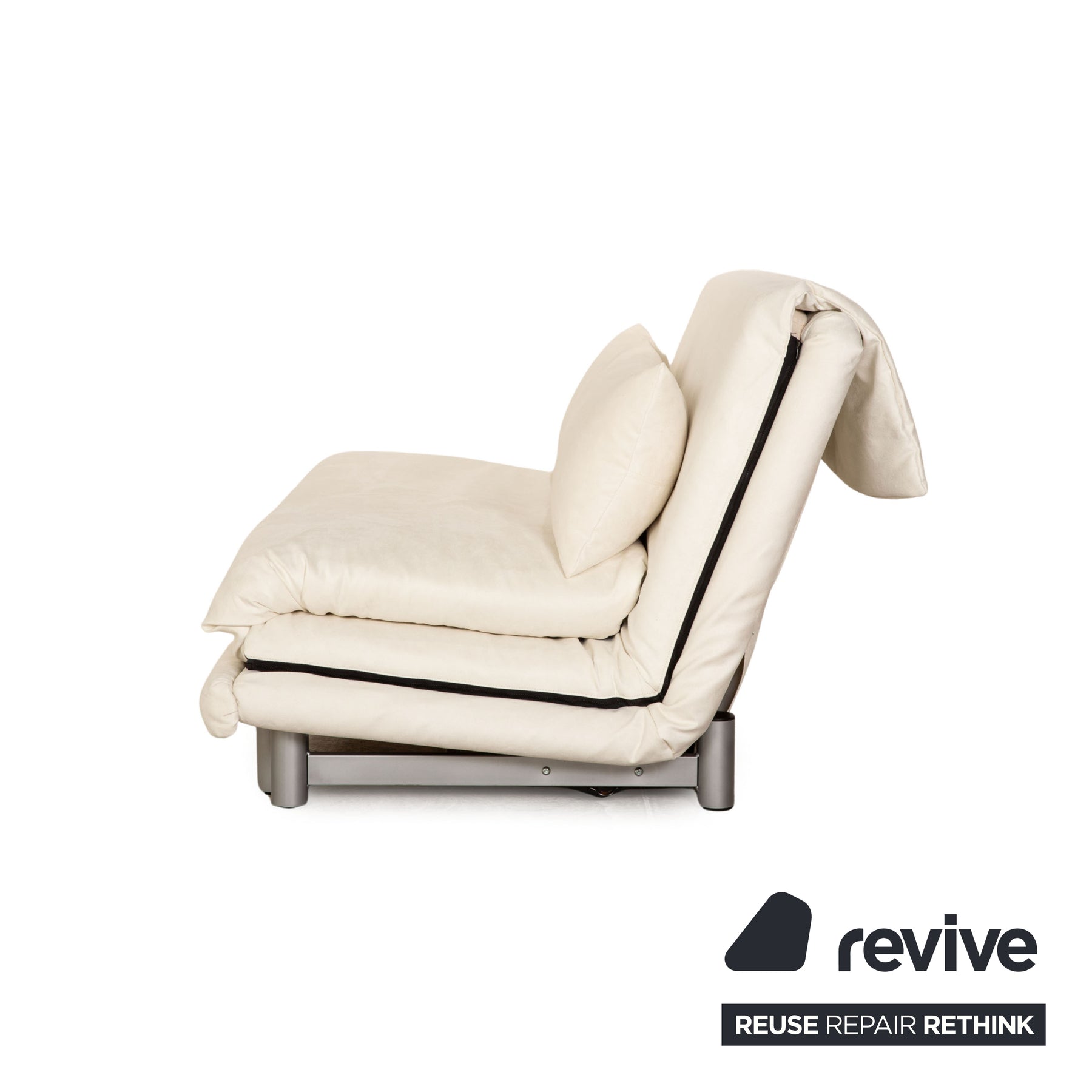 The Multy sofa from ligne roset is newly upholstered in a white fabric and stands on round metal feet. The minimalist design and the comfortable sleeping function characterize the three-seater.