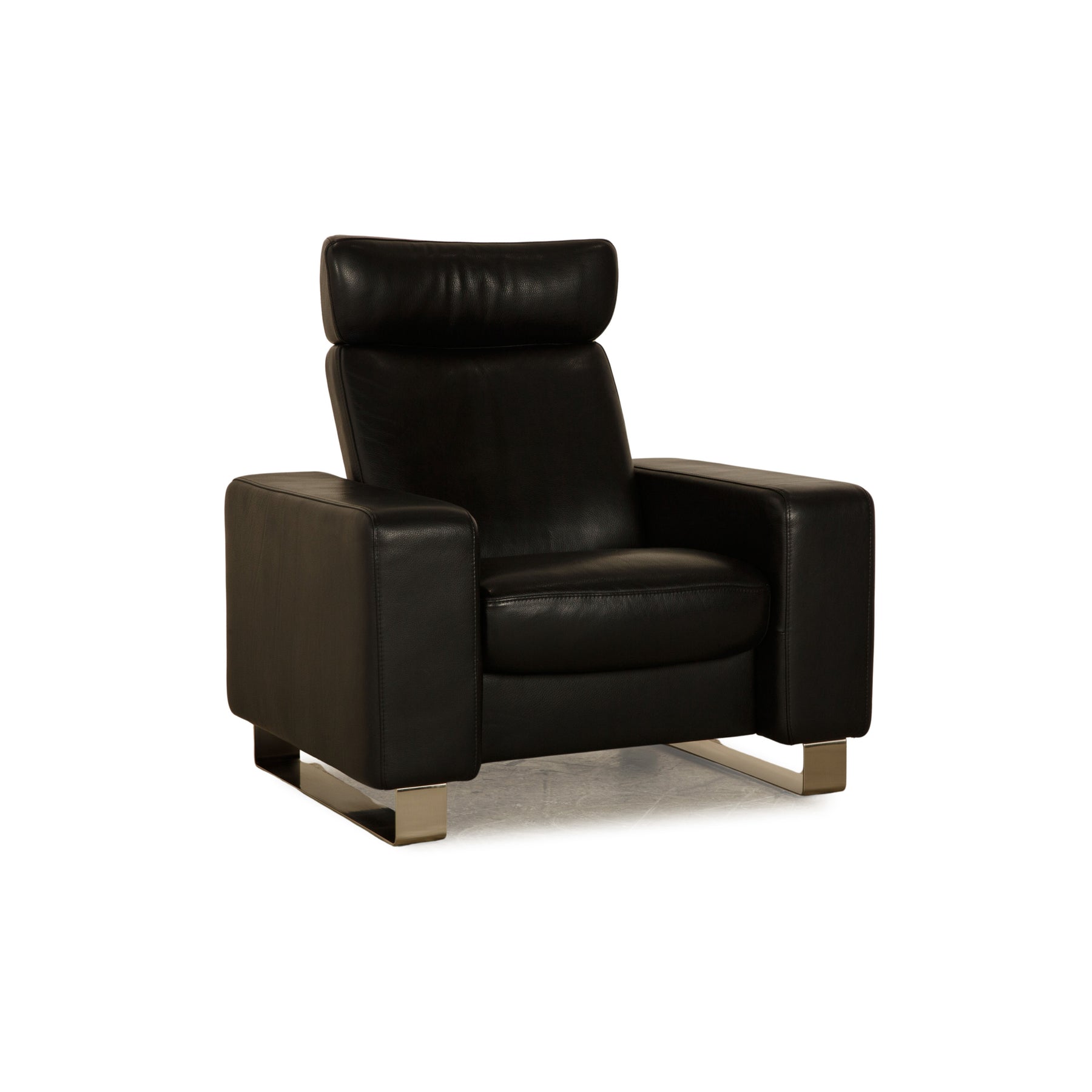 The Arion armchair from Stressless is covered in black genuine leather and stands on silver metal feet. It impresses with its classic design and the comfortable, adjustable headrest.