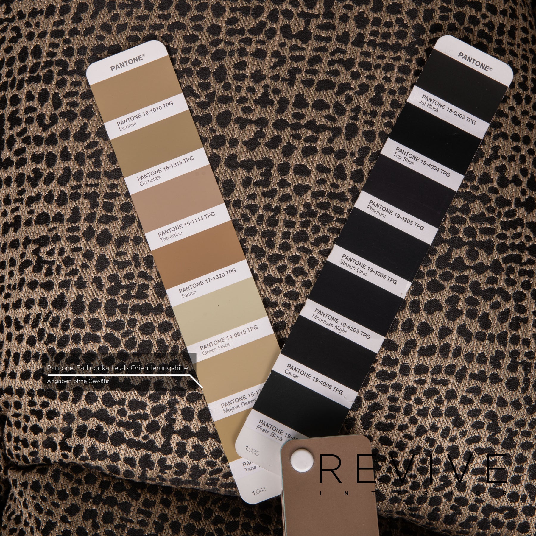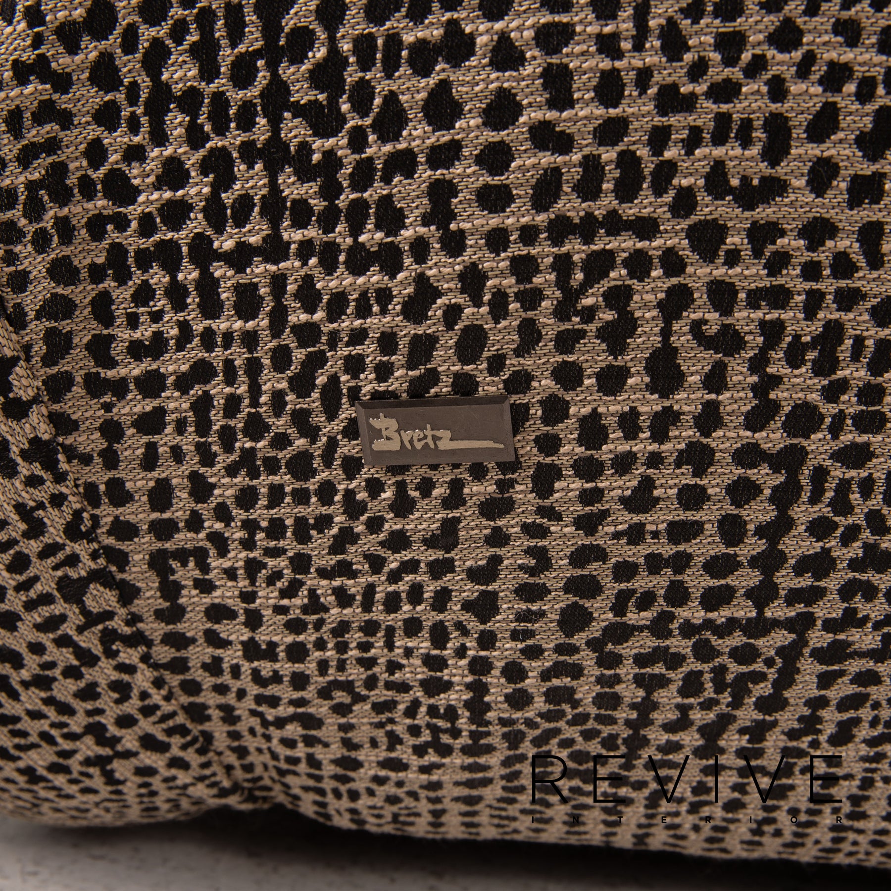 The four-seater Cloud 7 by Bretz has been reupholstered with a brown and black patterned fabric (LISBOA FR 500, material: 100% polyester) . The sofa convinces with a large seat and the tile-shaped upholstery.