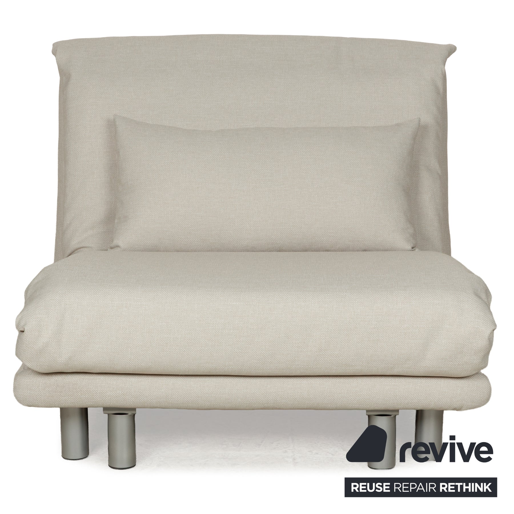 The multy armchair from ligne roset has been reupholstered in a light beige fabric (Verano 610 by Höpke) and sits on a silver metal frame. Its minimalist design and comfortable sleeping function distinguish it, and it can be converted into a sofa bed in just a few simple steps.