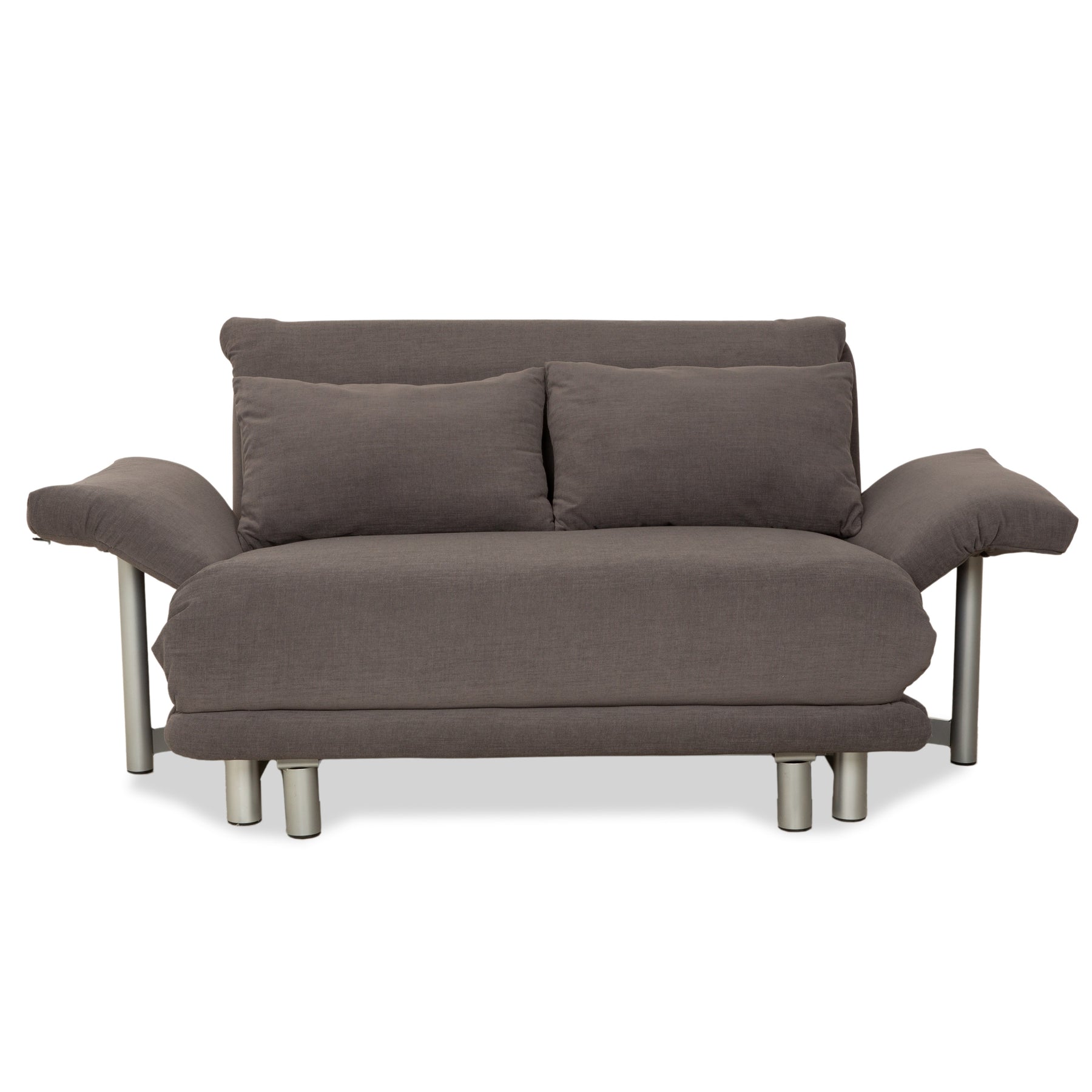 The Multy sofa by Ligne Roset has been reupholstered in a gray fabric and sits on a silver metal frame. Its minimalist design and comfortable sleeping function characterize this two-seater, which can be converted into a sofa bed in just a few simple steps. This version features practical, laterally adjustable armrests.