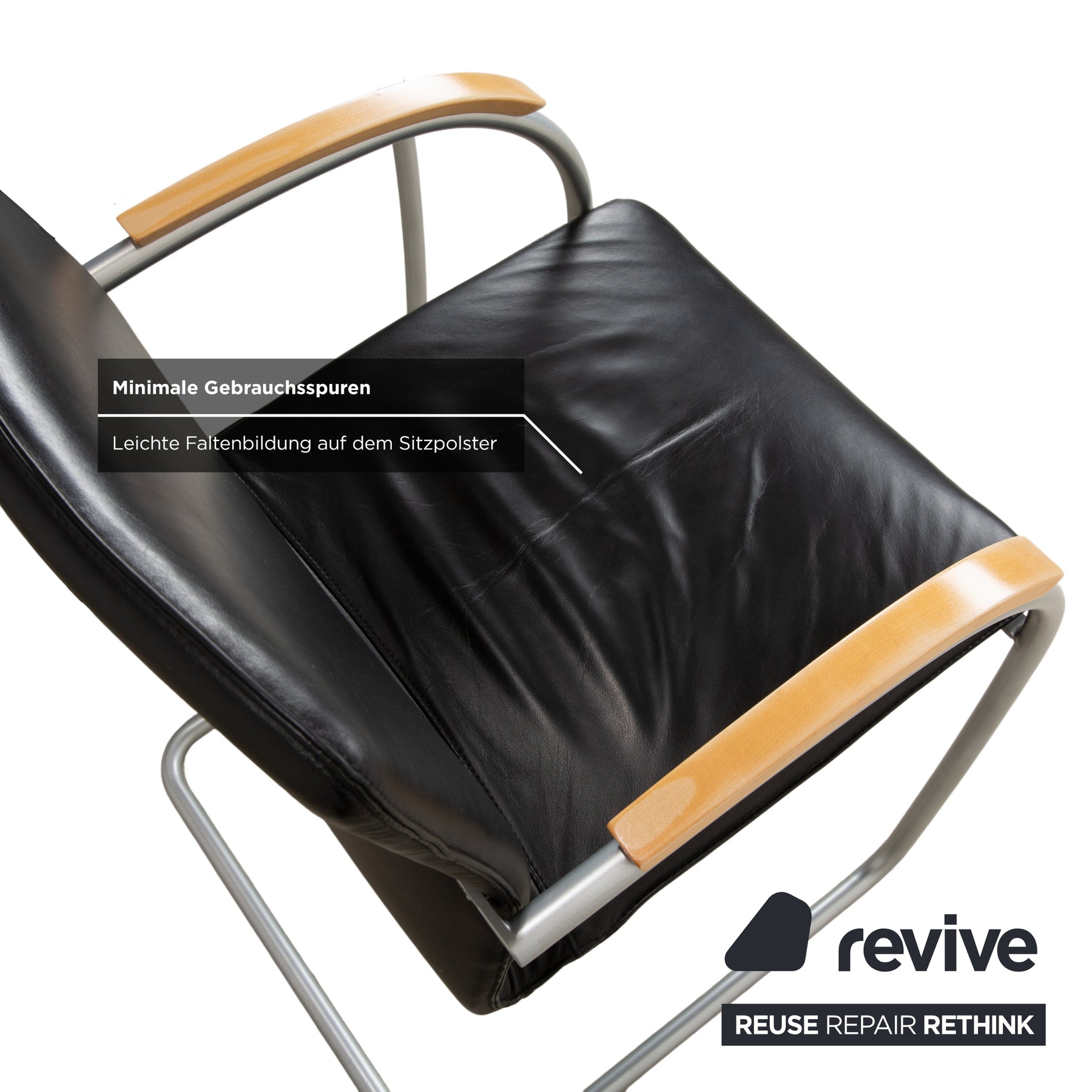 Der schwarze Lederbezug wirkt edel und zurückhaltend zugleich. Das hochwertige Leder fühlt sich angenehm an, ist langlebig und unterstreicht den anspruchsvollen Charakter der Stühle. Die ergonomisch geformte Sitzschale mit sanfter Polsterung sorgt für komfortables Sitzen auch über längere Zeit.