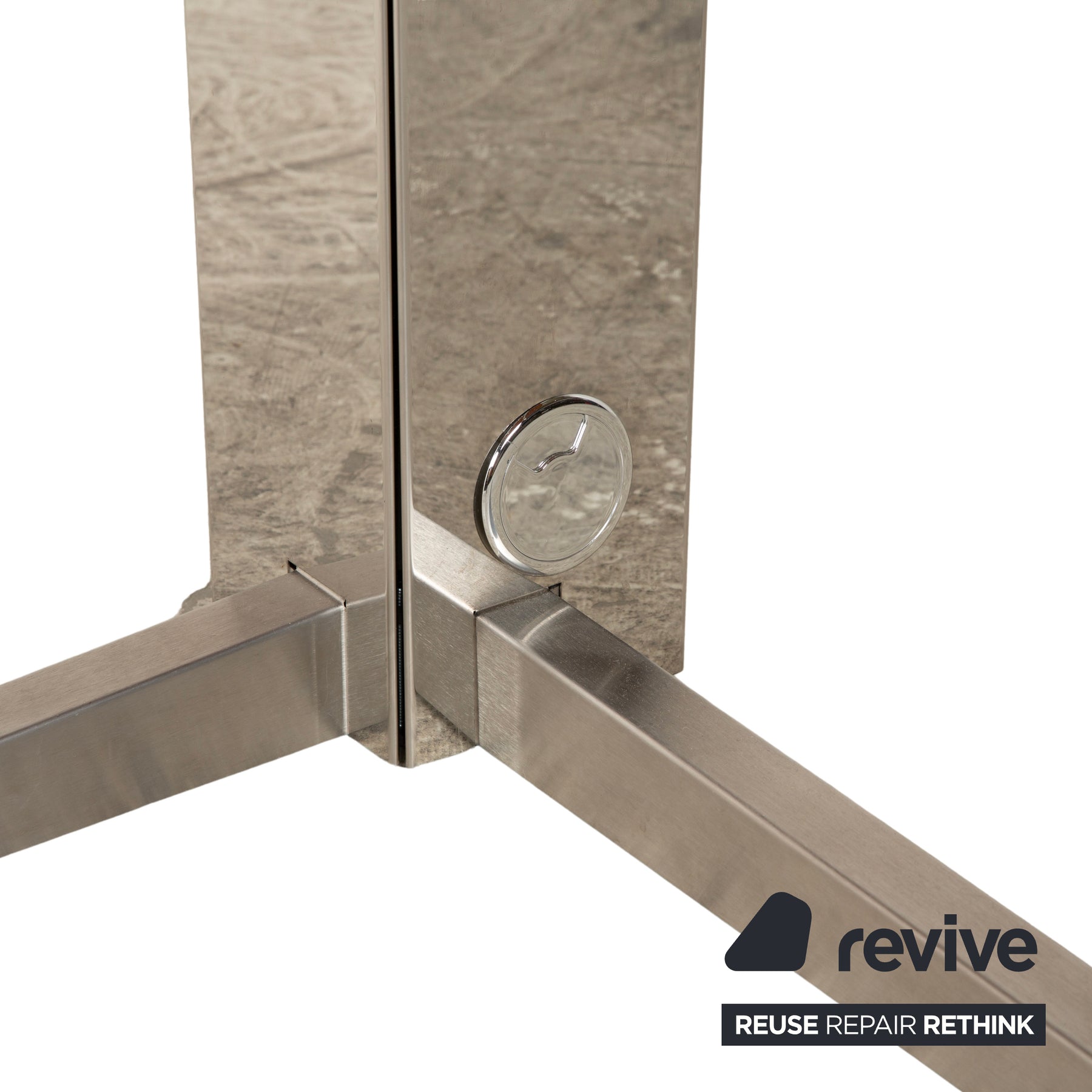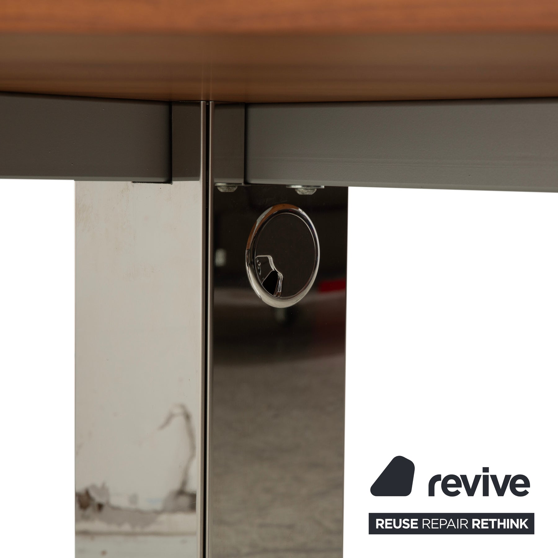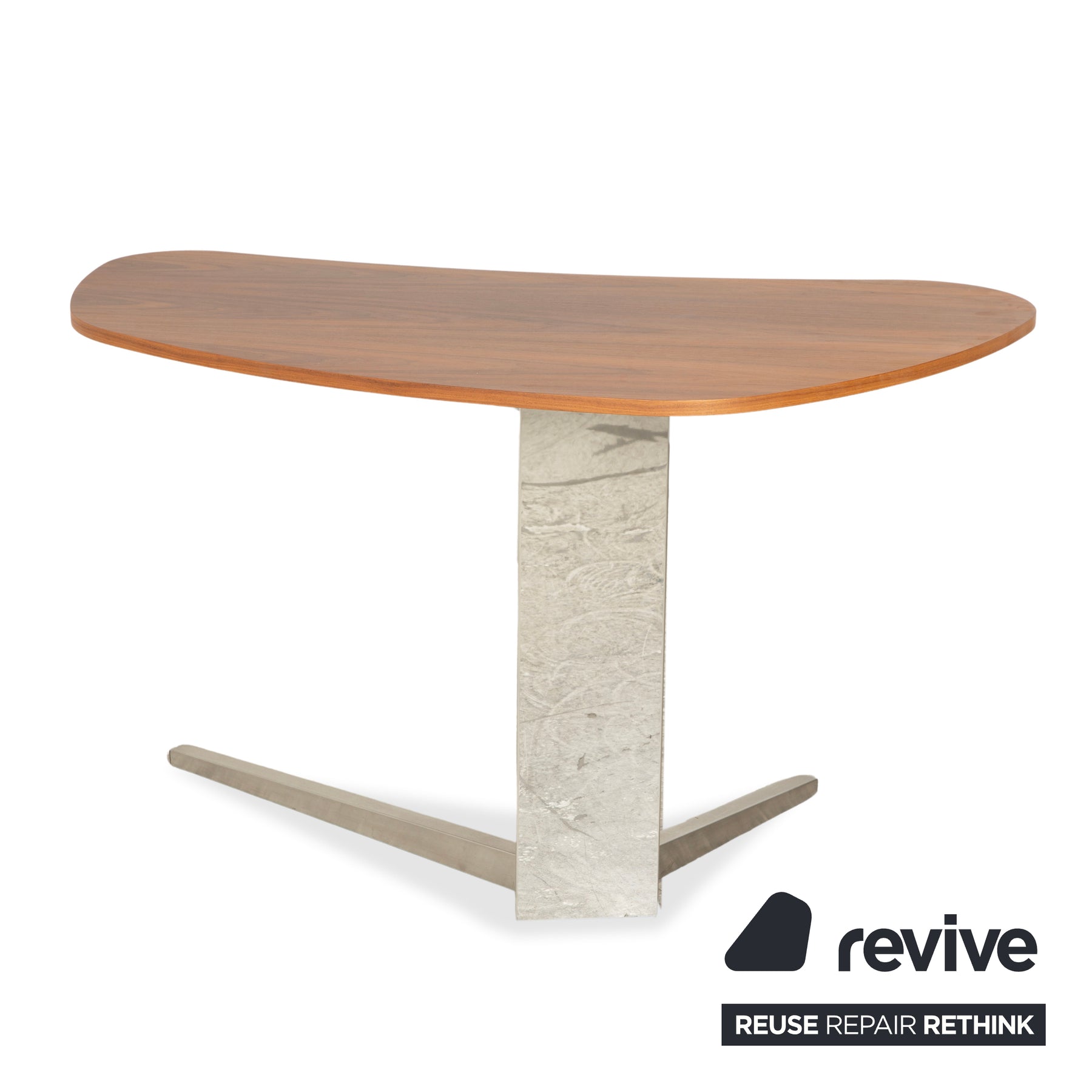 The warm wood-toned tabletop offers ample space for your laptop and documents, yet its curved shape prevents it from appearing bulky or cumbersome. The modern frame provides a striking contrast: a solid stainless steel base supports the tabletop and ensures stability, while the slender column lends the table a sense of lightness. Since it looks good from all angles, you don't need to place it against a wall; it can be positioned freely in the room as your own personal little work island.