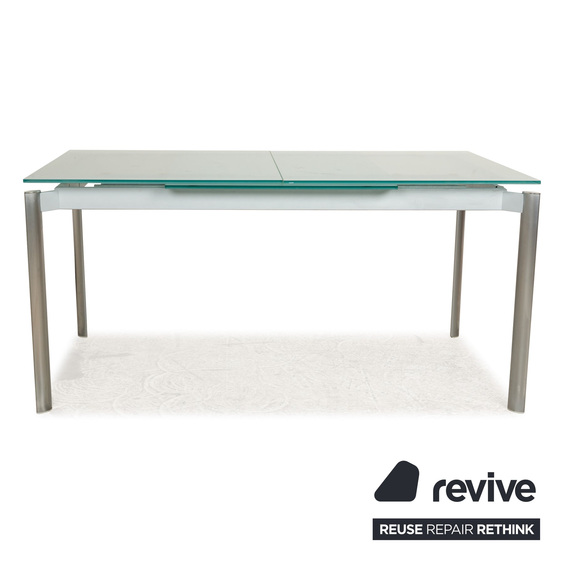 The glass table from Kristalia is made from a light green glass top attached to a metal frame. The classic, slightly modern design and the practical extension function make this dining table a stylish addition to the modern dining room.