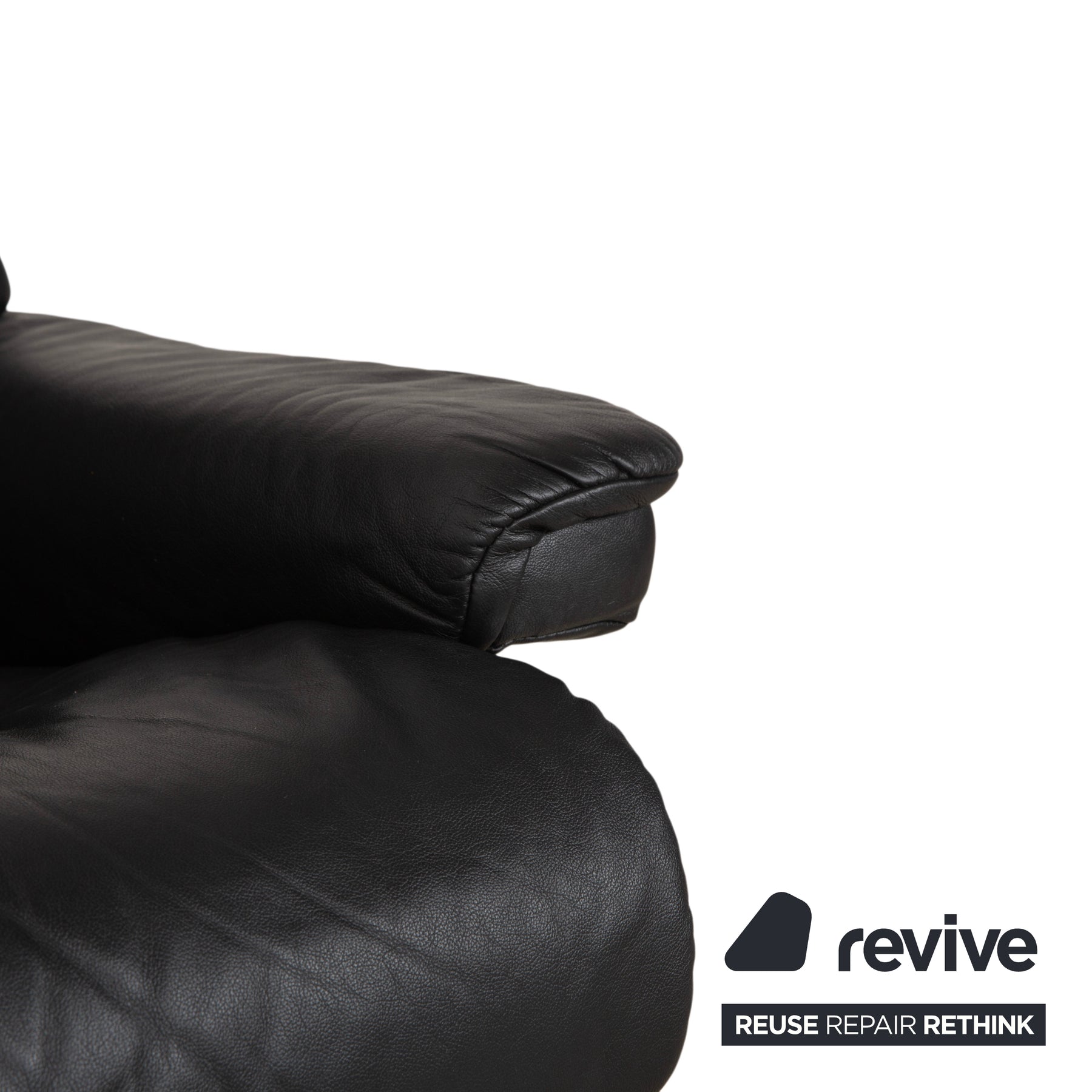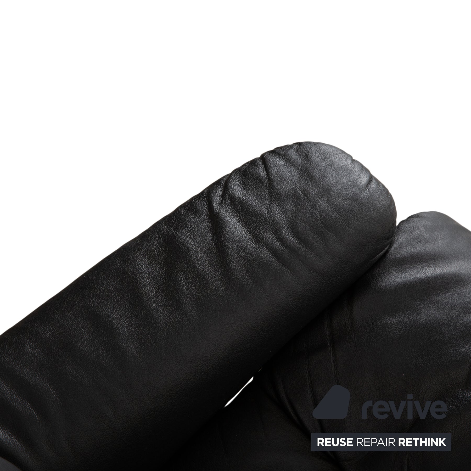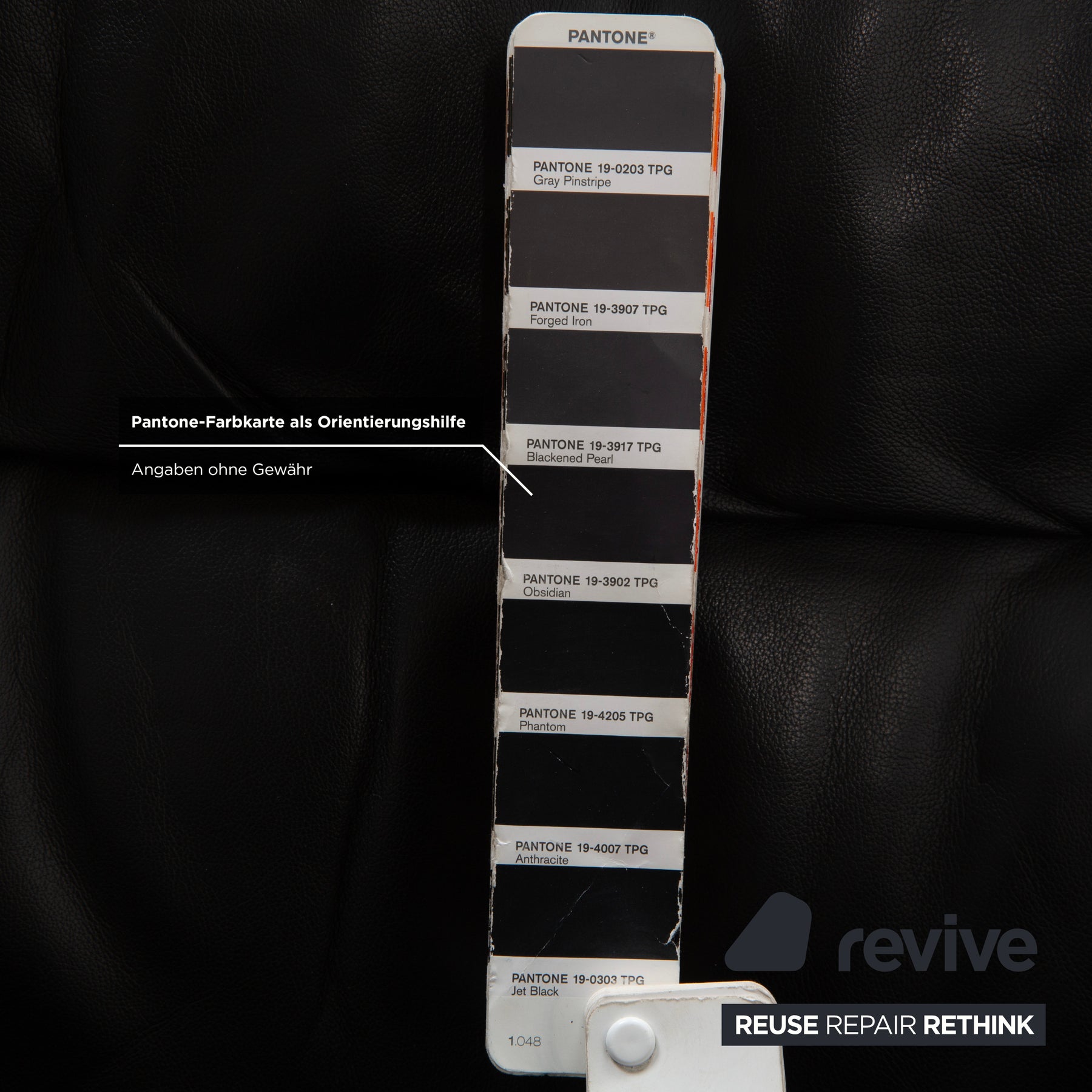 Der Bezug besteht aus einem hochwertigen, geschmeidigen Leder in einem tiefen Dunkelgrau bis Anthrazit, was dem Möbelstück eine sehr edle und zeitlose Ausstrahlung verleiht. Die Polsterung ist üppig und weich, wobei die charakteristischen Steppnähte im Rücken für eine optische Gliederung sorgen.