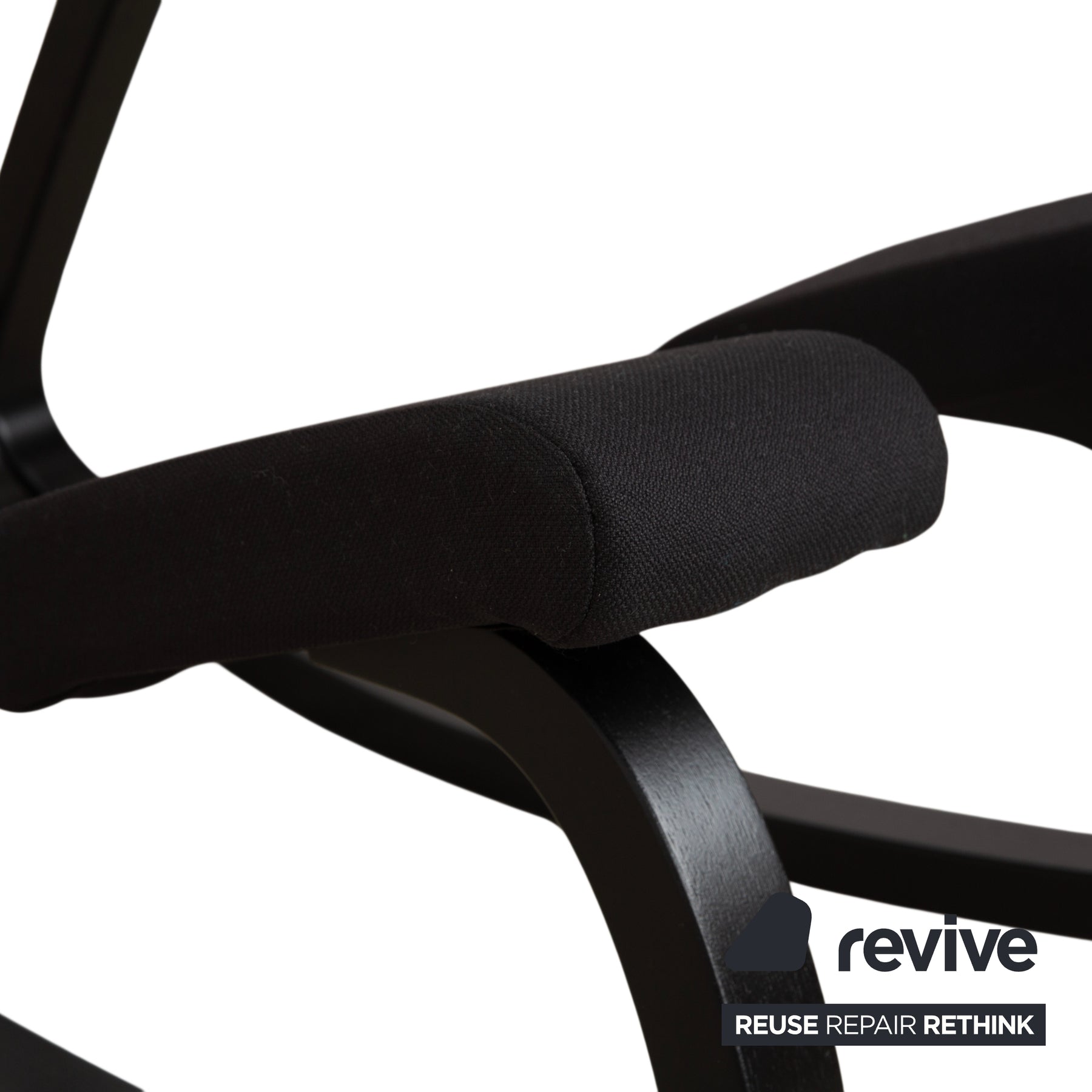 Im bewussten Kontrast dazu steht die schwarze Edition: Mit dunkel gebeiztem Holz und tiefschwarzem Stoff wirkt sie absolut minimalistisch, seriös und zeitlos „clean“. Egal ob man den frischen Farbtupfer oder das monochrome Statement bevorzugt: Beide Stühle bieten das identische, geniale Sitzgefühl, das durch die Kufenbewegung den Rücken aktiv hält und langes Sitzen spürbar erleichtert.