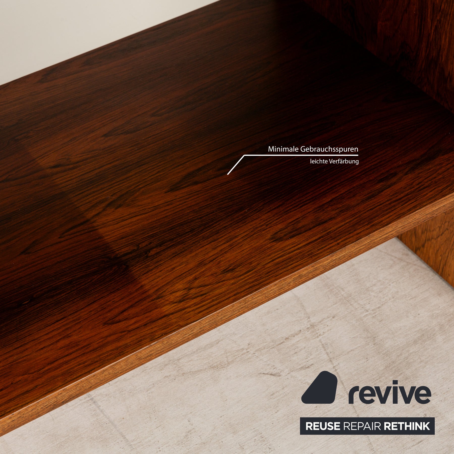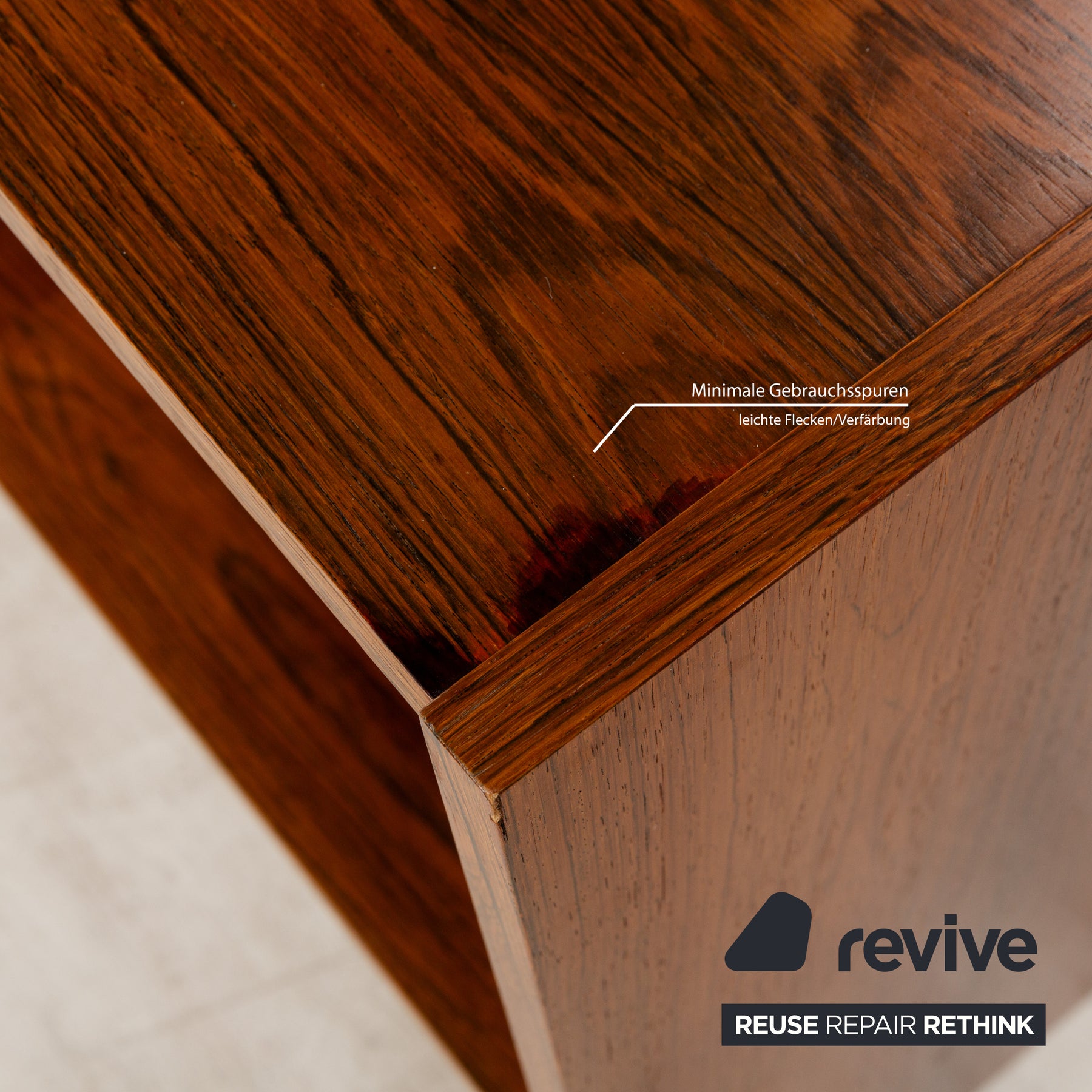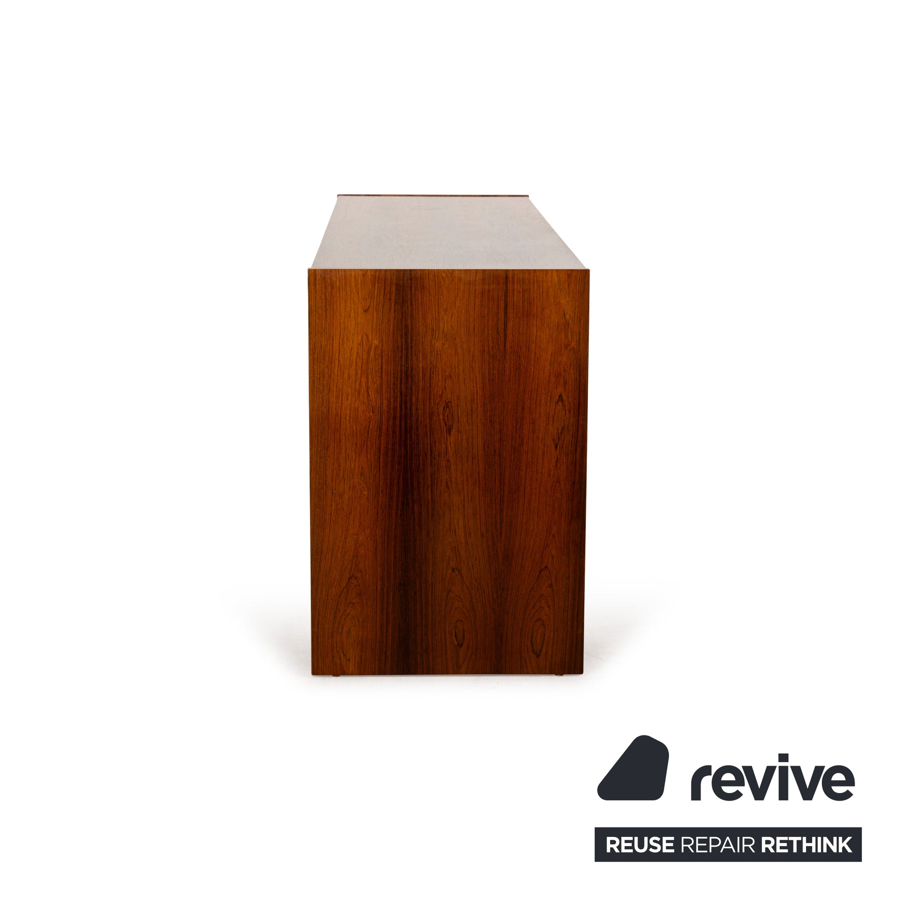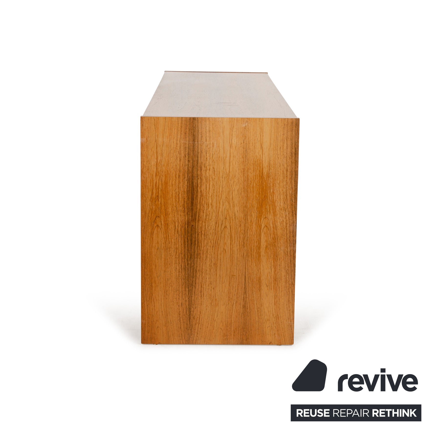 The sideboard from WOK Wohnen is made of brown wood and stands on floor-to-ceiling sides. It is characterized by its classic and airy design - four drawers are mounted between two open compartments of different sizes. The cloud here is the arrangement of the handles.