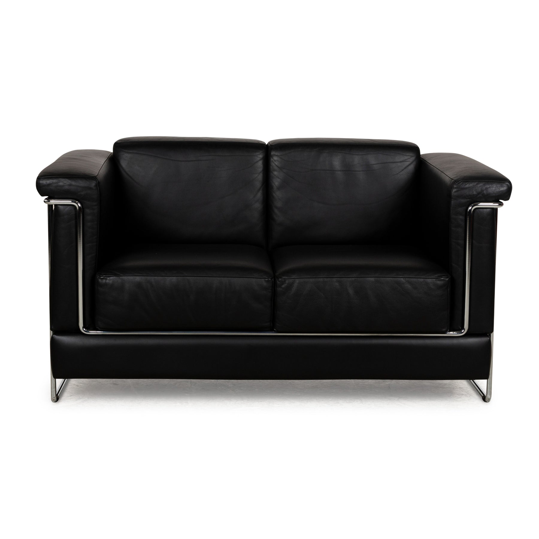 The two-seater Carat by Züco is covered in black leather and stands on narrow metal runners. The individual upholstered elements are enclosed in a filigree metal construction, reminiscent of classic Bauhaus-style furniture.