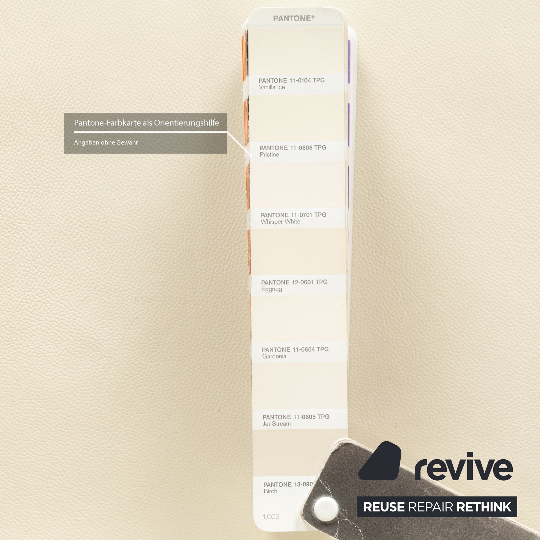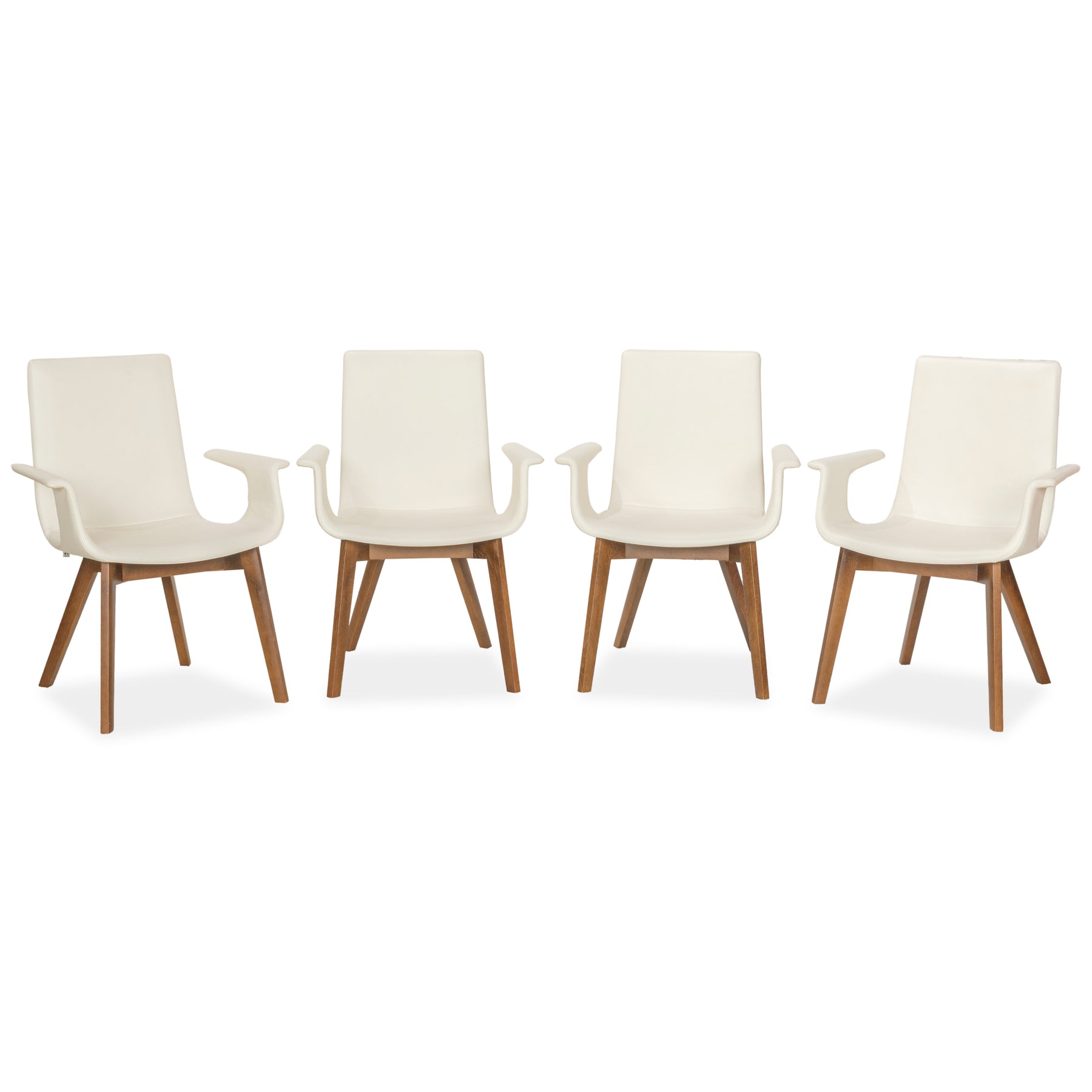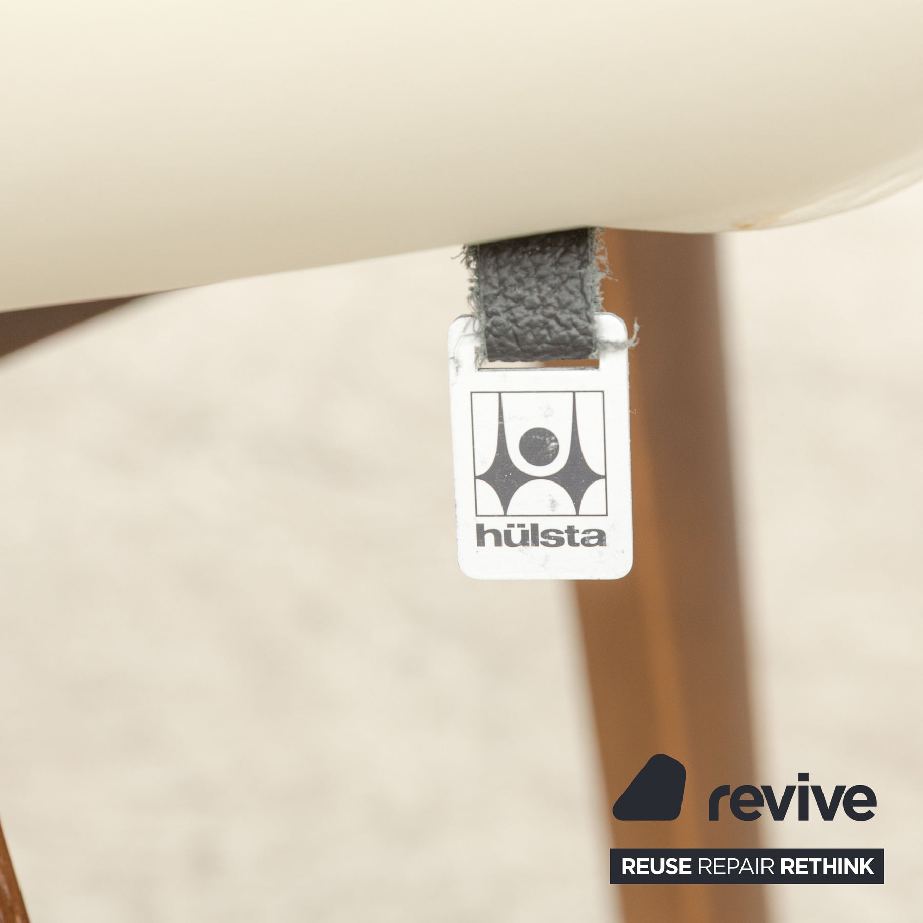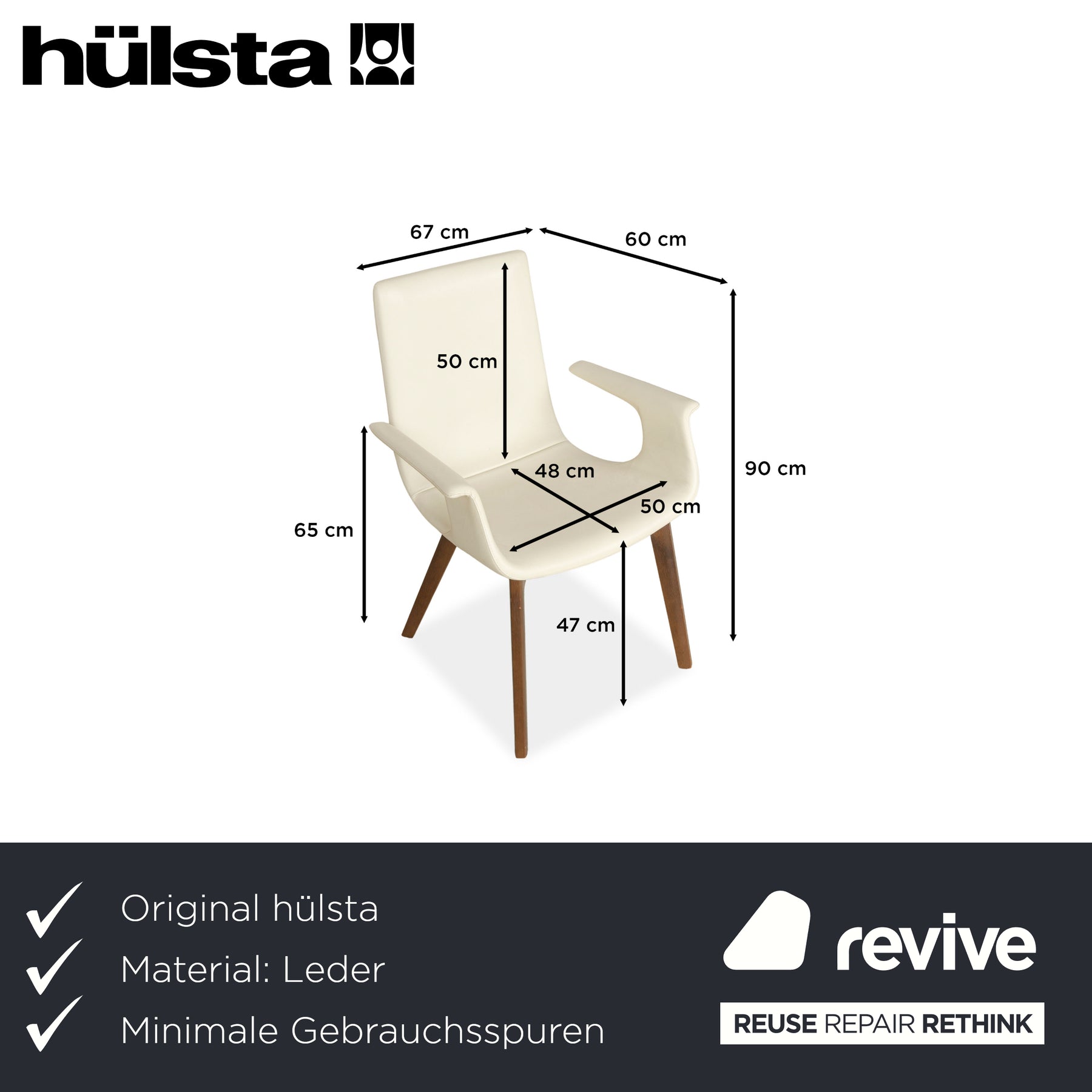 The D27 chair set from Hülsta consists of a total of four chairs, which are covered in cream-colored genuine leather and stand on brown wooden legs.