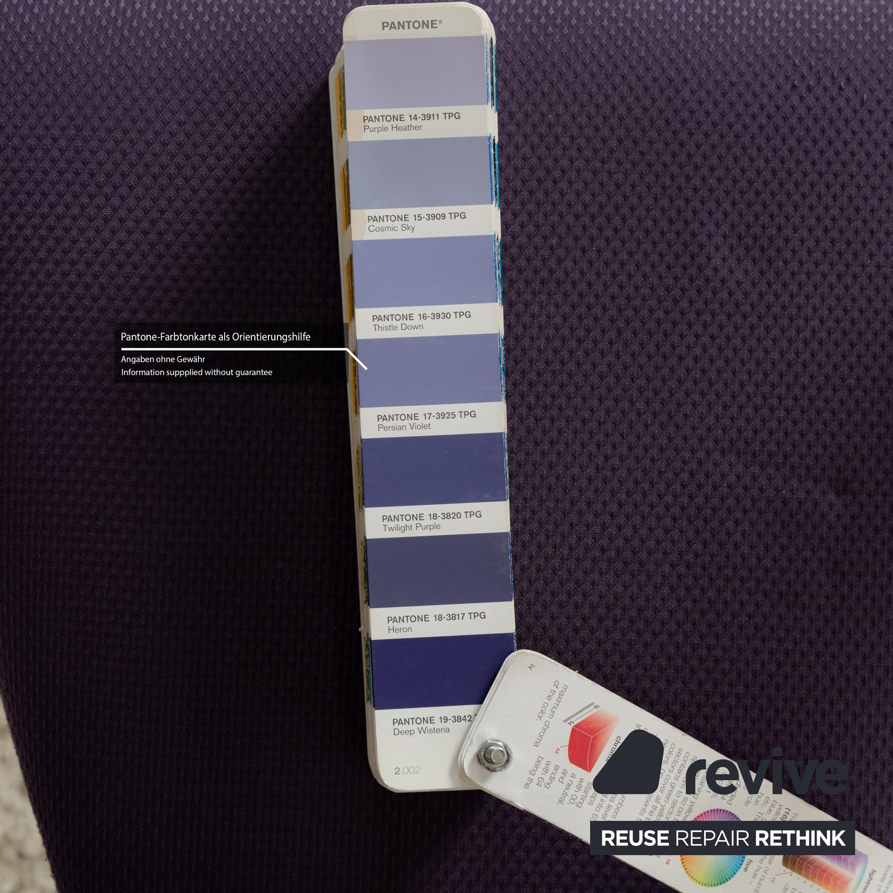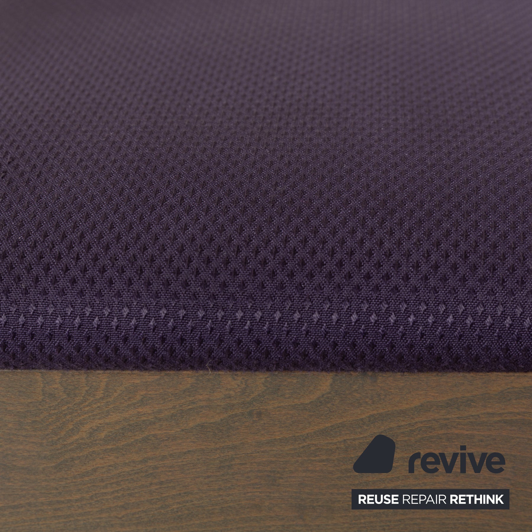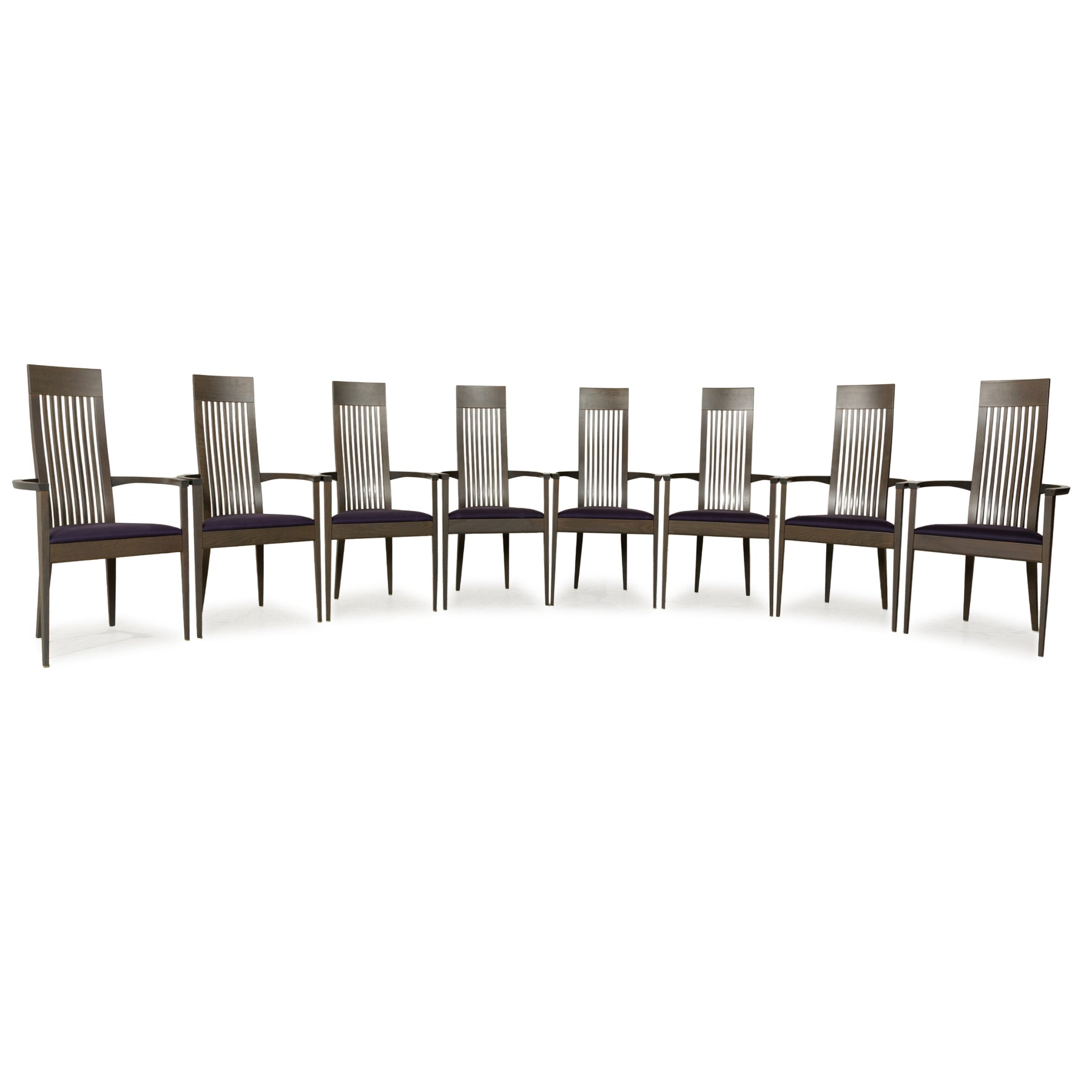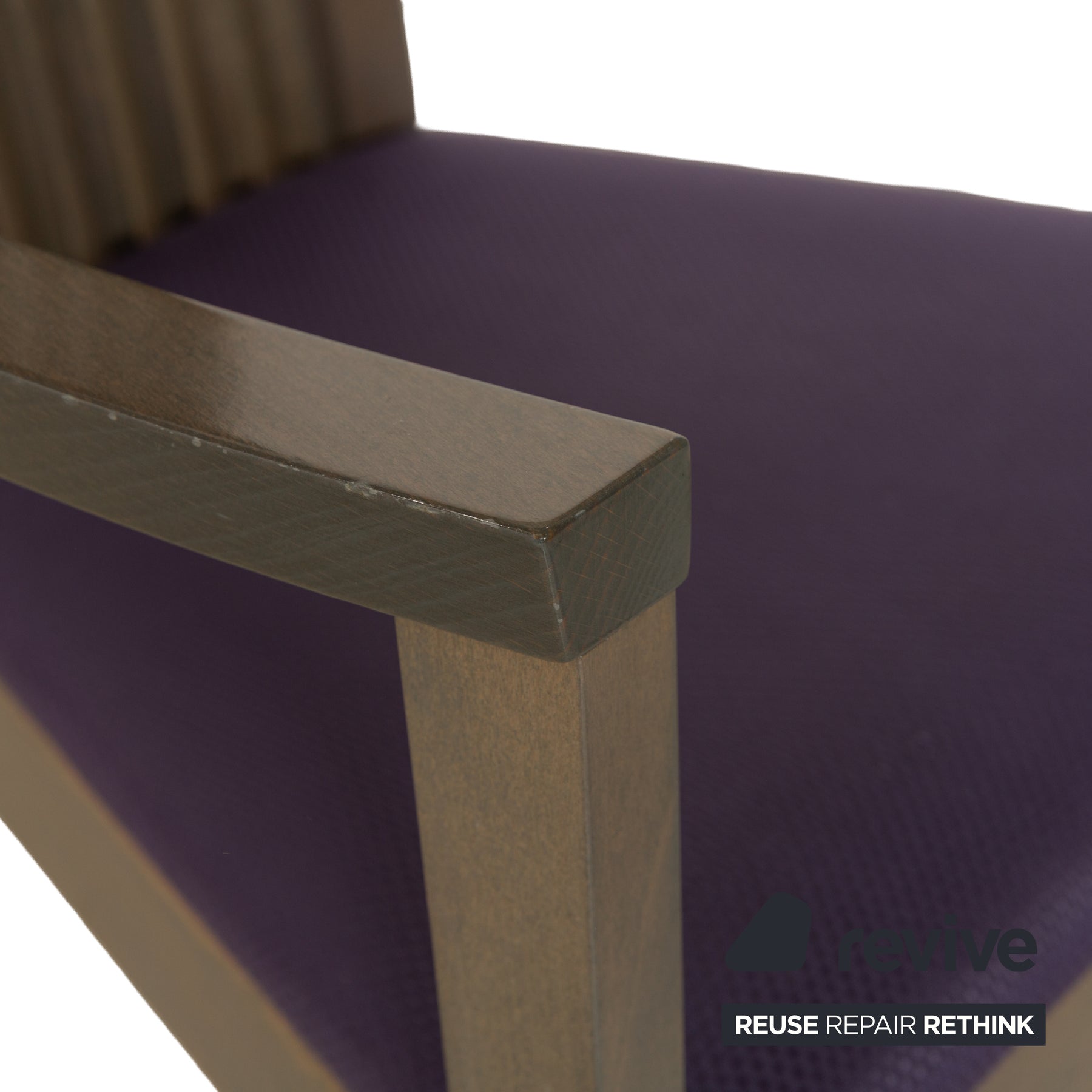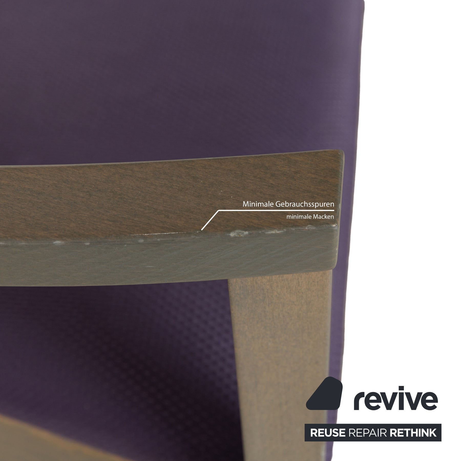 The TONON chair set, consisting of six identical models, is made of gray-brown wood. The high backrests are visually broken up by the slats, lending the chairs a sense of lightness with their geometric design. The seats are upholstered in a purple fabric.
