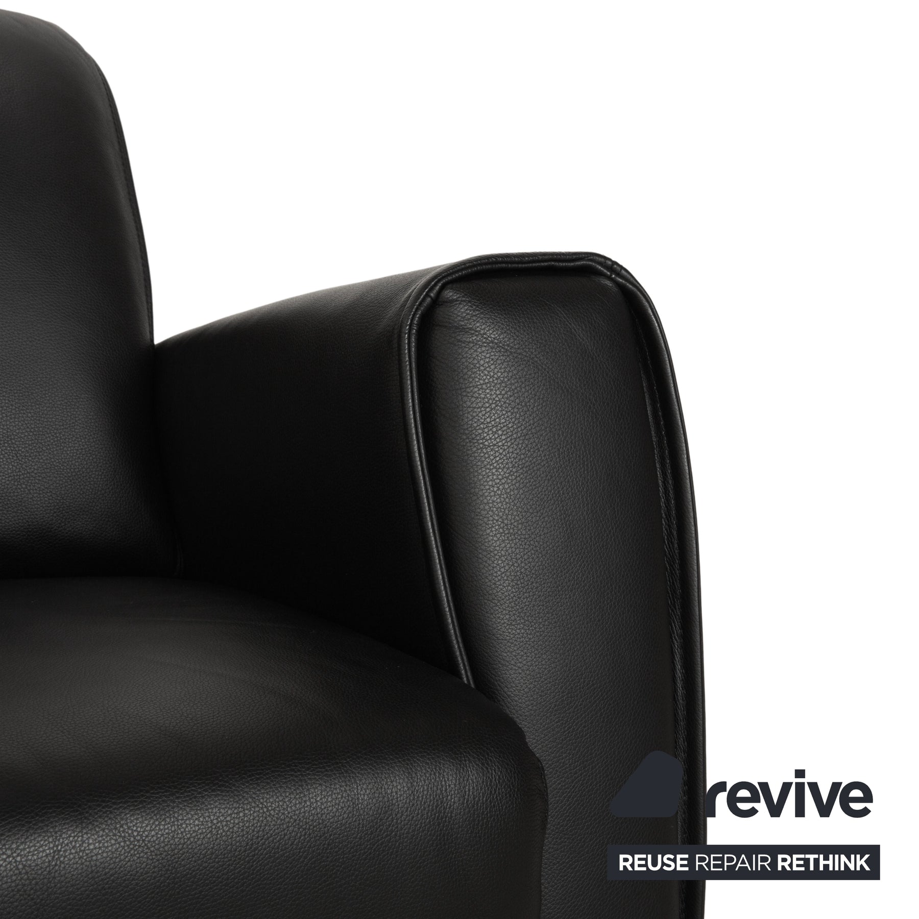 The sofa by Ewald Schillig is upholstered in black leather and stands on simple, black legs. The two-seater is characterized by its classic, minimalist geometric design, making it easy to combine with other furnishings. High backrests and wide armrests promise great comfort.