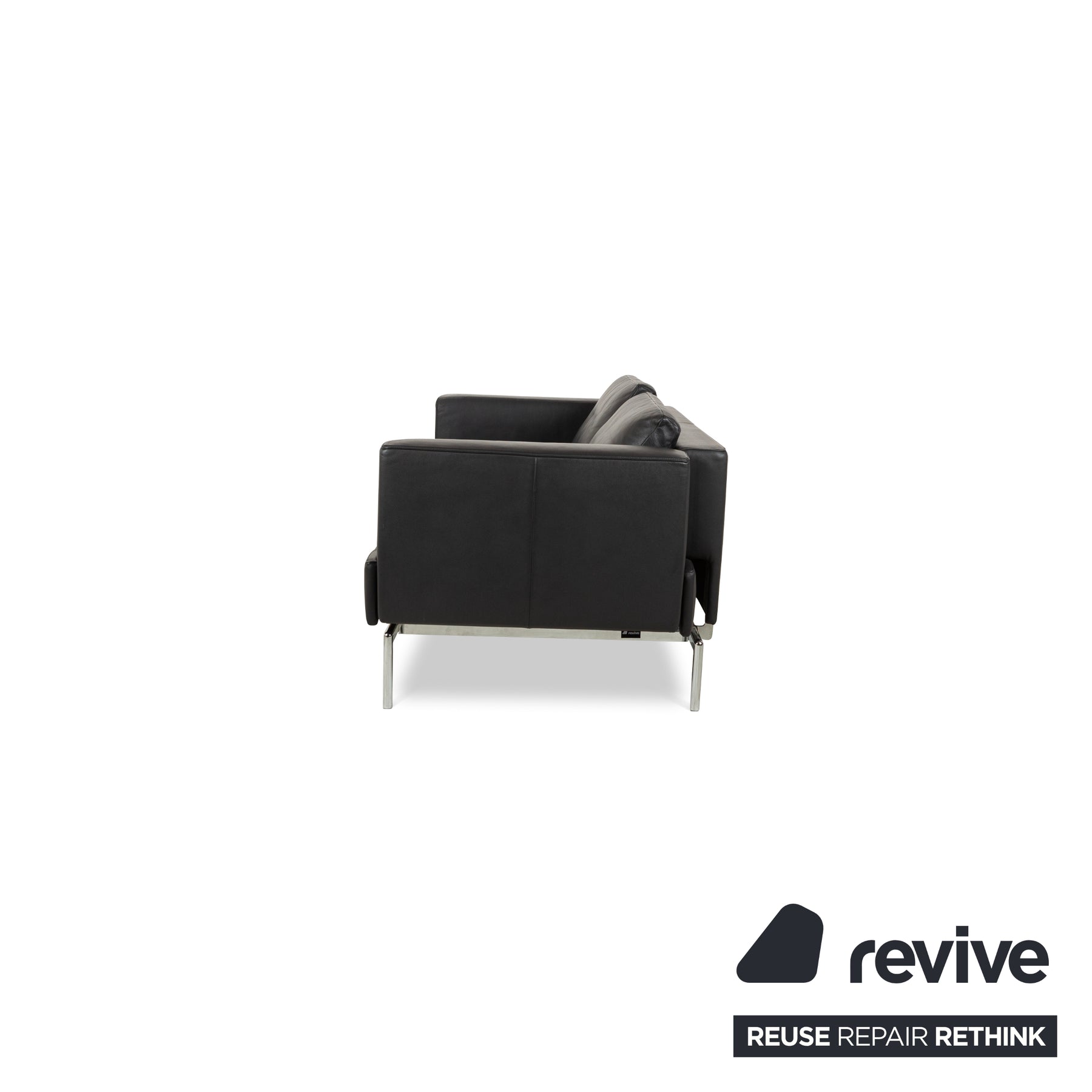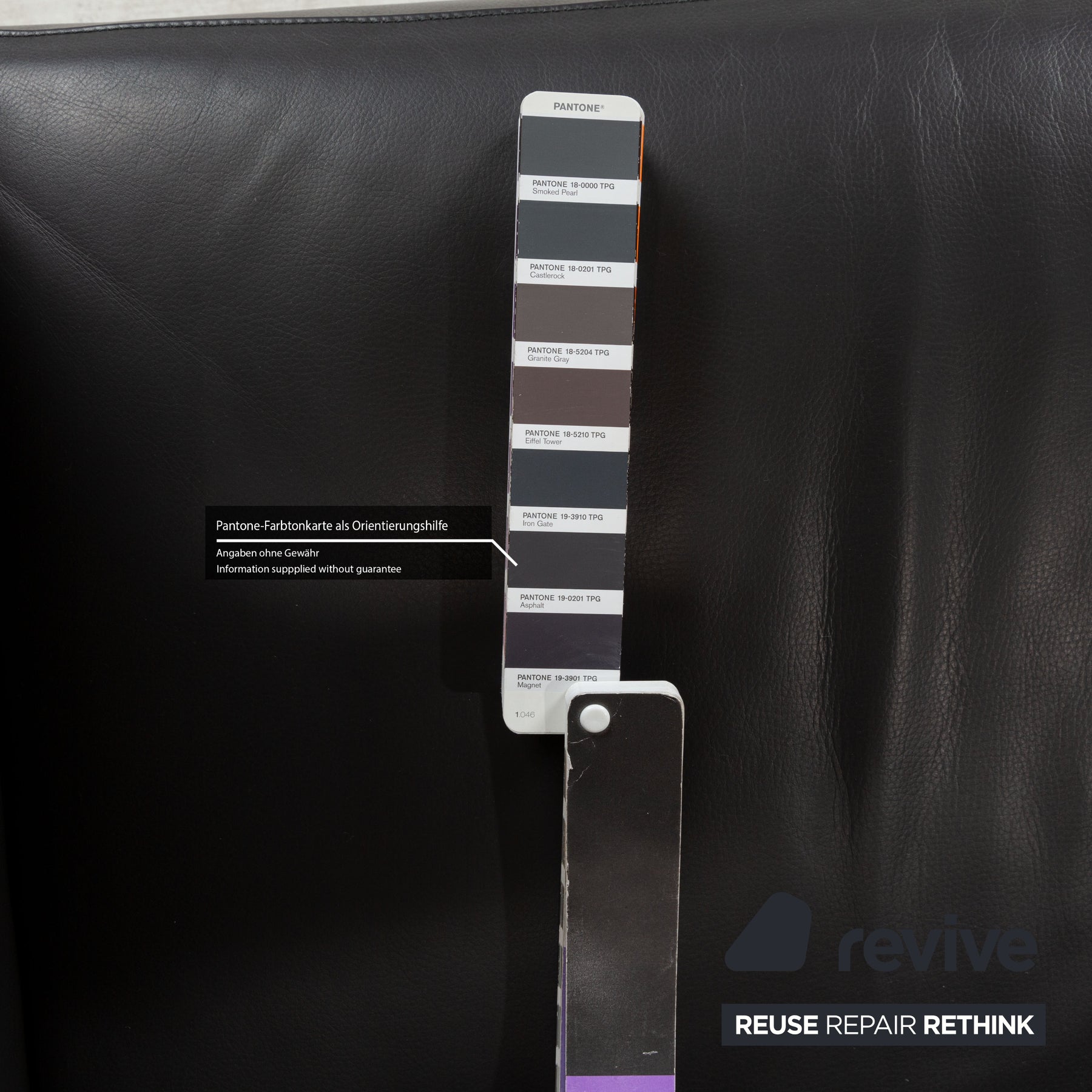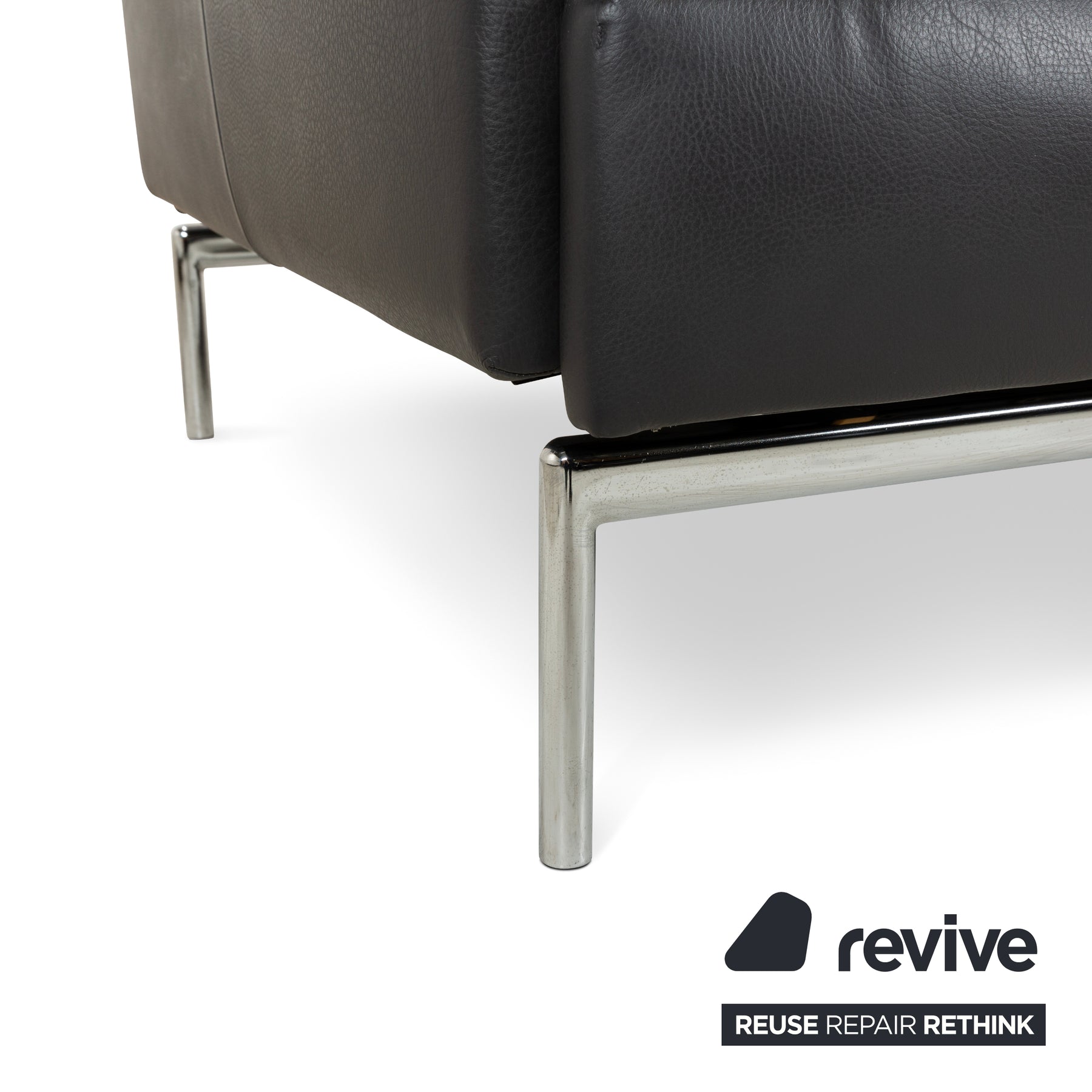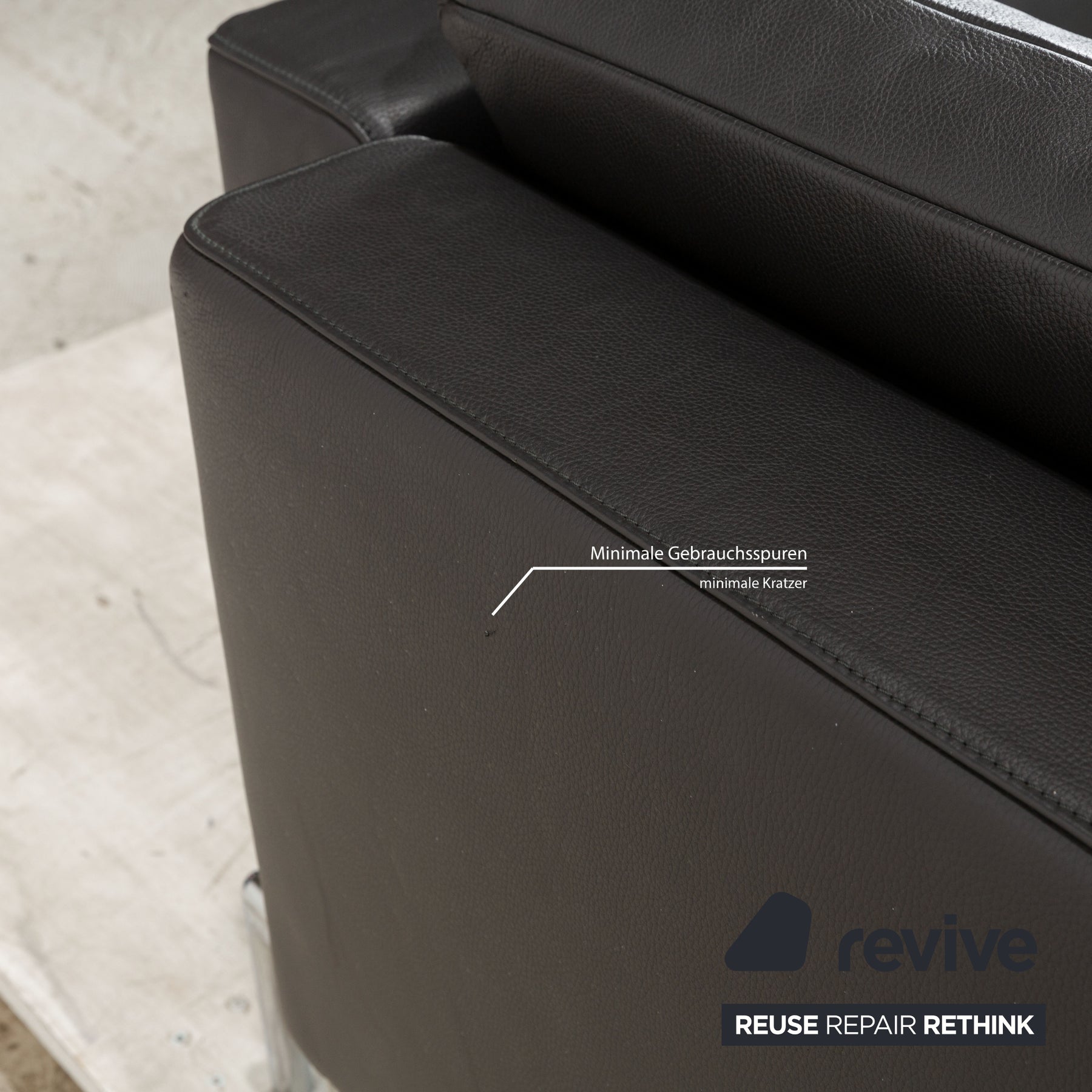 The Sofs Easy FSM by FSM is covered in dark grey genuine leather and stands on a slim, elegant metal frame in silver. The three-seater has a seat that is adjustable in depth for increased comfort. This sofa is characterized by a classic, easy-to-combine design.