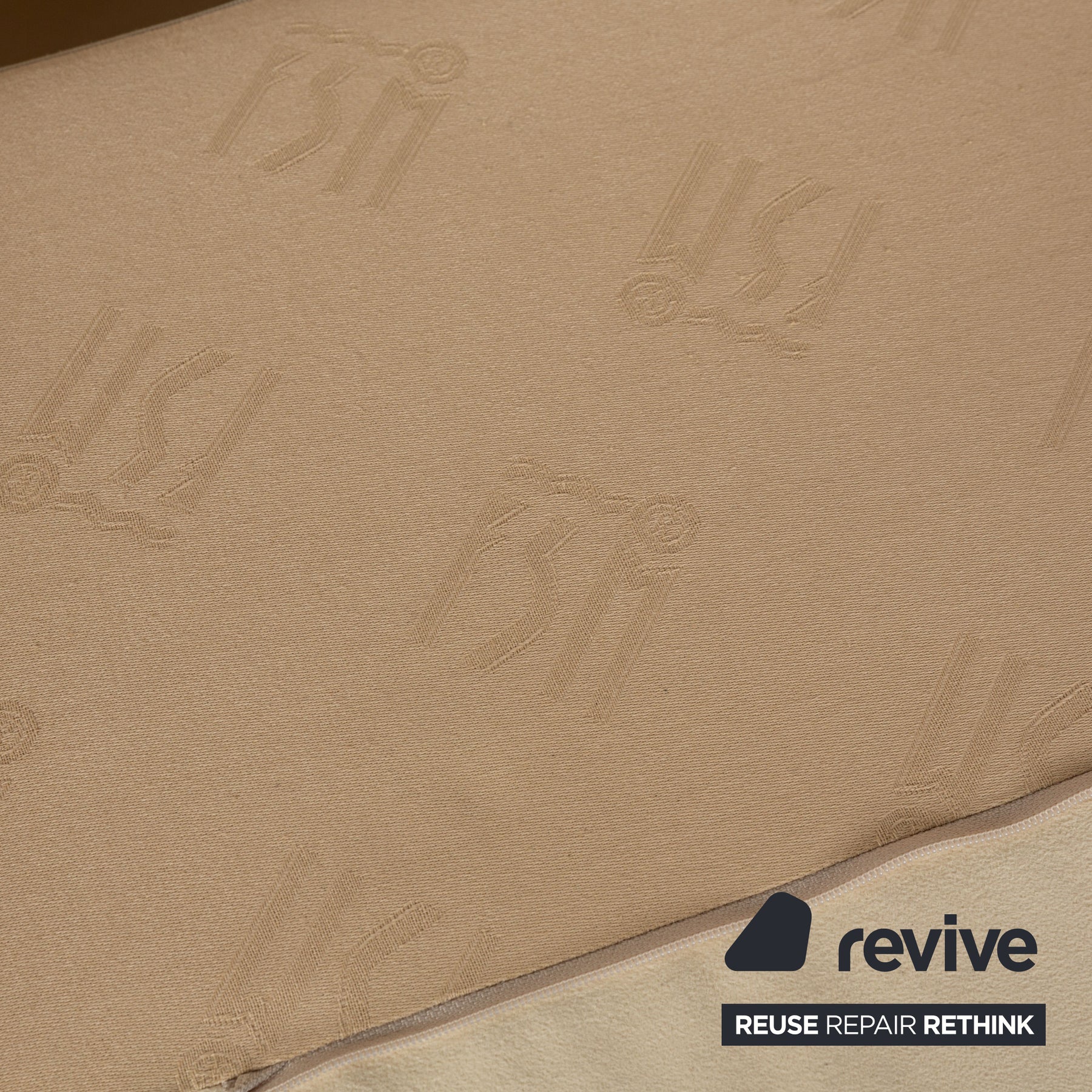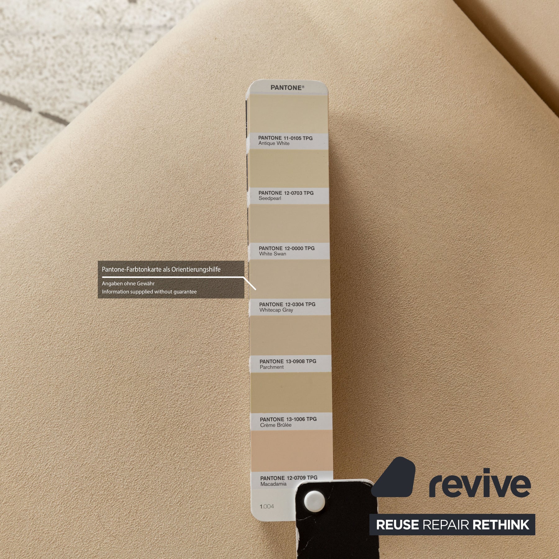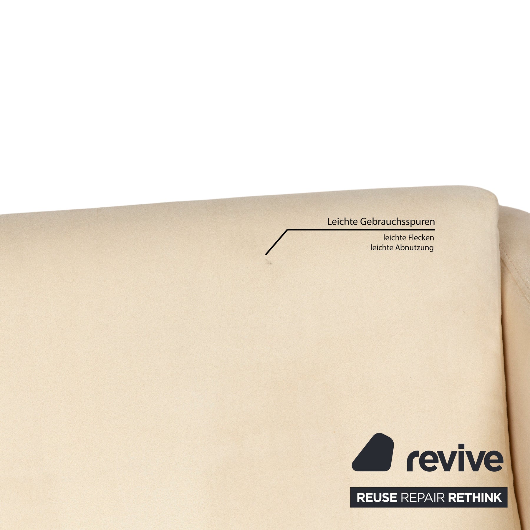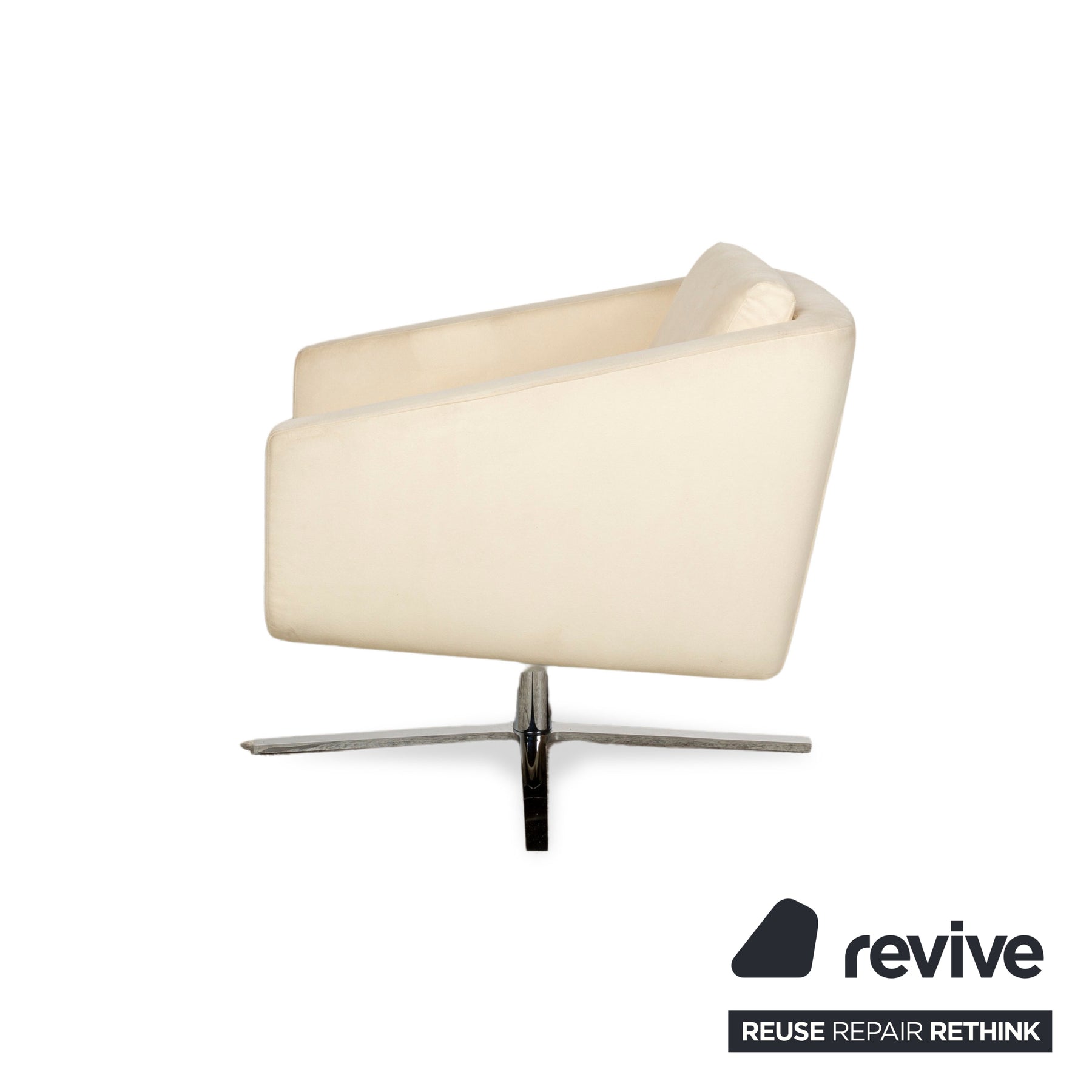 The Pavlo armchair by FSM is characterized by its linear, almost cubist design. Clear edges and surfaces form the body of the armchair, which is covered in cream-colored fabric and stands on a four-legged metal base.