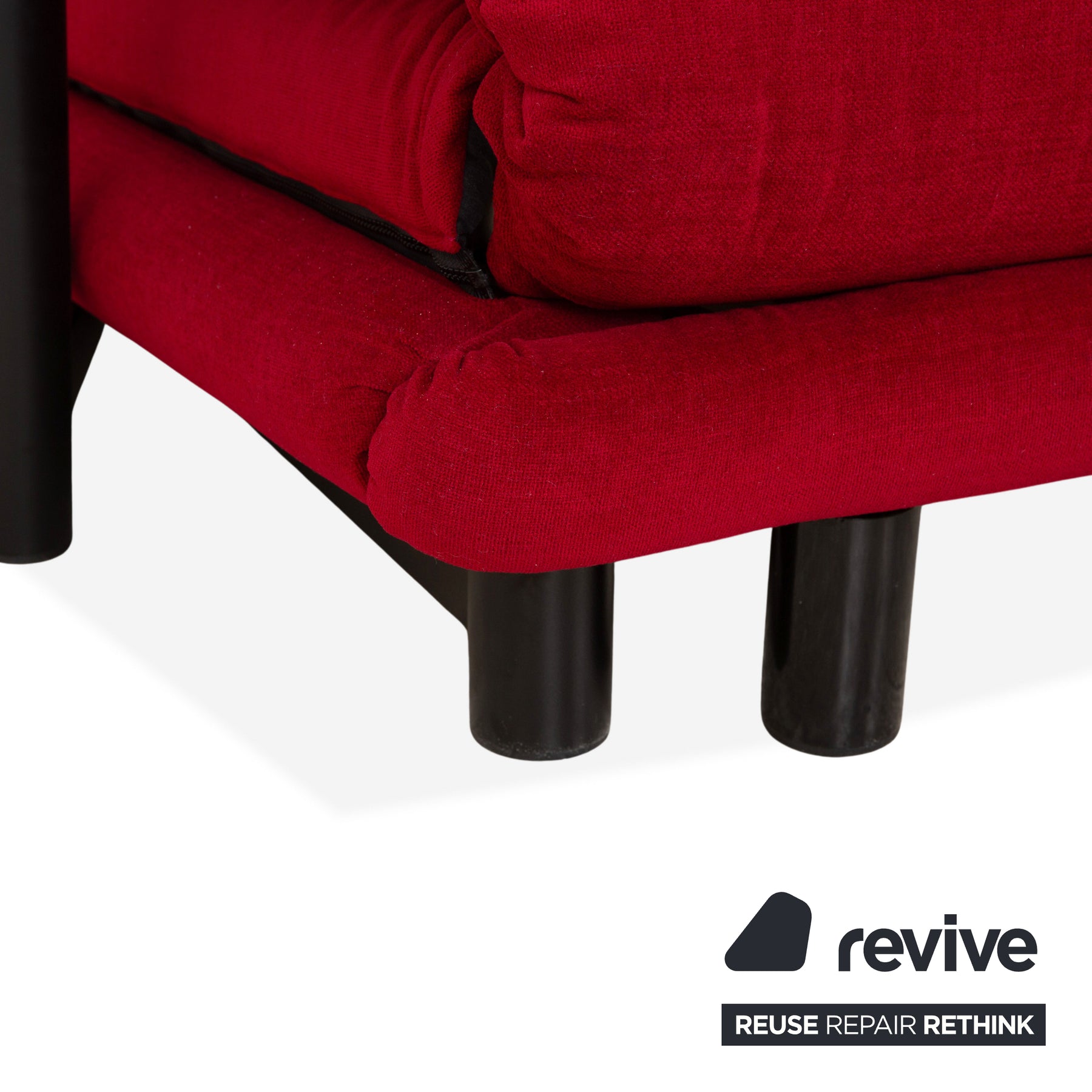 The Ligne Roset Multy in vibrant red with a black lacquered frame combines modern functionality with a soft, inviting look. The combination of the fabric-covered body in MALOU 138, the two contrasting cushions in MALOU 106, and the armrests, also reupholstered in MALOU 138, creates a harmonious yet lively overall impression. The generous padding is comfortable and relaxing, while the clean lines and dark base give the three-seater a modern structure. A sofa with character that elegantly unites comfort and timeless design.