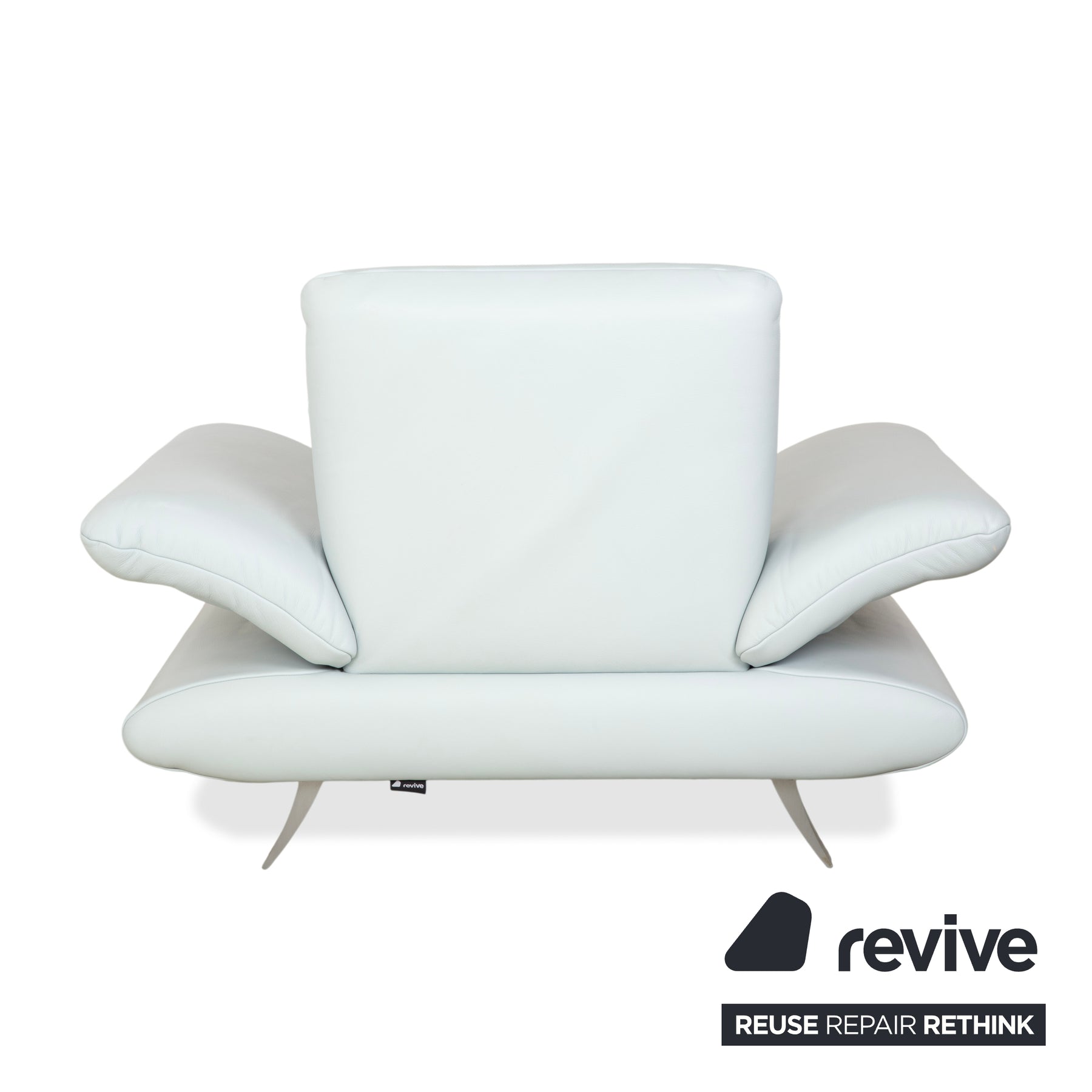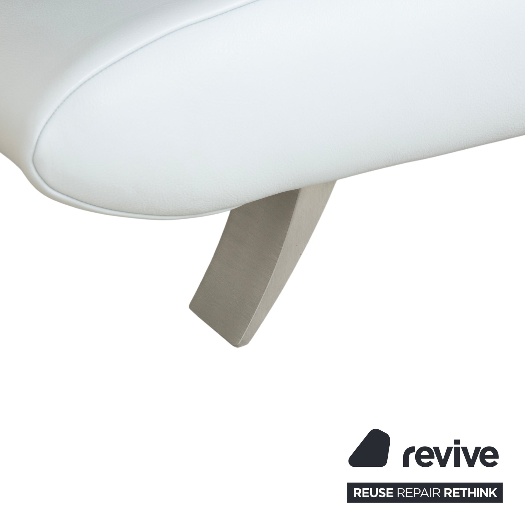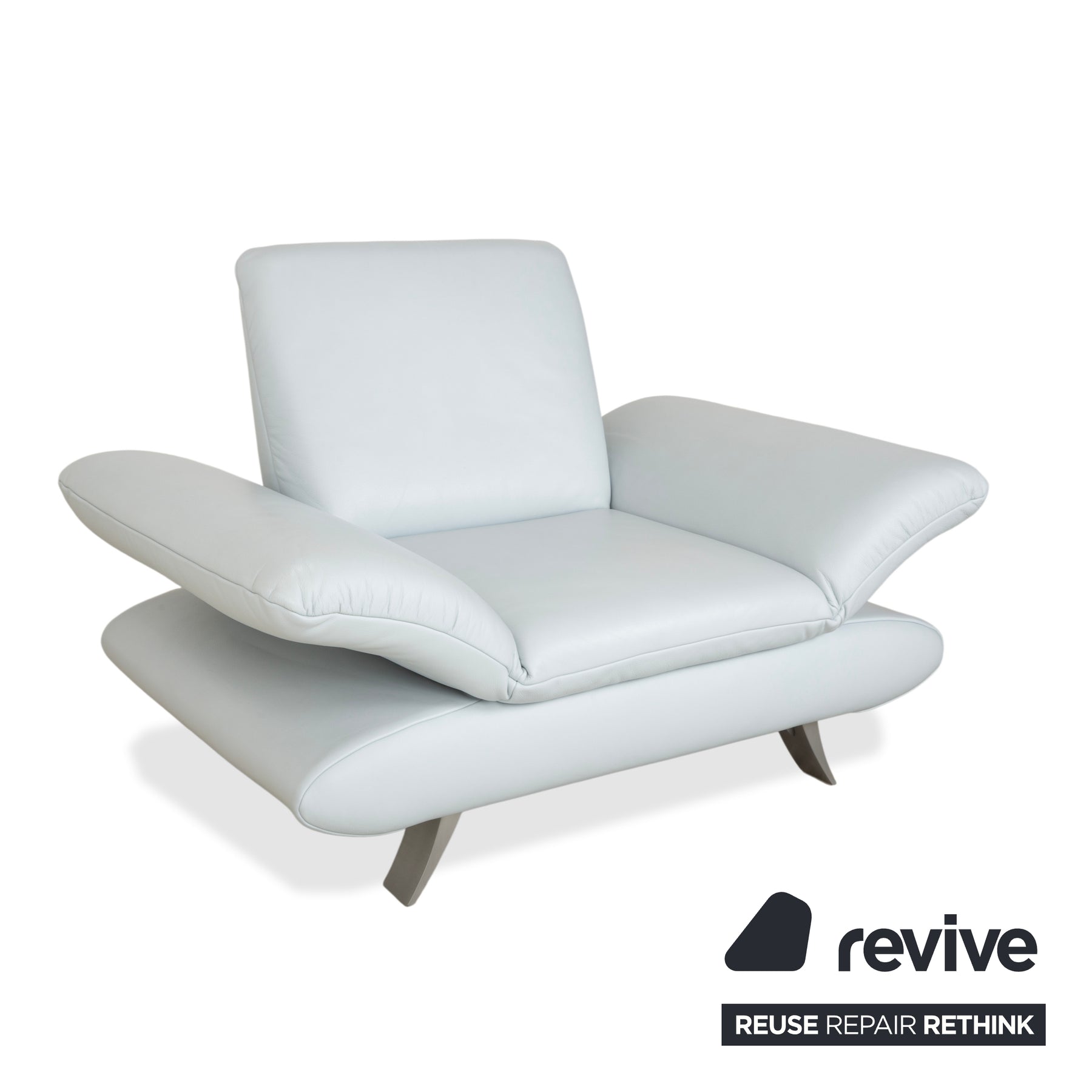 Thanks to their manual function, these generously sized armrests are adjustable. In the picture, they are positioned flat, visually widening the seat, but they can usually be folded up to provide comfortable support. The structure is supported by elegantly curved metal runners with a stainless steel finish, which emphasize the floating appearance.