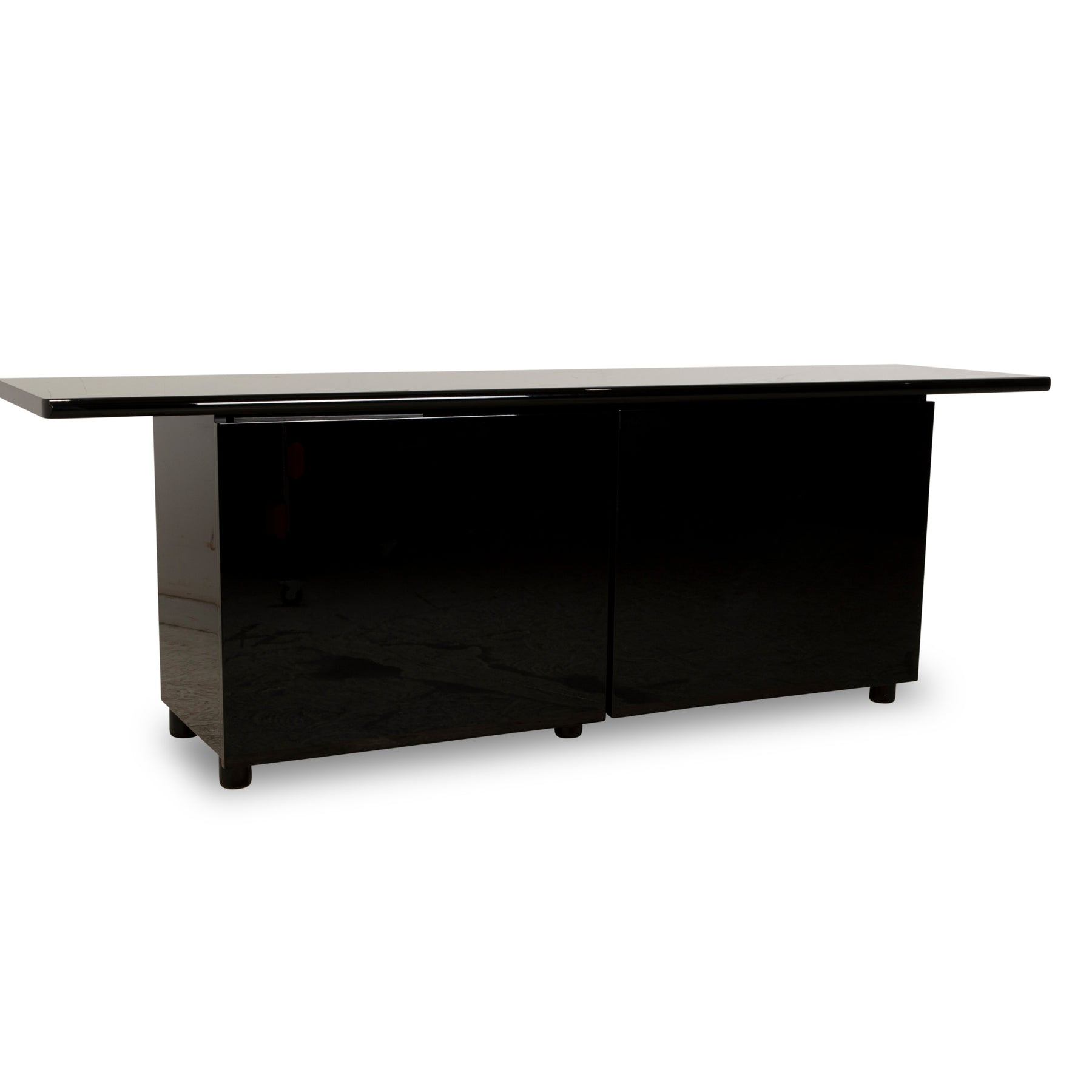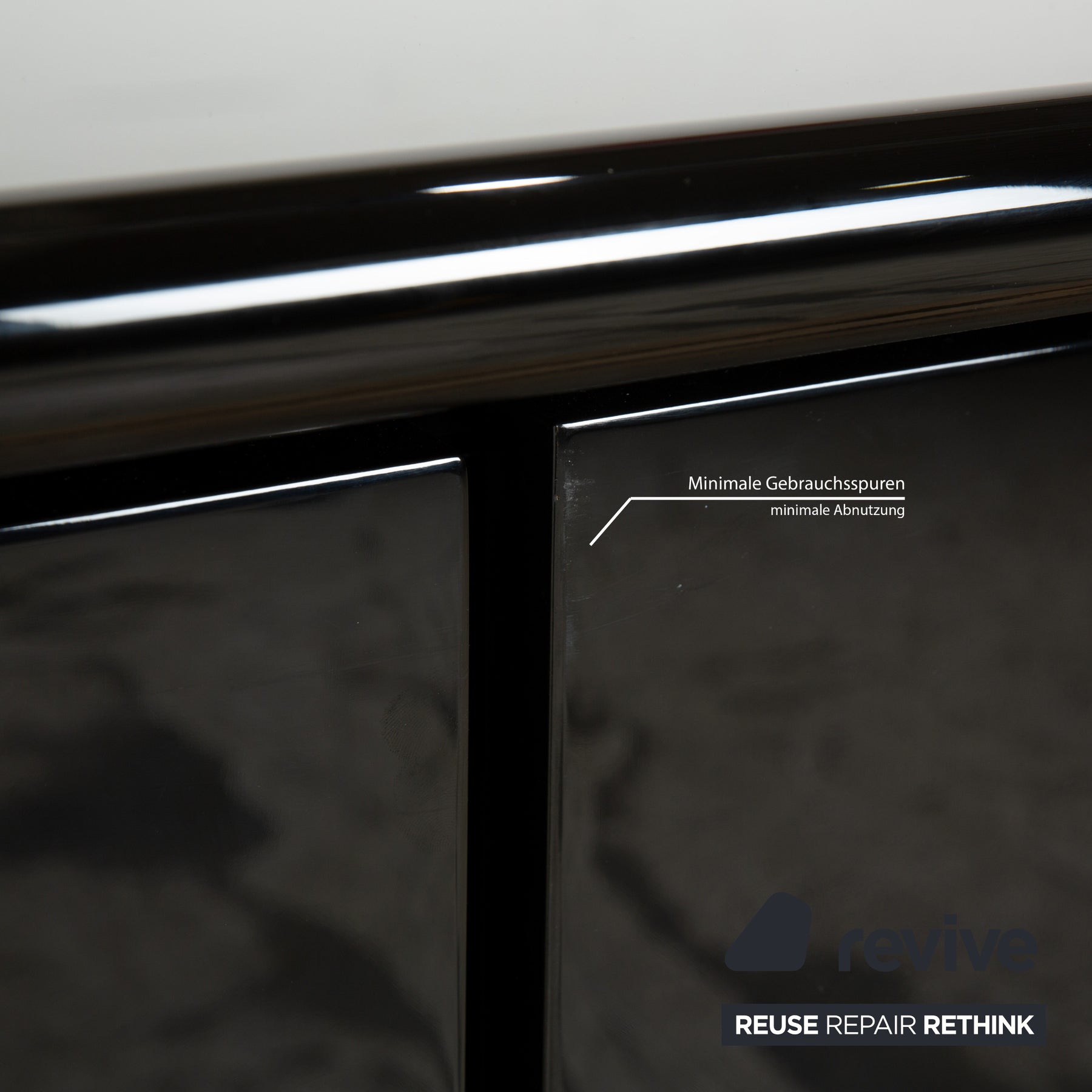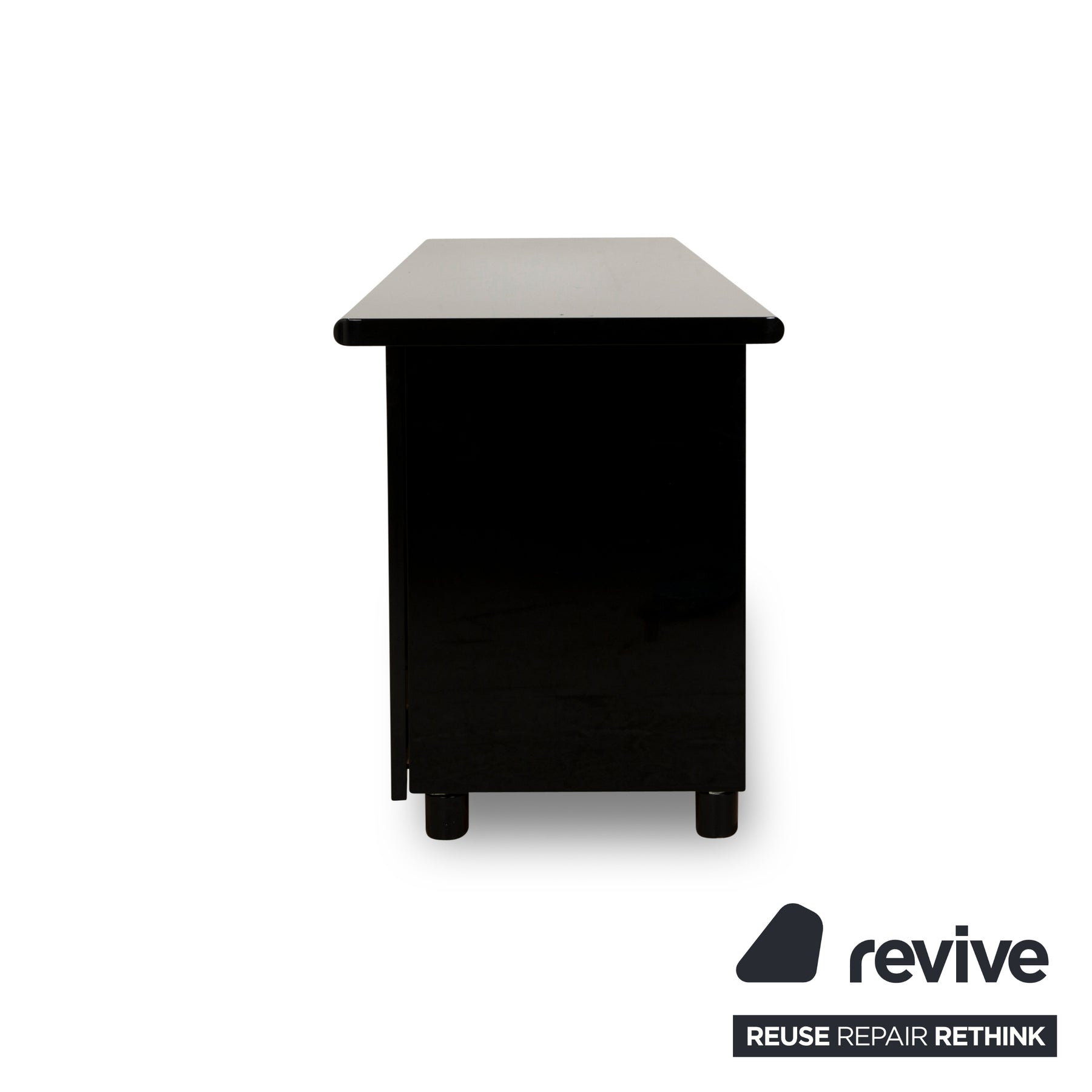 The sideboard by Verardo is made of black wood with a high-gloss finish and stands on low feet, so that it appears to rest slightly above the floor, which provides a successful contrast to the spacious and dominant design of the body.