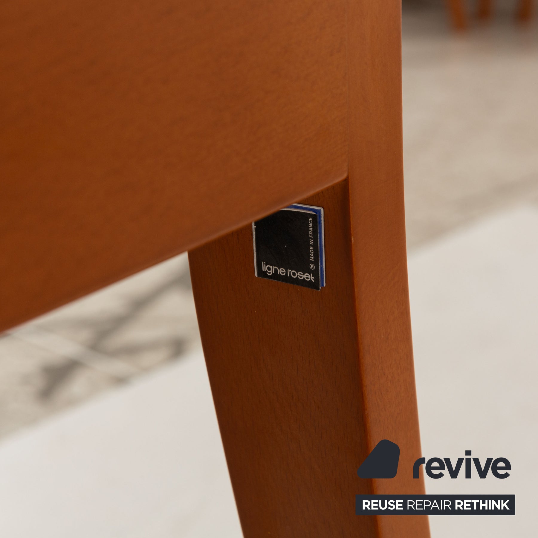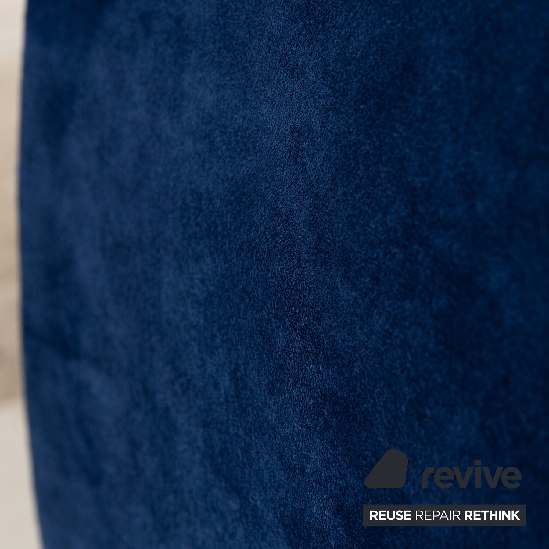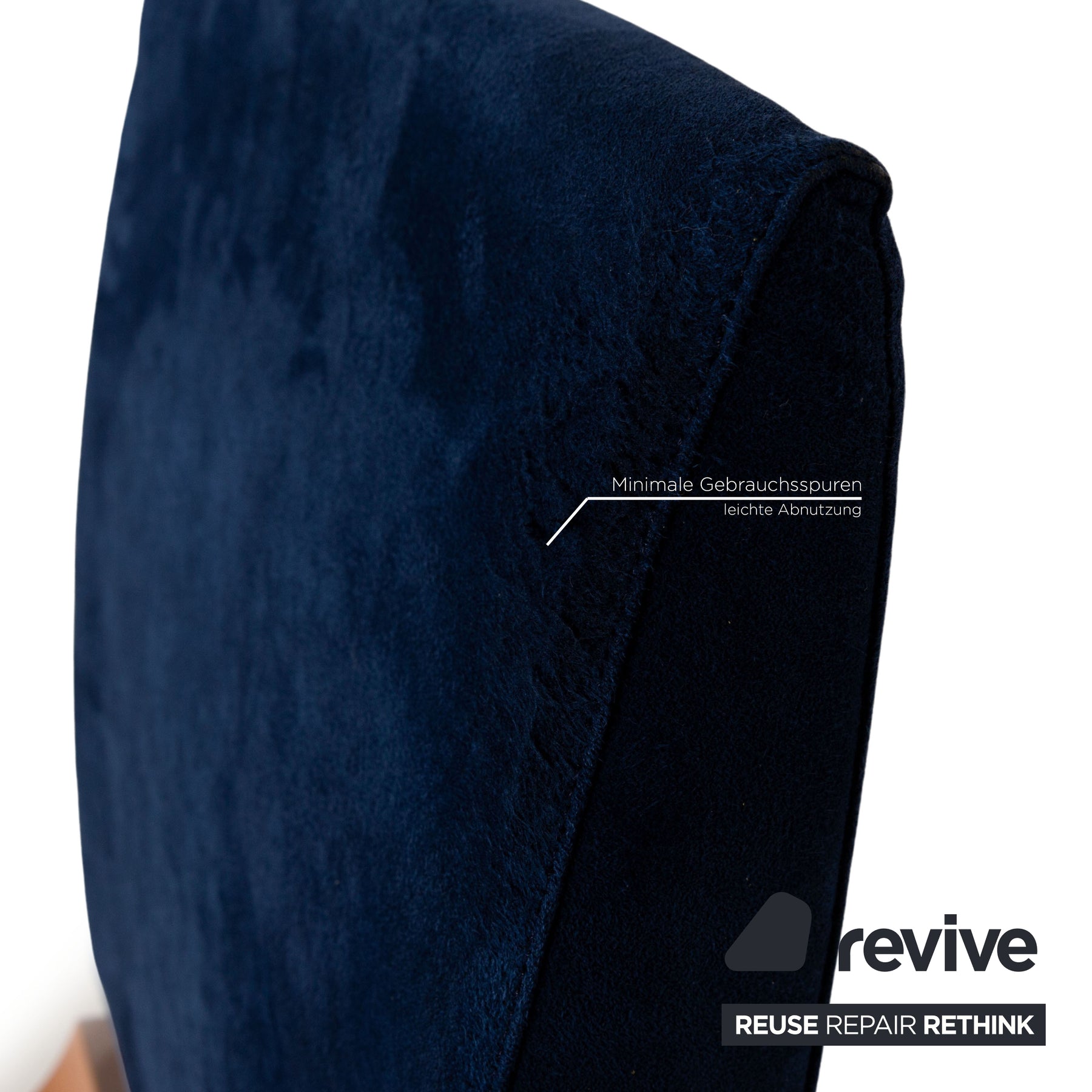 The Finn chair set from ligne roset is covered with a blue fabric and stands on a wooden frame.