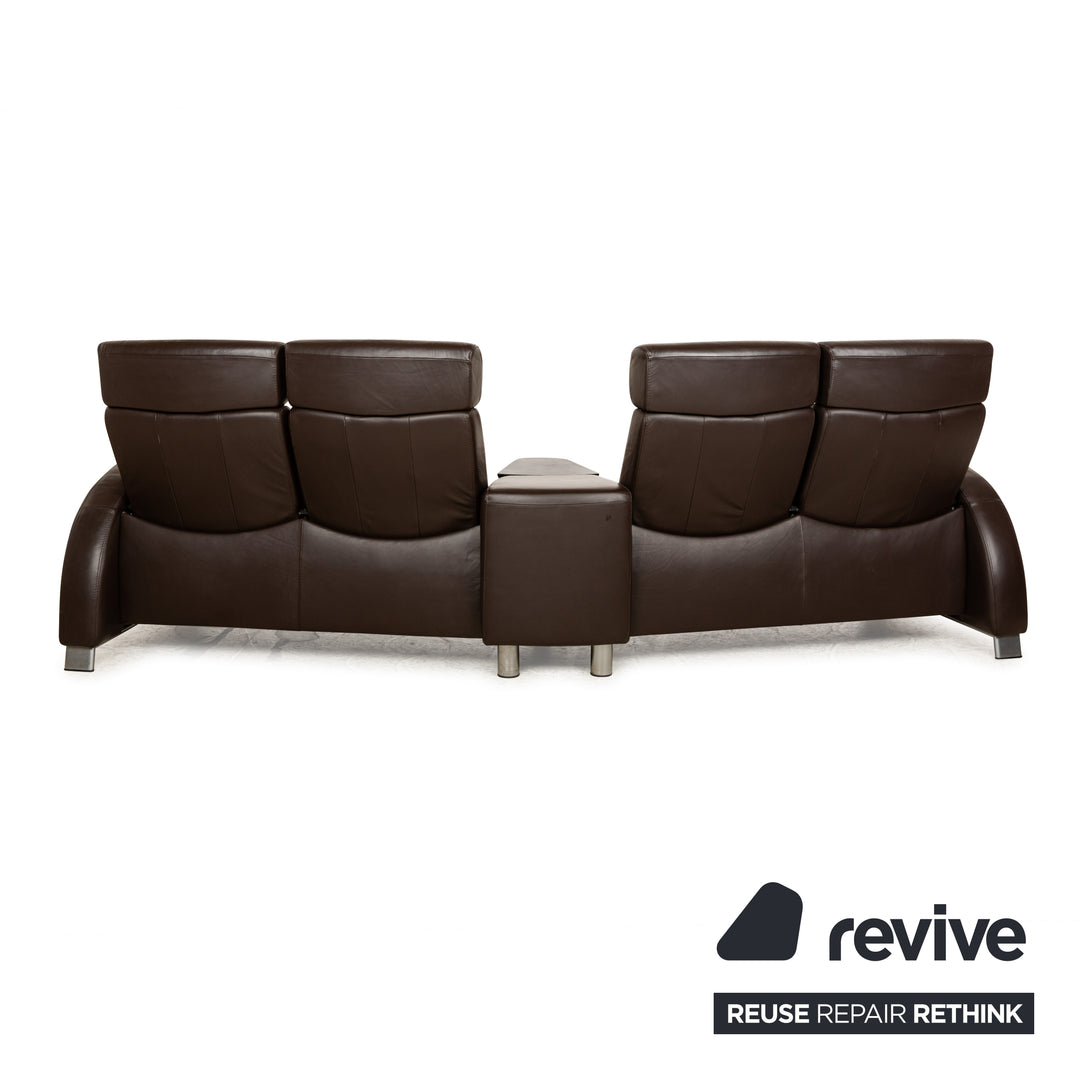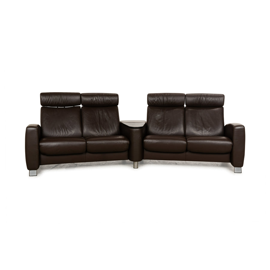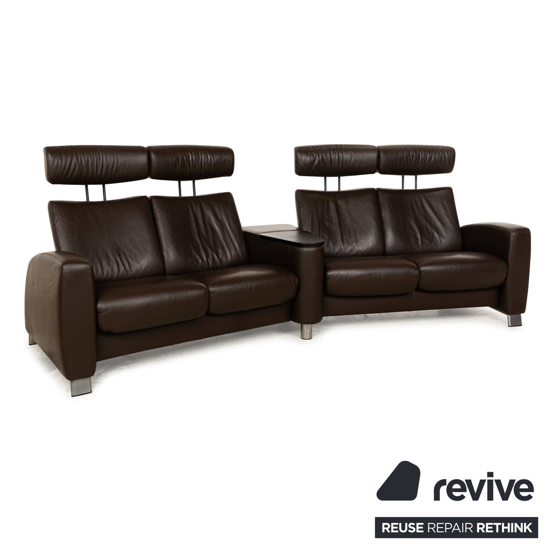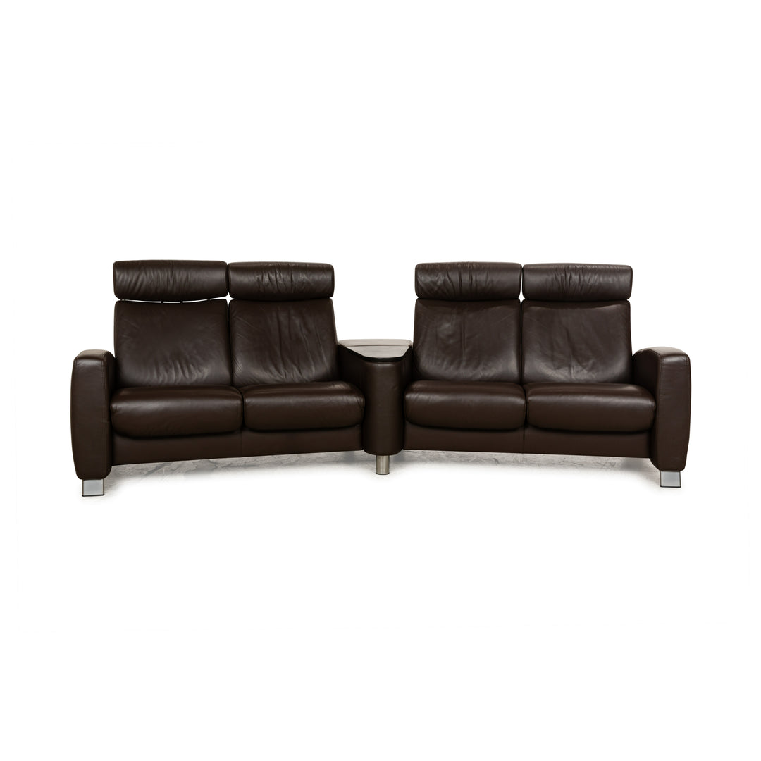 The Stressless Arion four-seater is upholstered in dark brown leather and stands on flat metal legs. It features adjustable headrests, a comfortable wooden shelf, and the manufacturer's signature design. Each seat can be individually adjusted to a relaxing position.