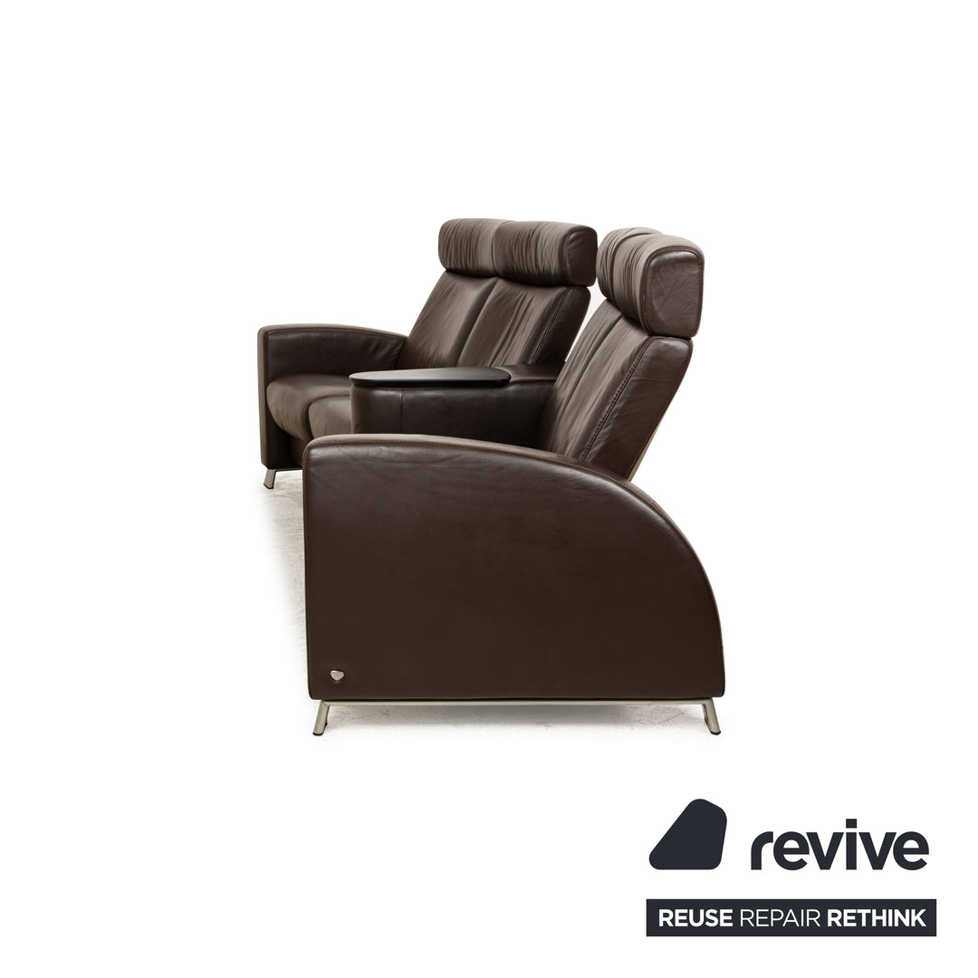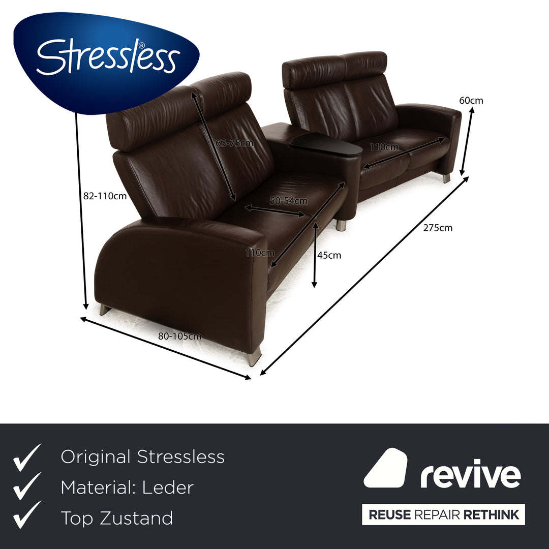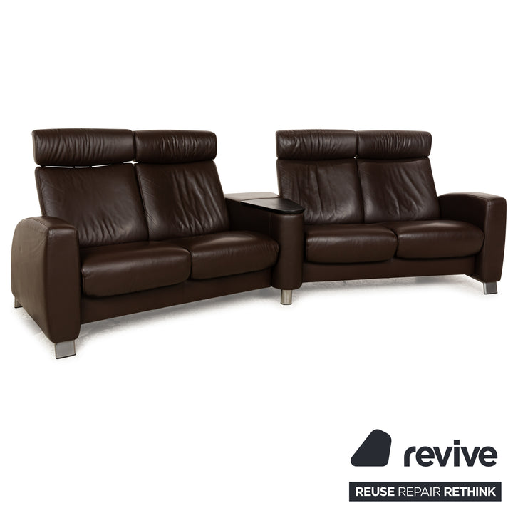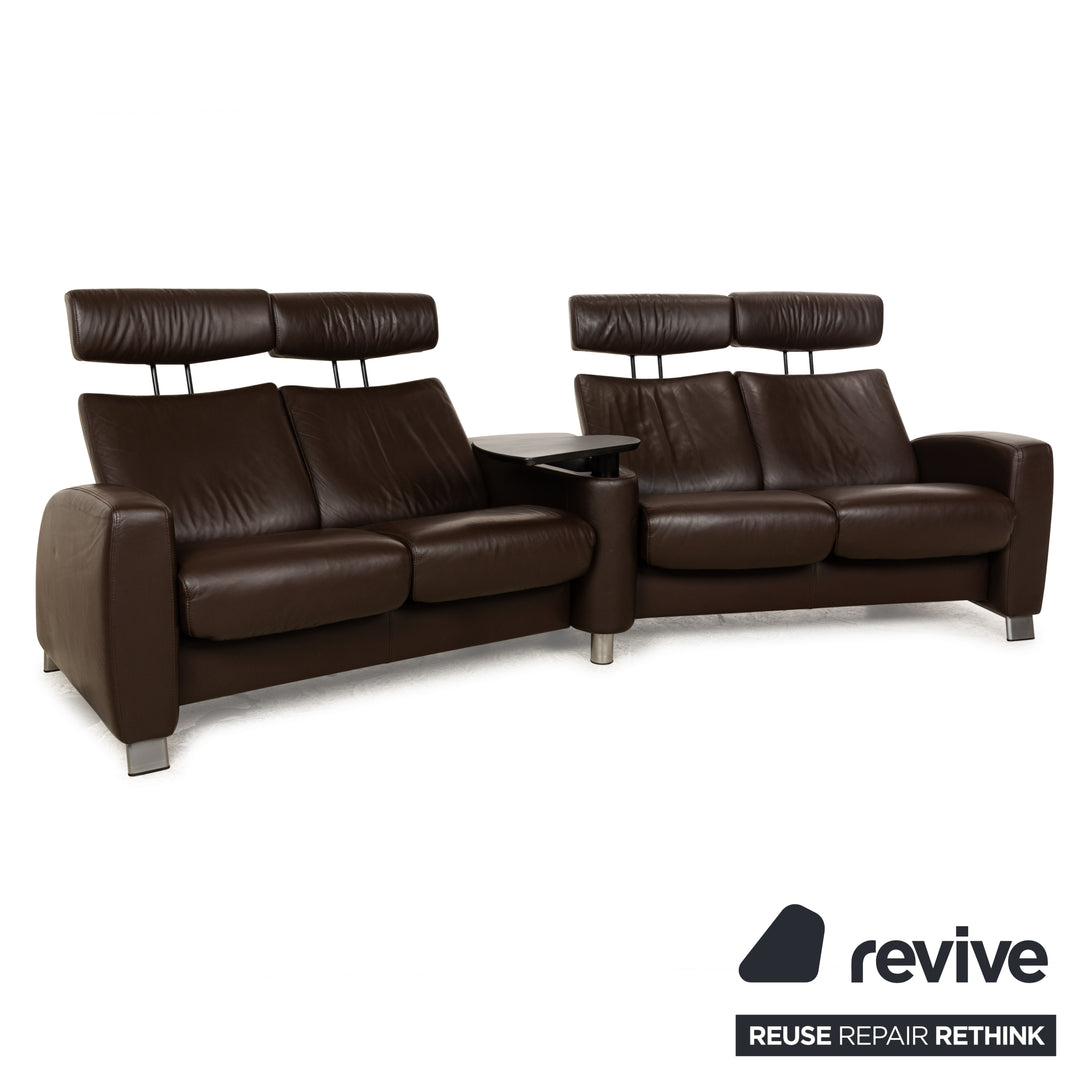 The Stressless Arion four-seater is upholstered in dark brown leather and stands on flat metal legs. It features adjustable headrests, a comfortable wooden shelf, and the manufacturer's signature design. Each seat can be individually adjusted to a relaxing position.