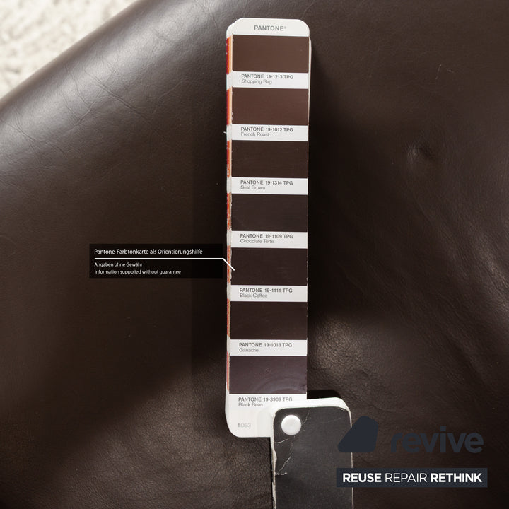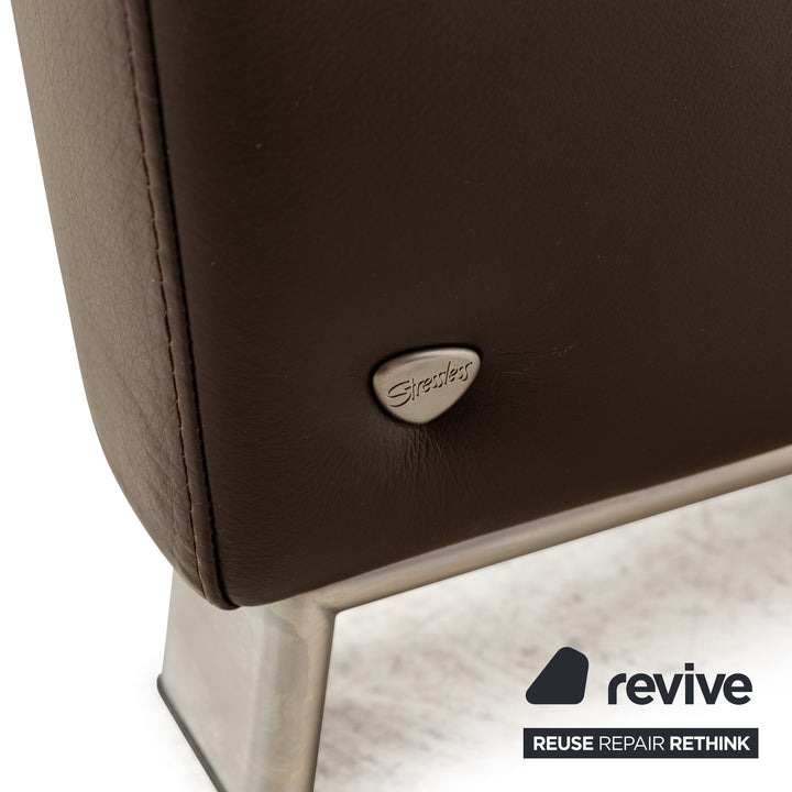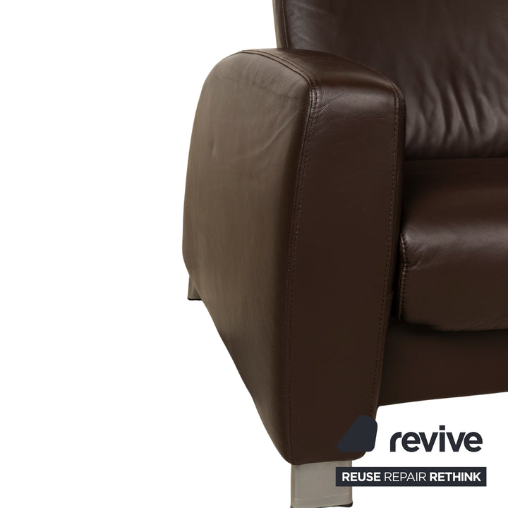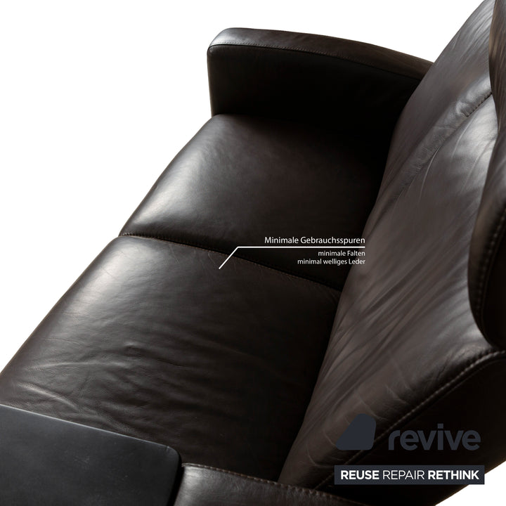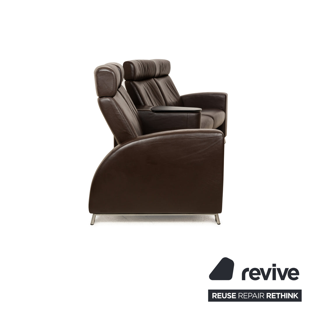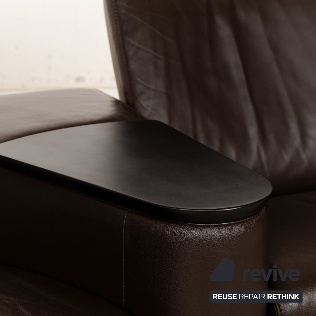 The Stressless Arion four-seater is upholstered in dark brown leather and stands on flat metal legs. It features adjustable headrests, a comfortable wooden shelf, and the manufacturer's signature design. Each seat can be individually adjusted to a relaxing position.