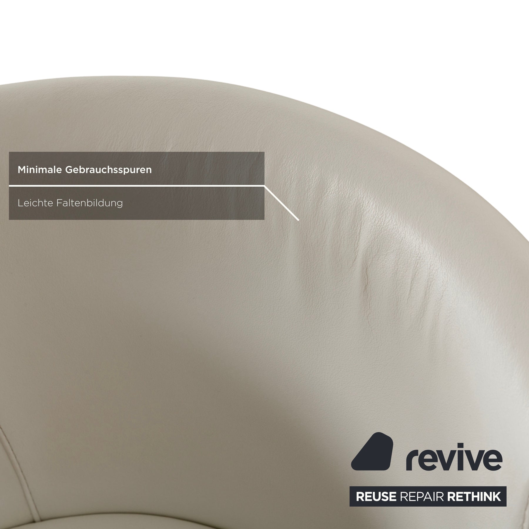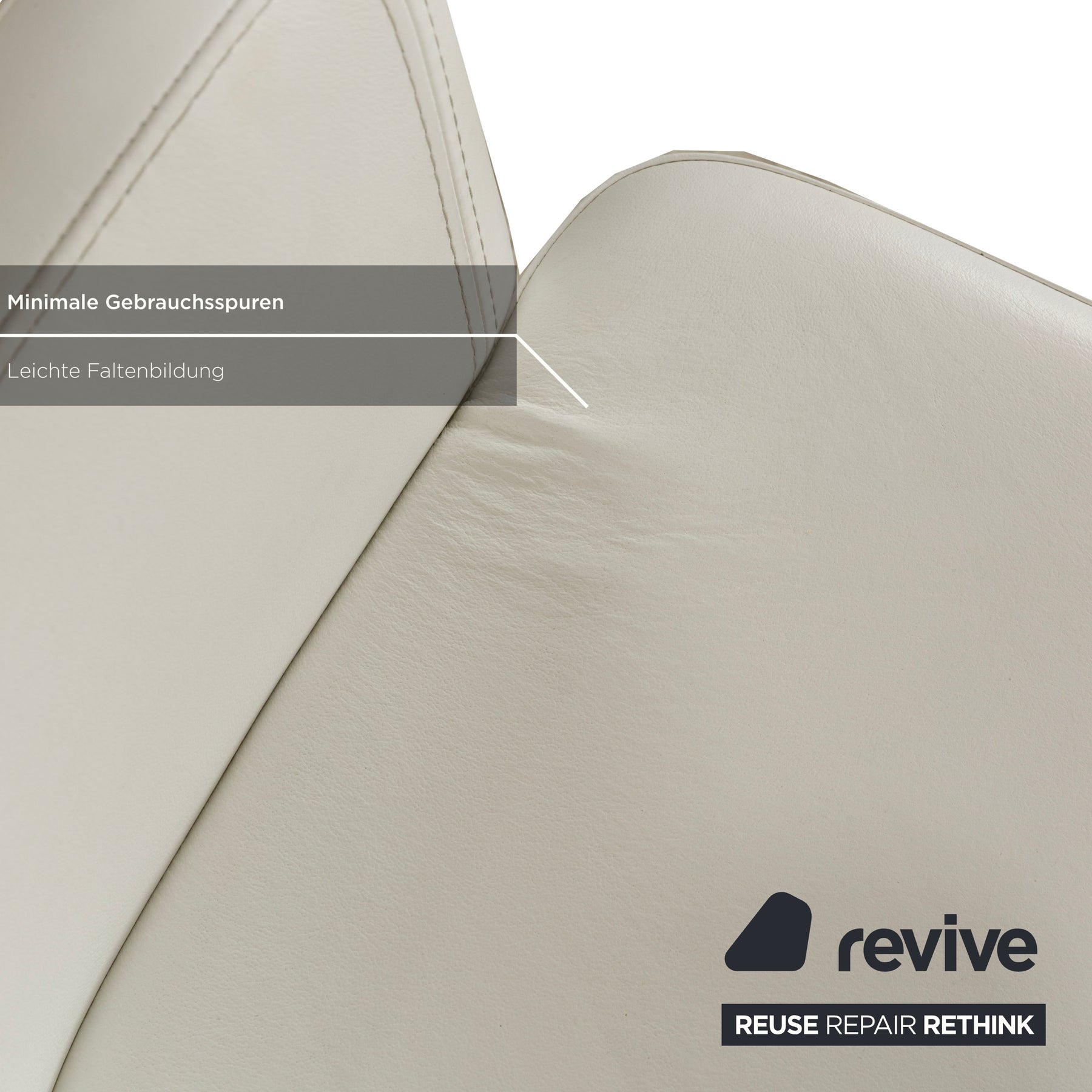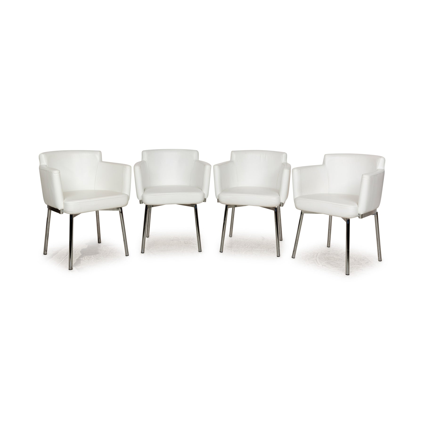 The chair set from La Nuova Casa is upholstered in cream-white leather and stands on slender metal legs. The set, consisting of four identical armchairs, impresses with its modern design, gently curved lines, and comfortable seating.