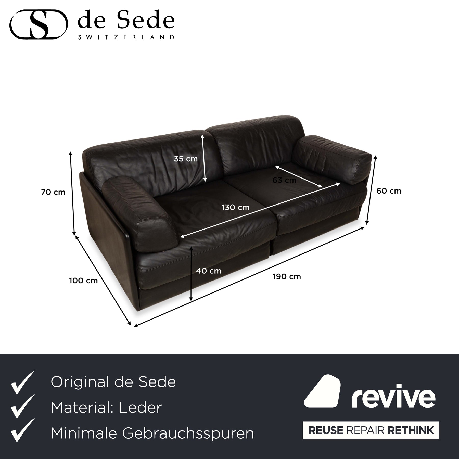 De Sede DS-76 Leather Two Seater Black Sofa Couch manual function