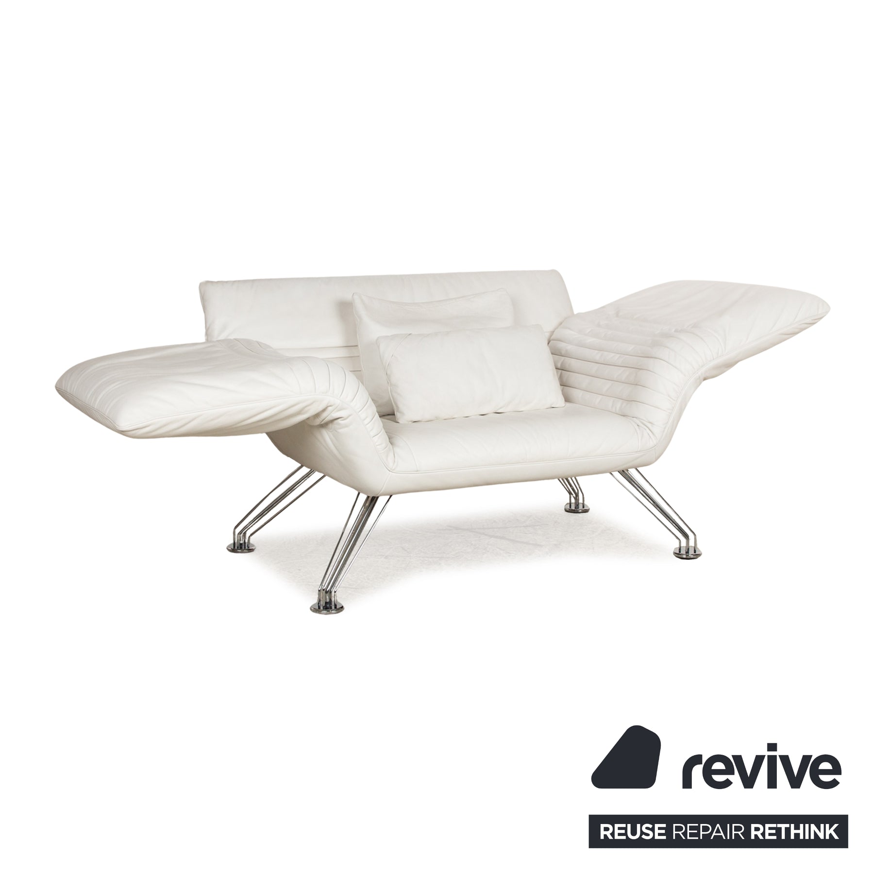The DS 142 Wing lounger by de Sede is covered in white genuine leather and stands on silver metal feet. It is characterized by its practical flexibility and its bright, stylish design.