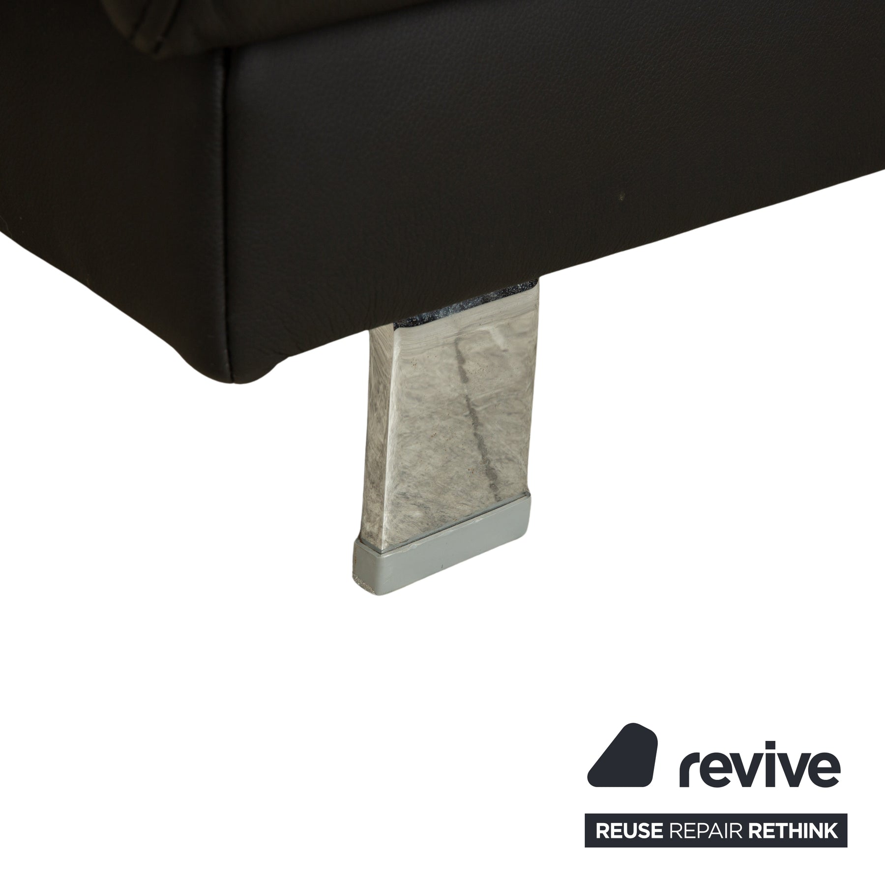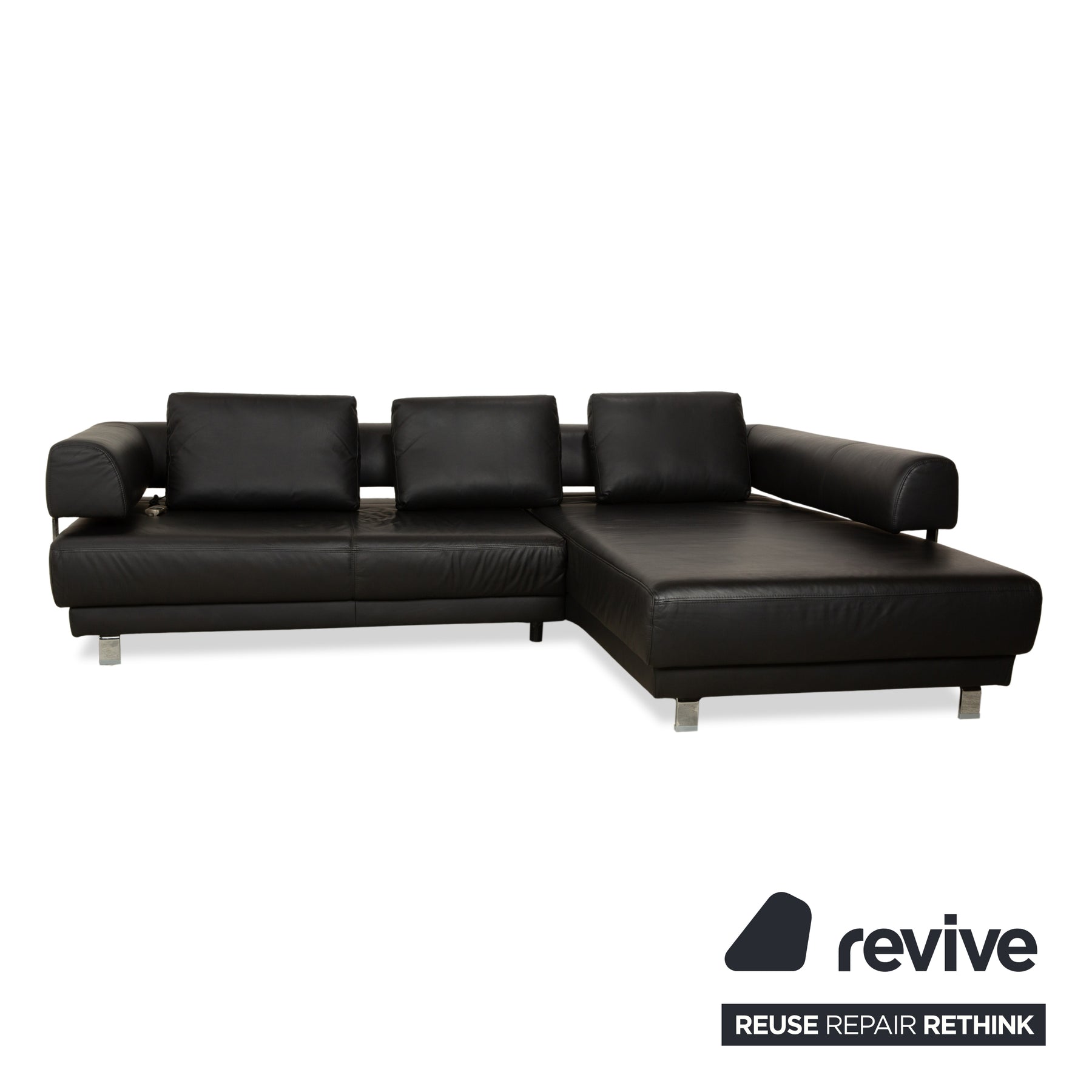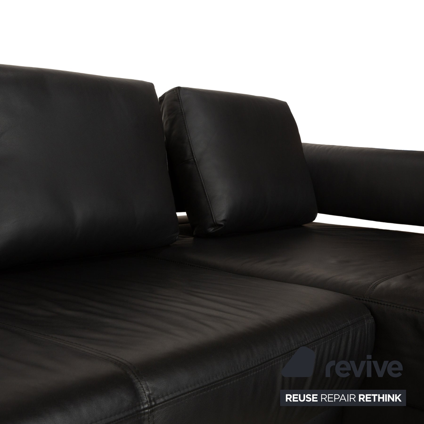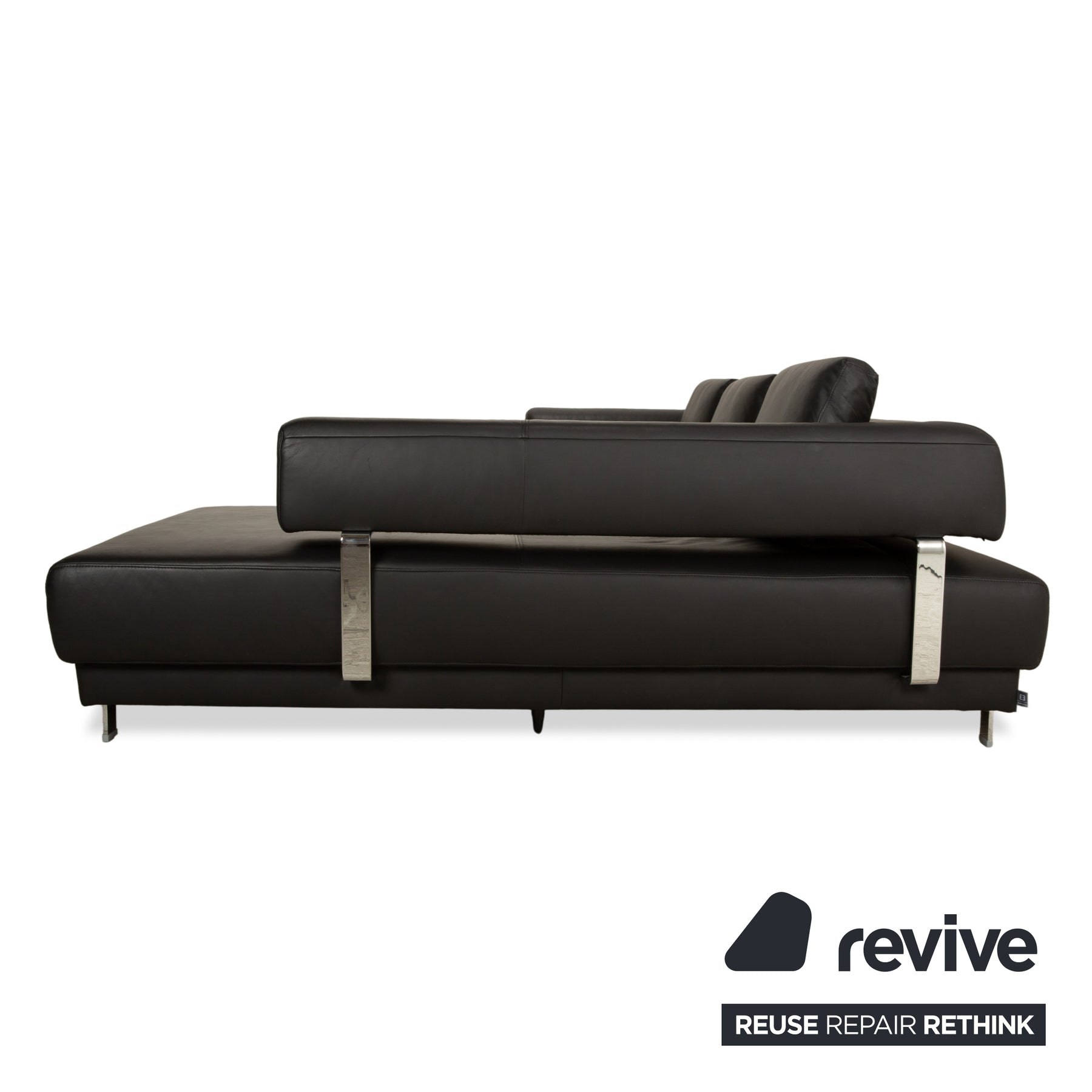 The Brand Face corner sofa by Ewald Schillig is upholstered in black genuine leather and stands on discreet metal feet. It features additional, comfortable back cushions, a modern design, and an electrically extendable seat.