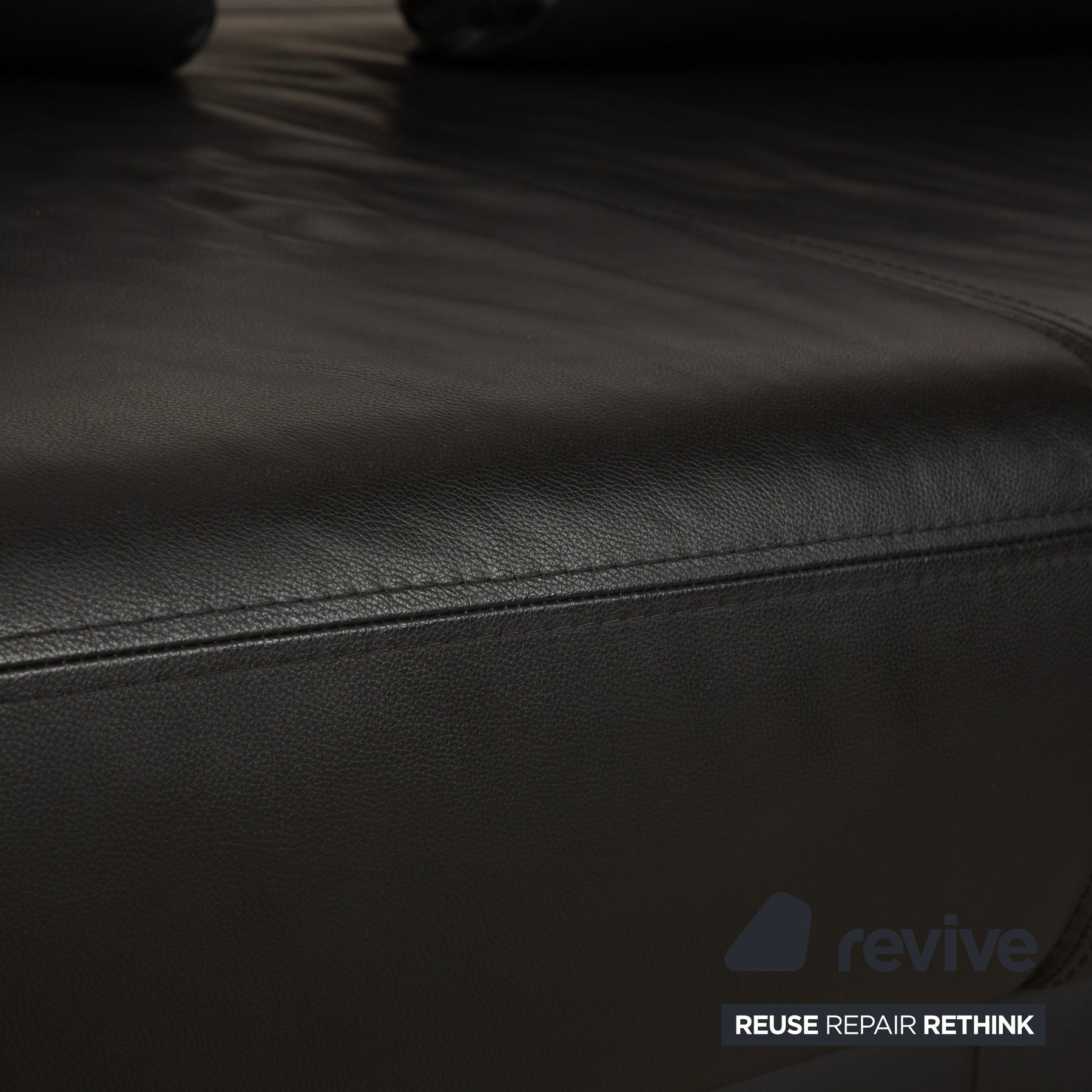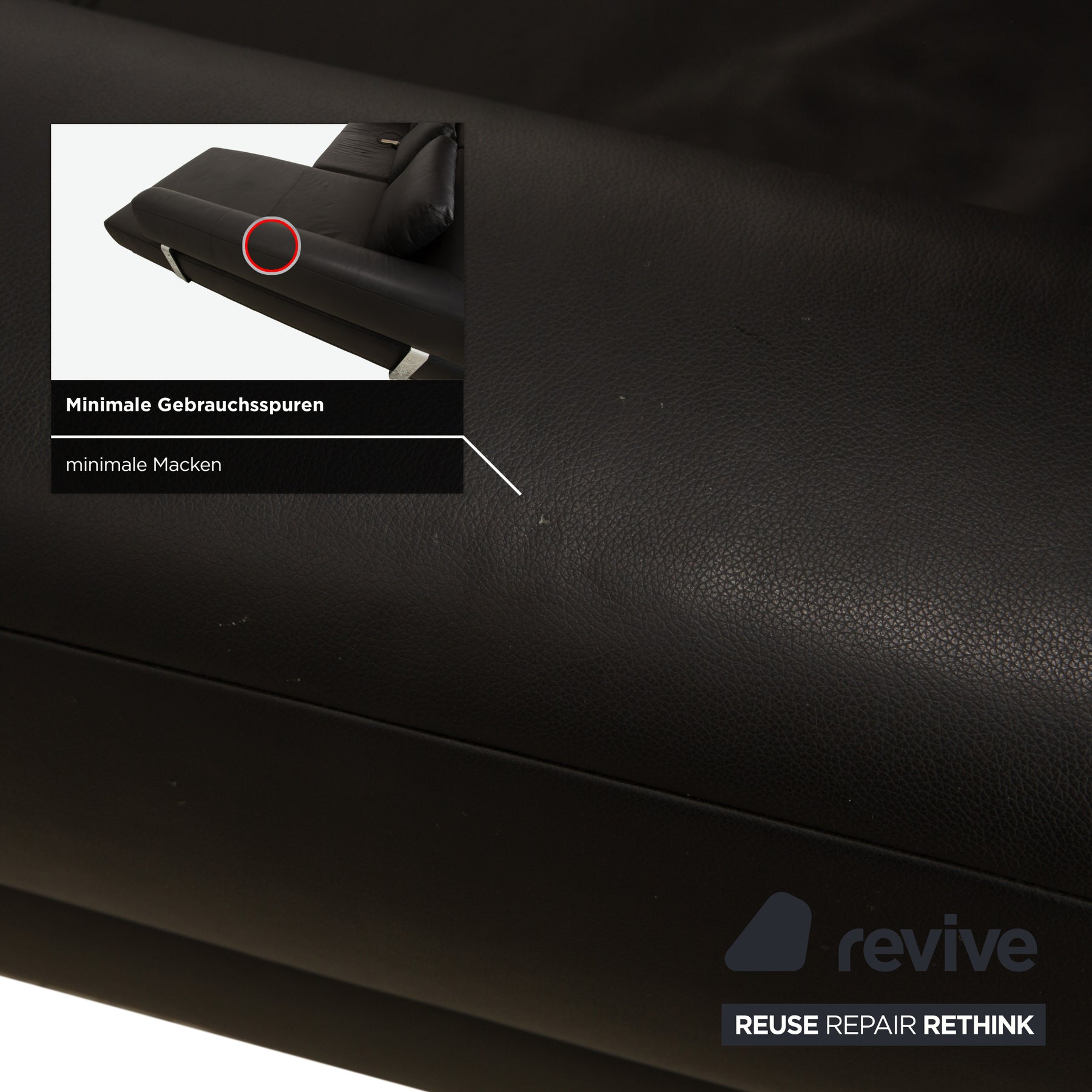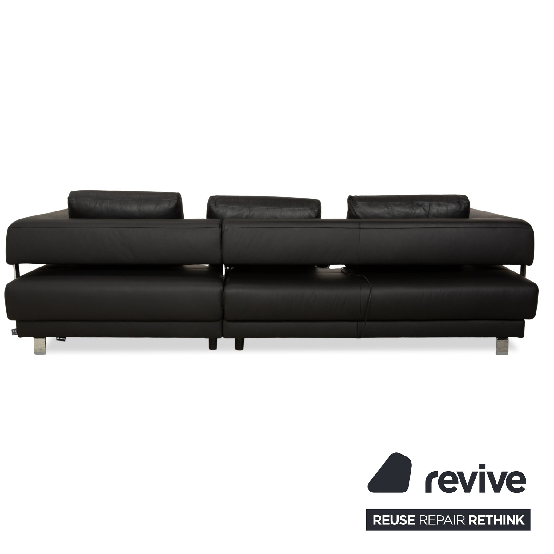 The Brand Face corner sofa by Ewald Schillig is upholstered in black genuine leather and stands on discreet metal feet. It features additional, comfortable back cushions, a modern design, and an electrically extendable seat.