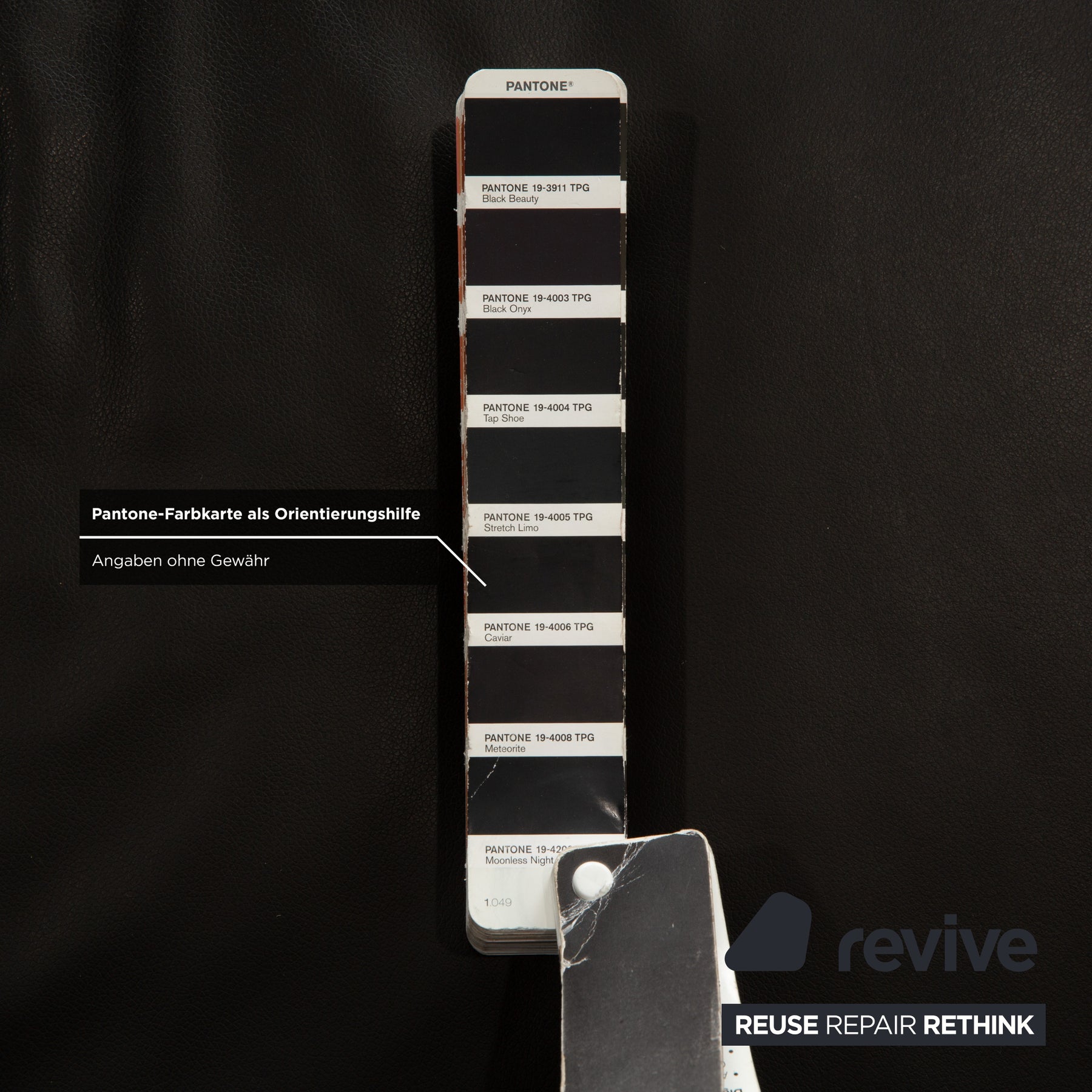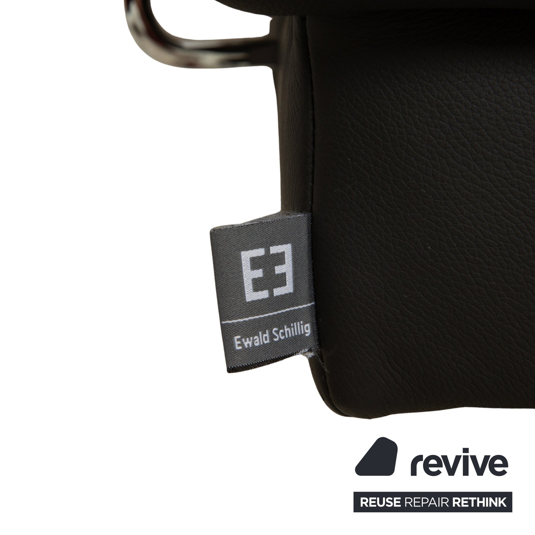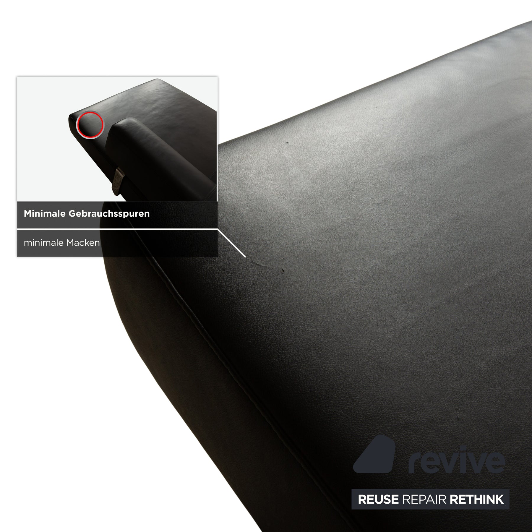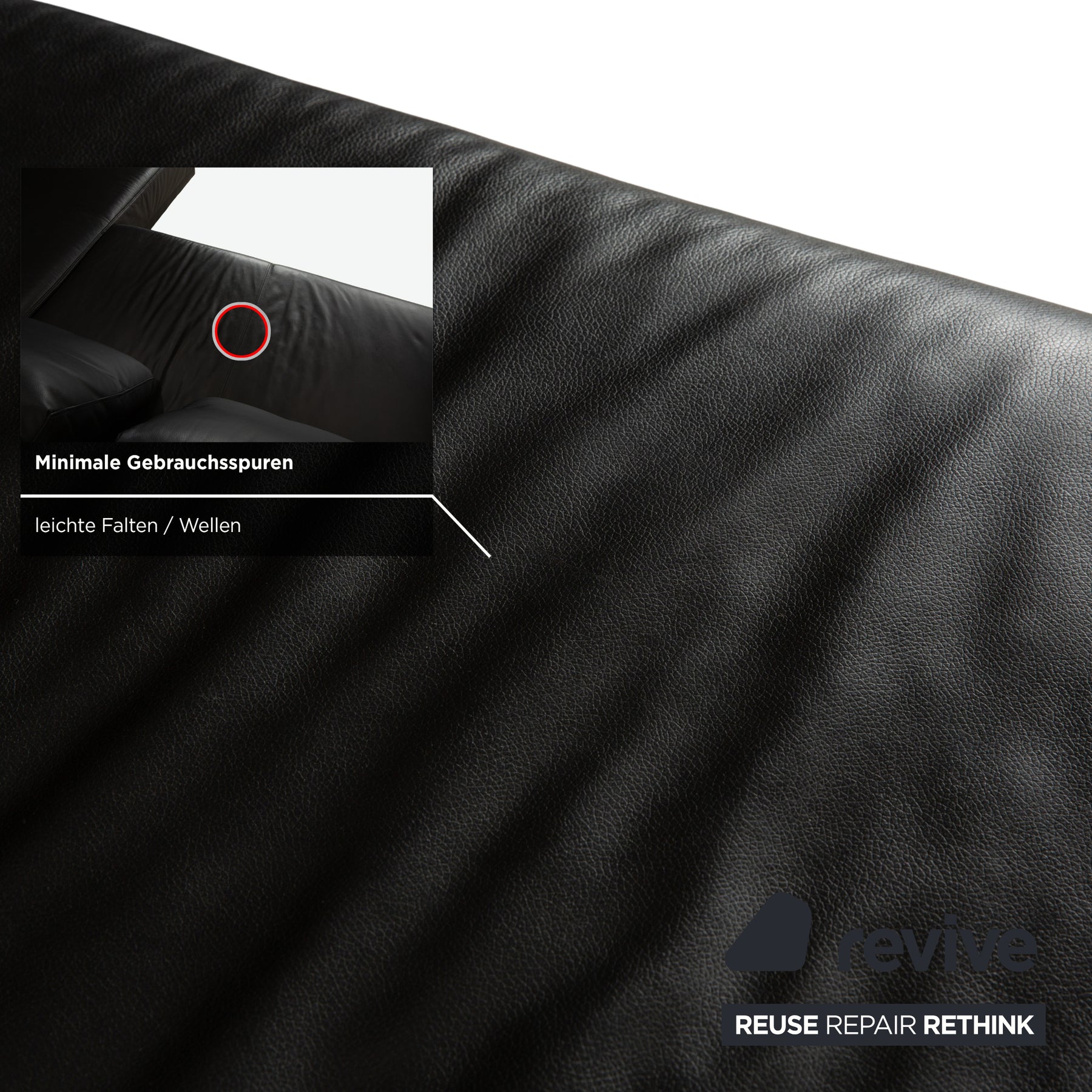 The Brand Face corner sofa by Ewald Schillig is upholstered in black genuine leather and stands on discreet metal feet. It features additional, comfortable back cushions, a modern design, and an electrically extendable seat.