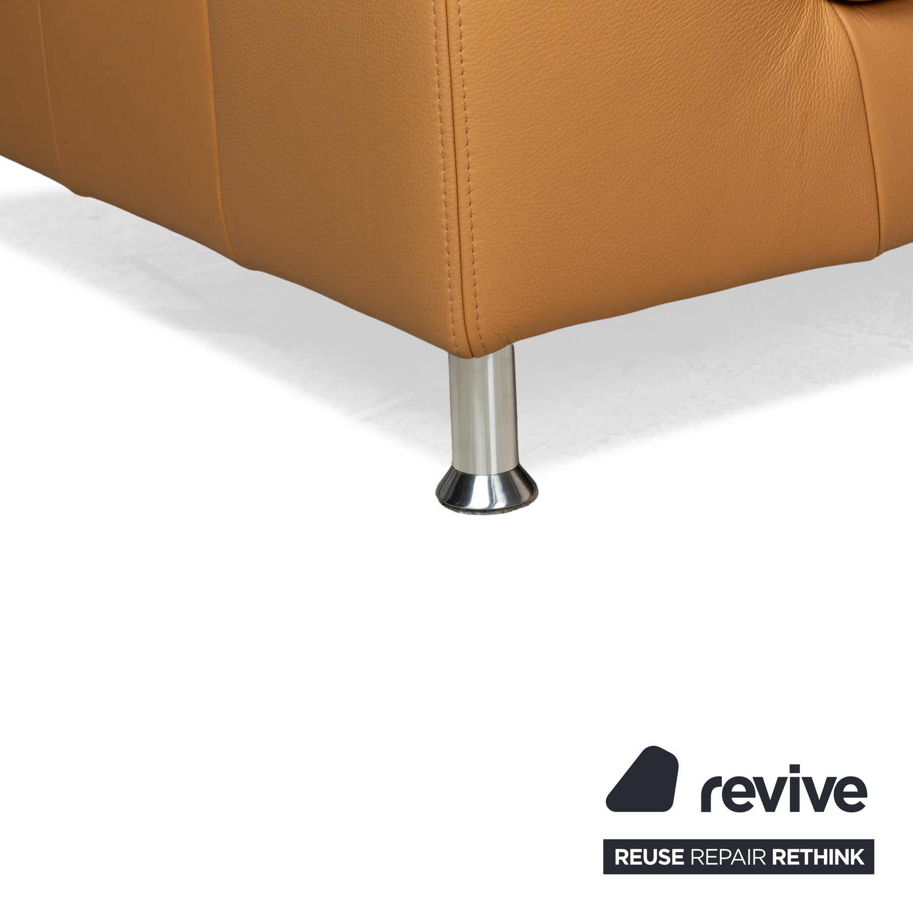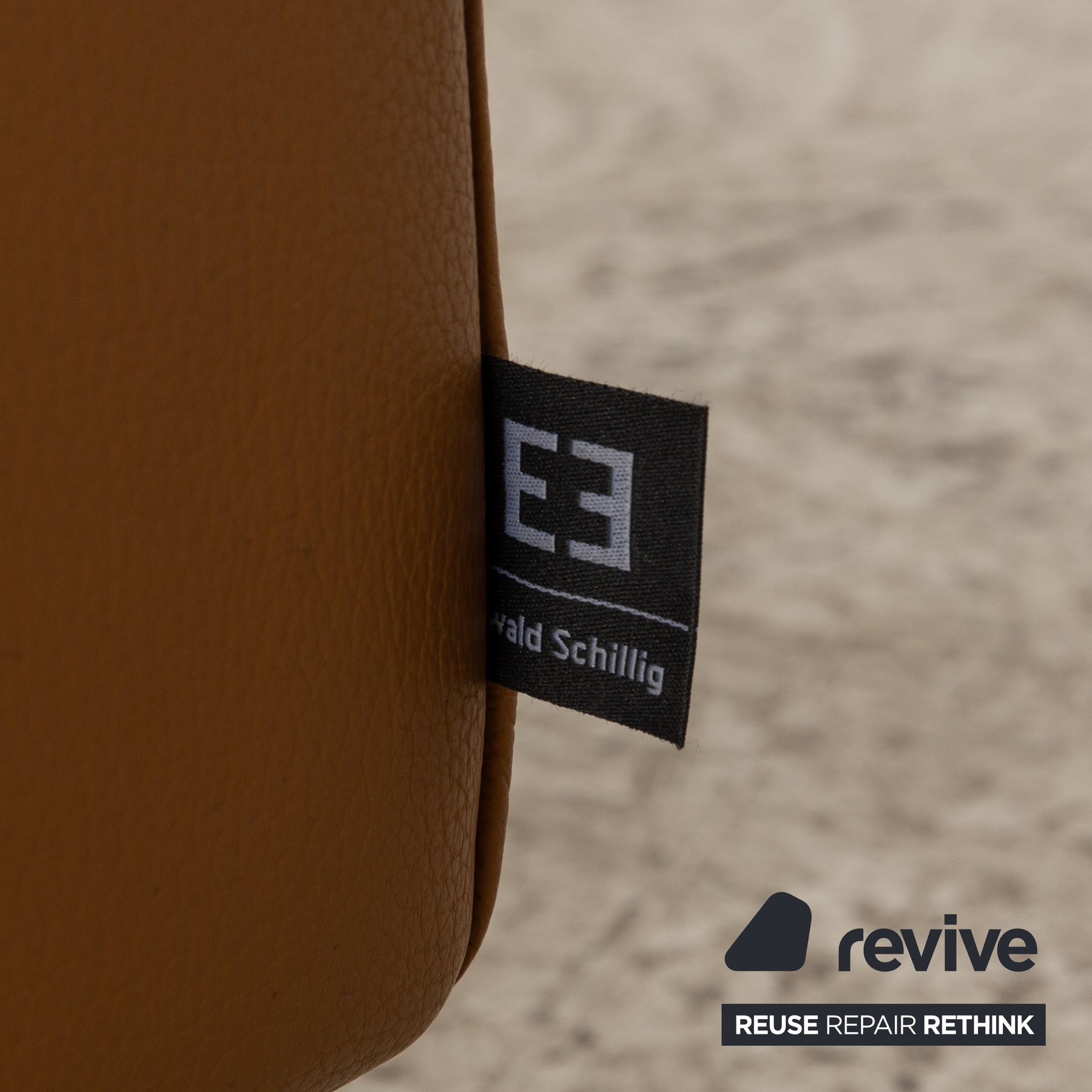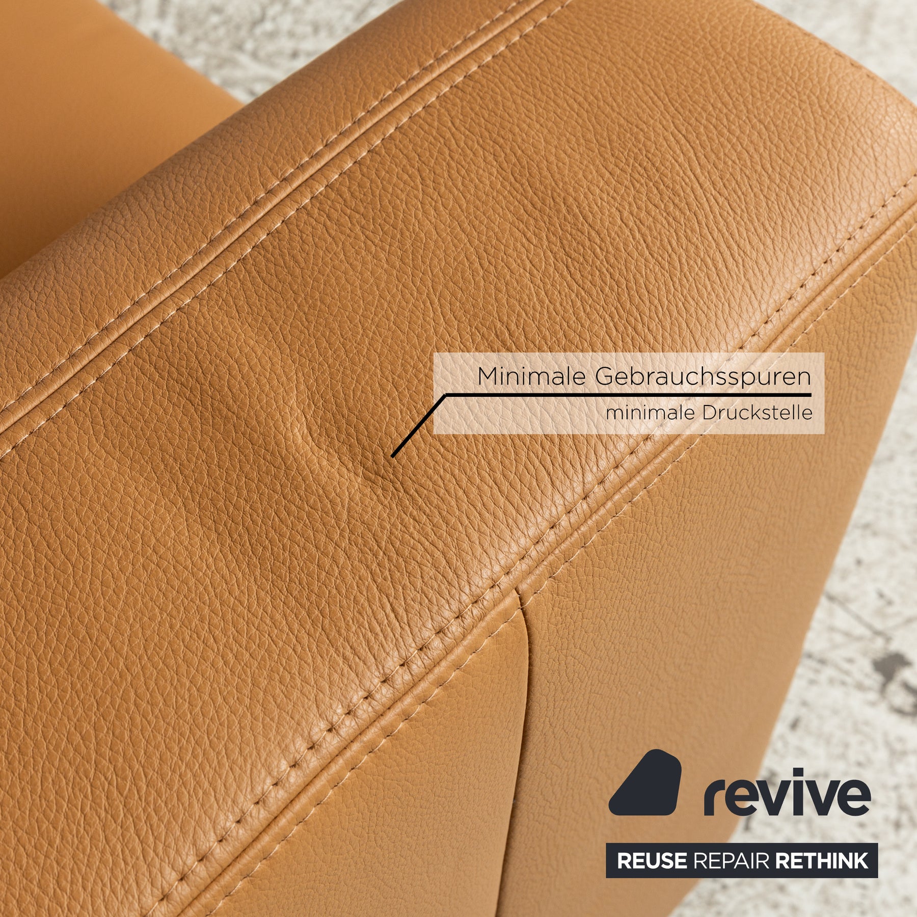The corner sofa by Ewald Schillig is covered with brown genuine leather and stands on inconspicuous metal feet. It is characterized by the additional, comfortable back cushions and the electric relaxation function.