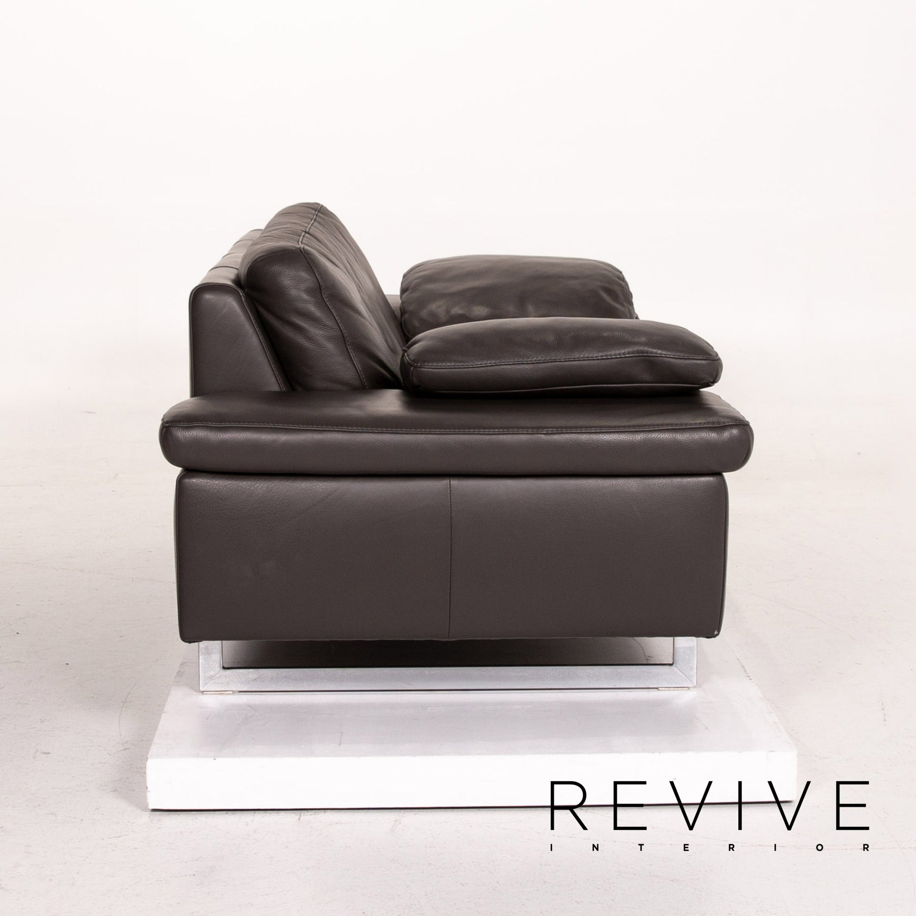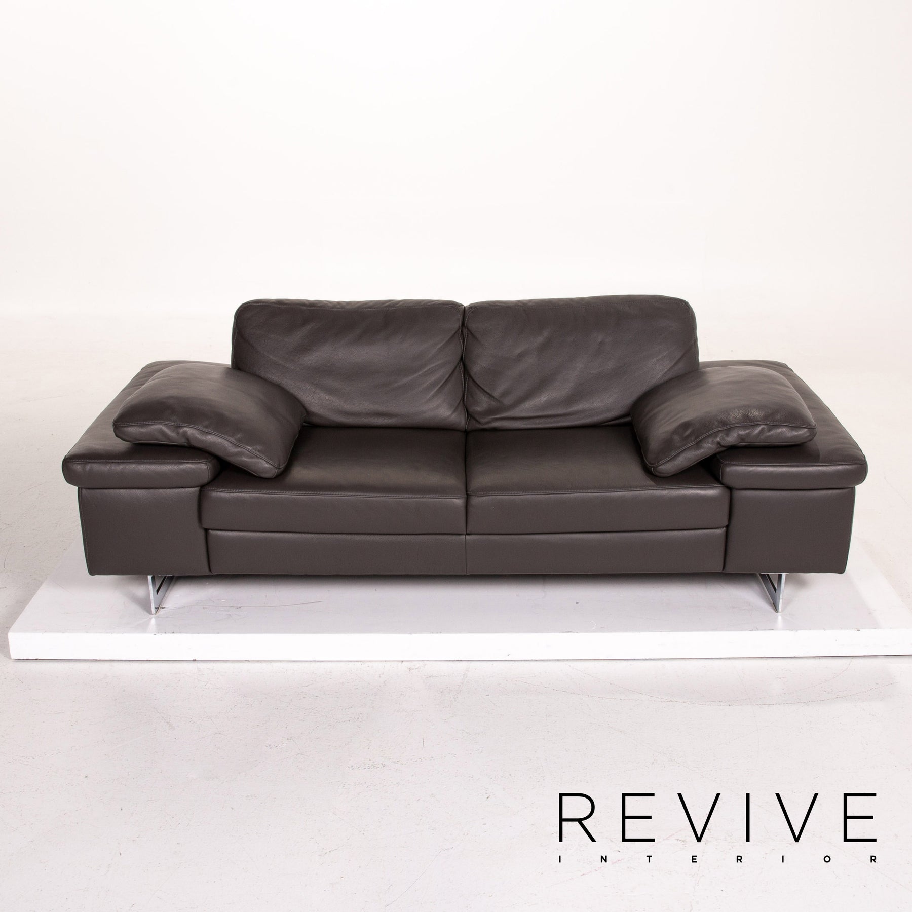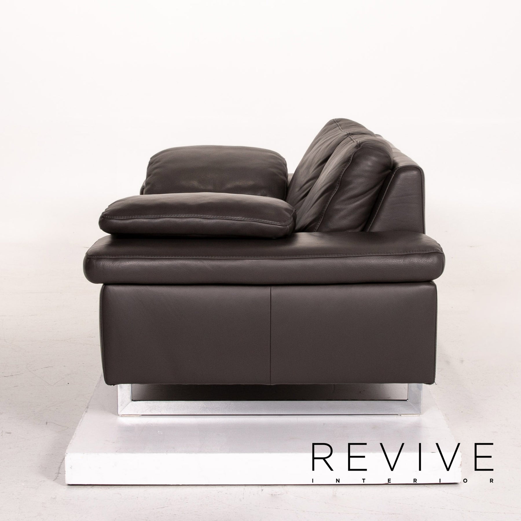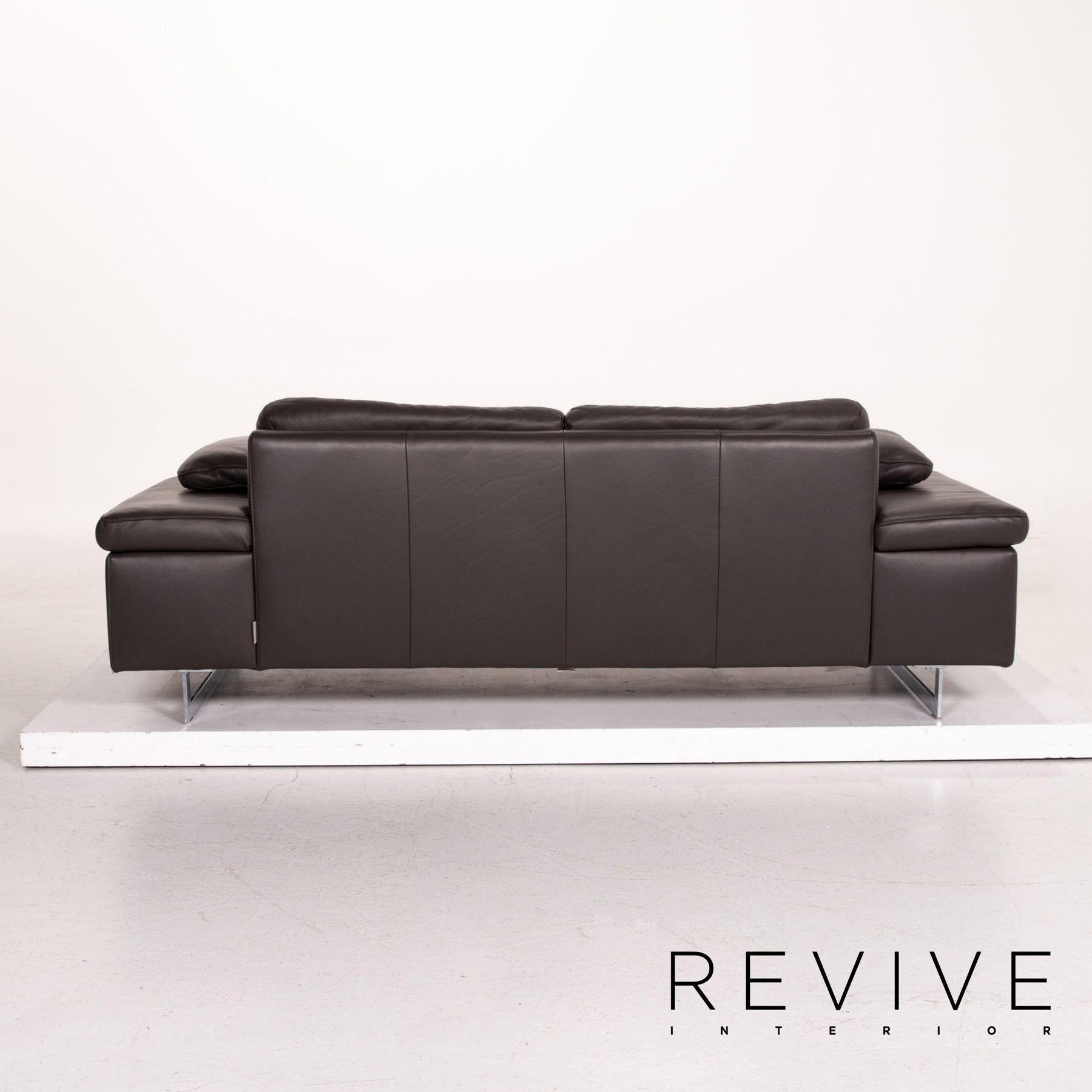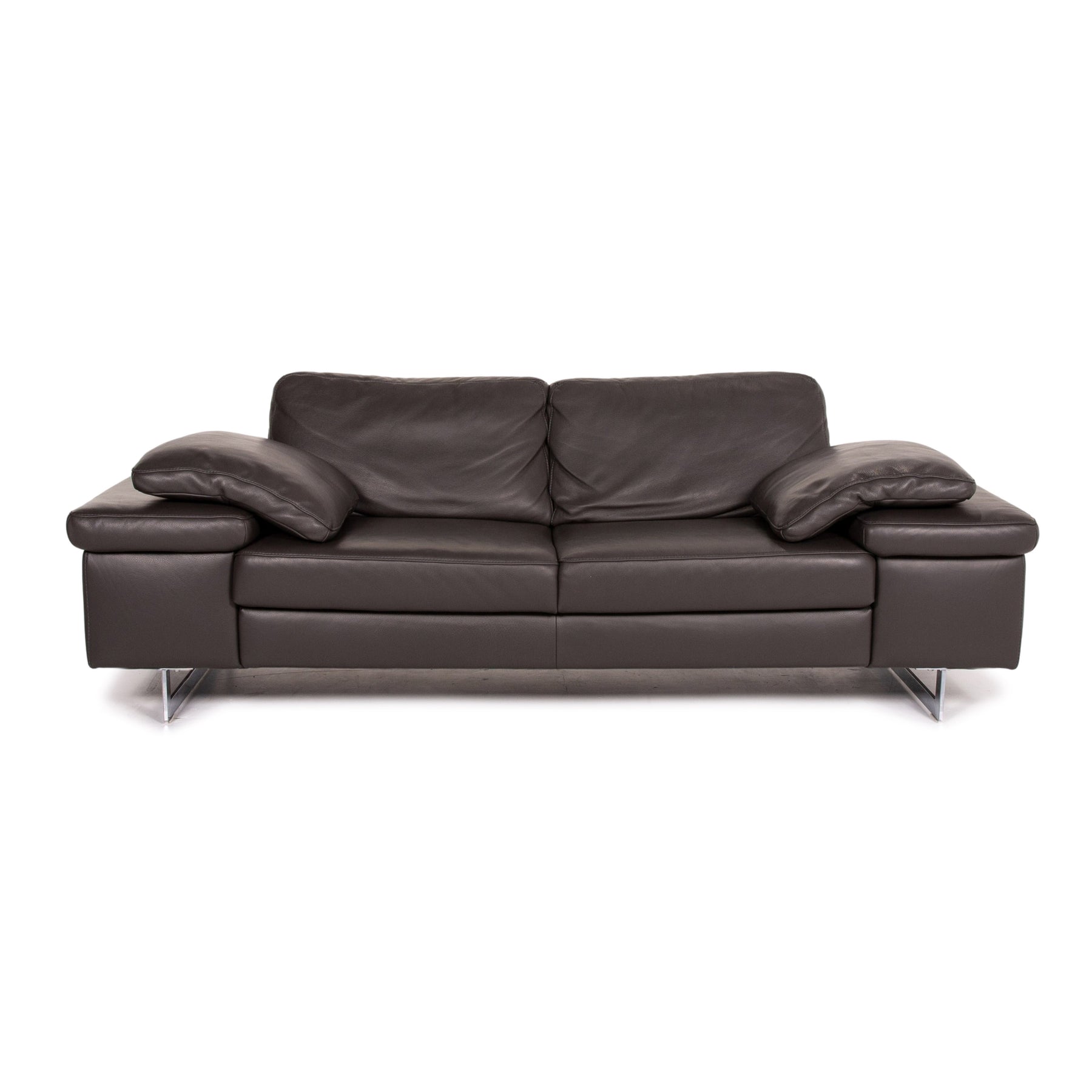 The two-seater by Ewald Schillig is upholstered in dark brown genuine leather and stands on skid-shaped metal feet. A linear, modern design characterizes the sofa.