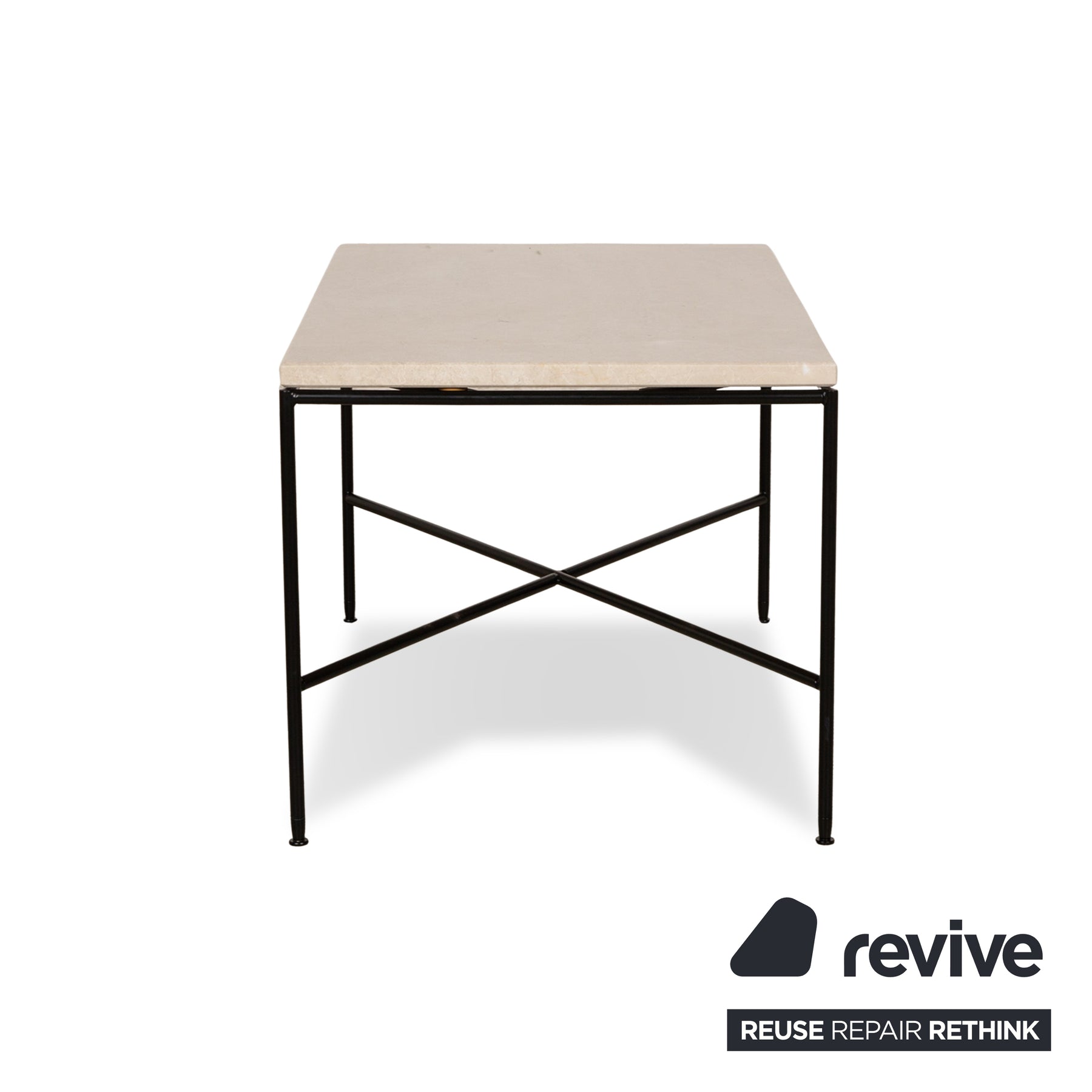 The Plannar coffee table consists of a beige marble top and stands on a black metal frame. It impresses with its airy, minimalist design and modern, stylish appearance.