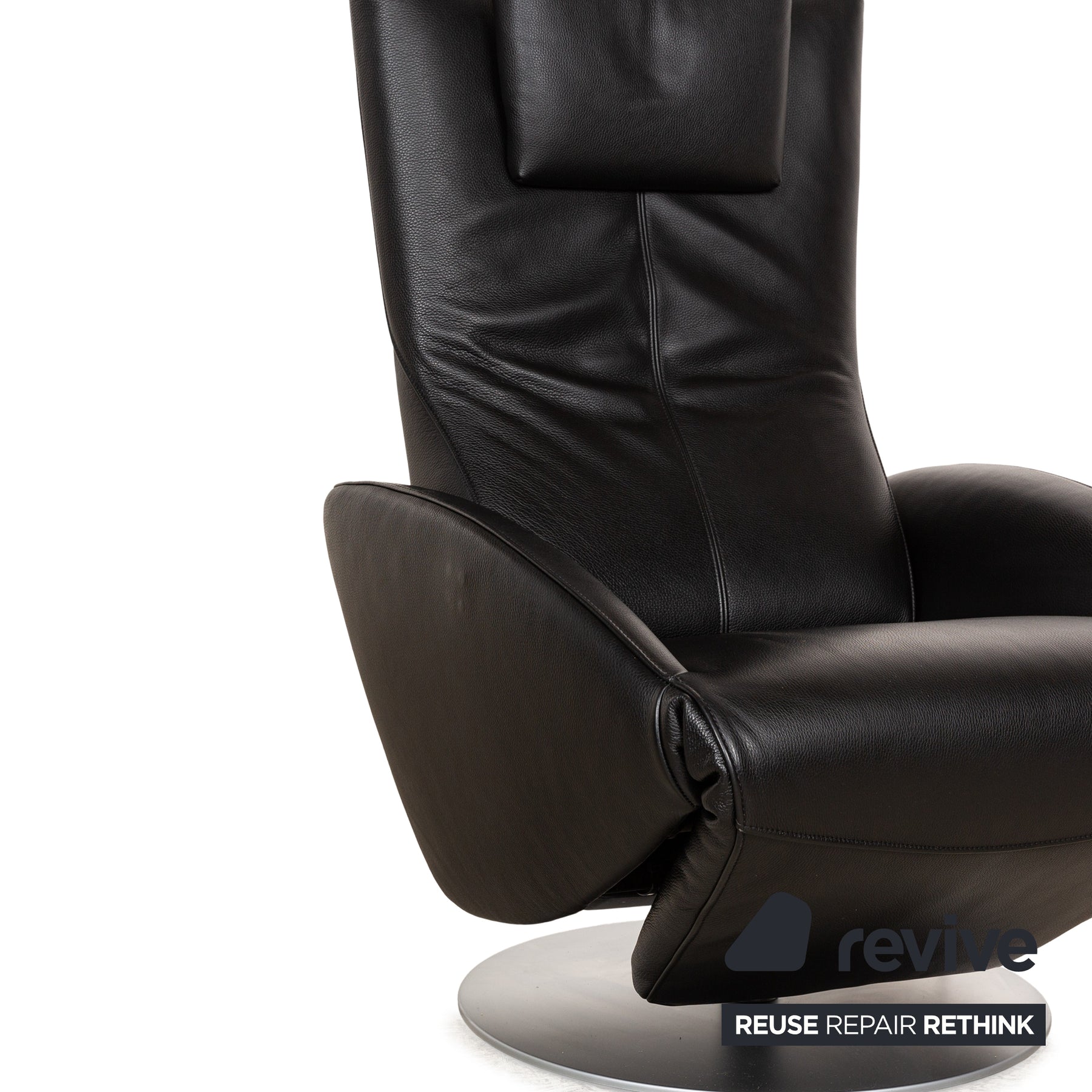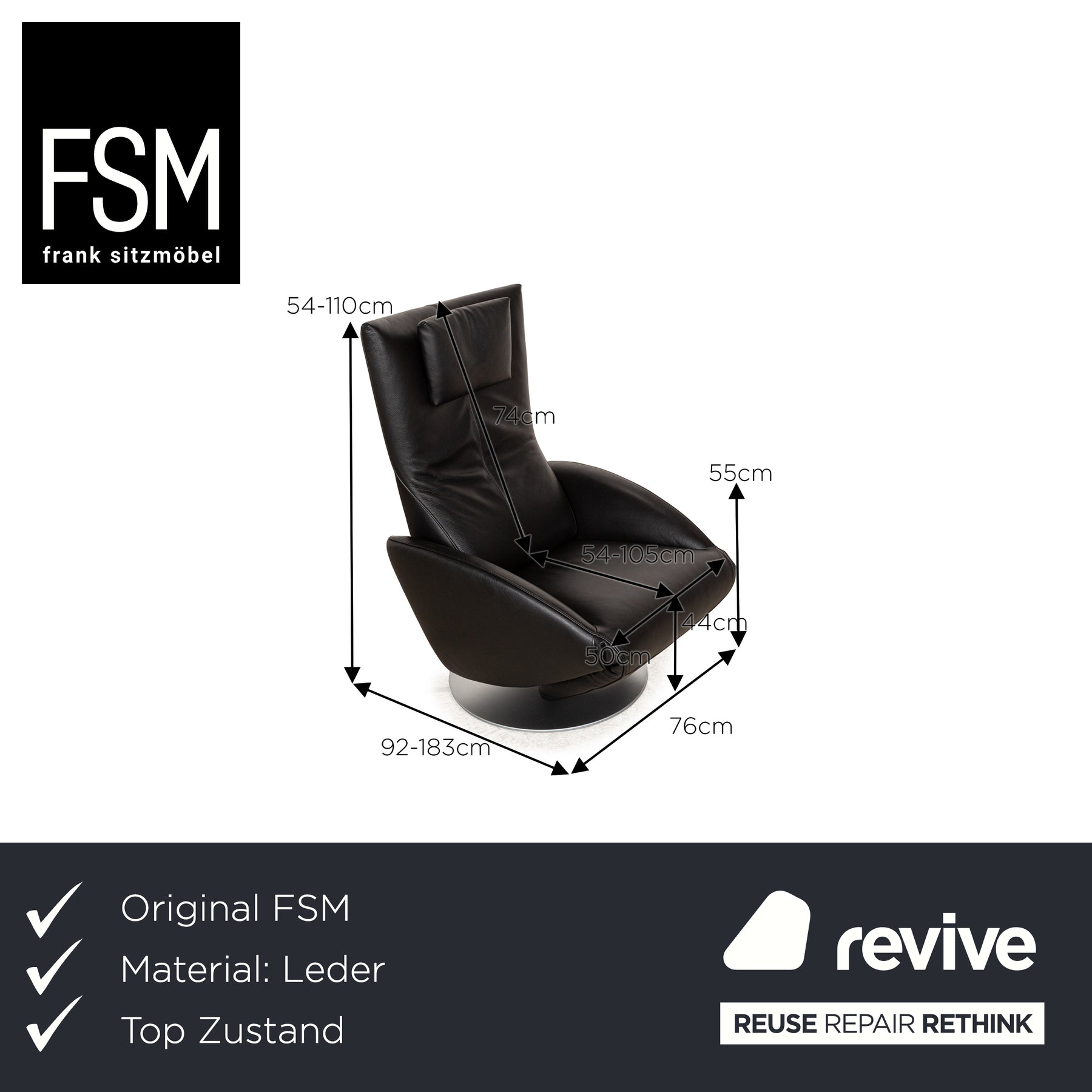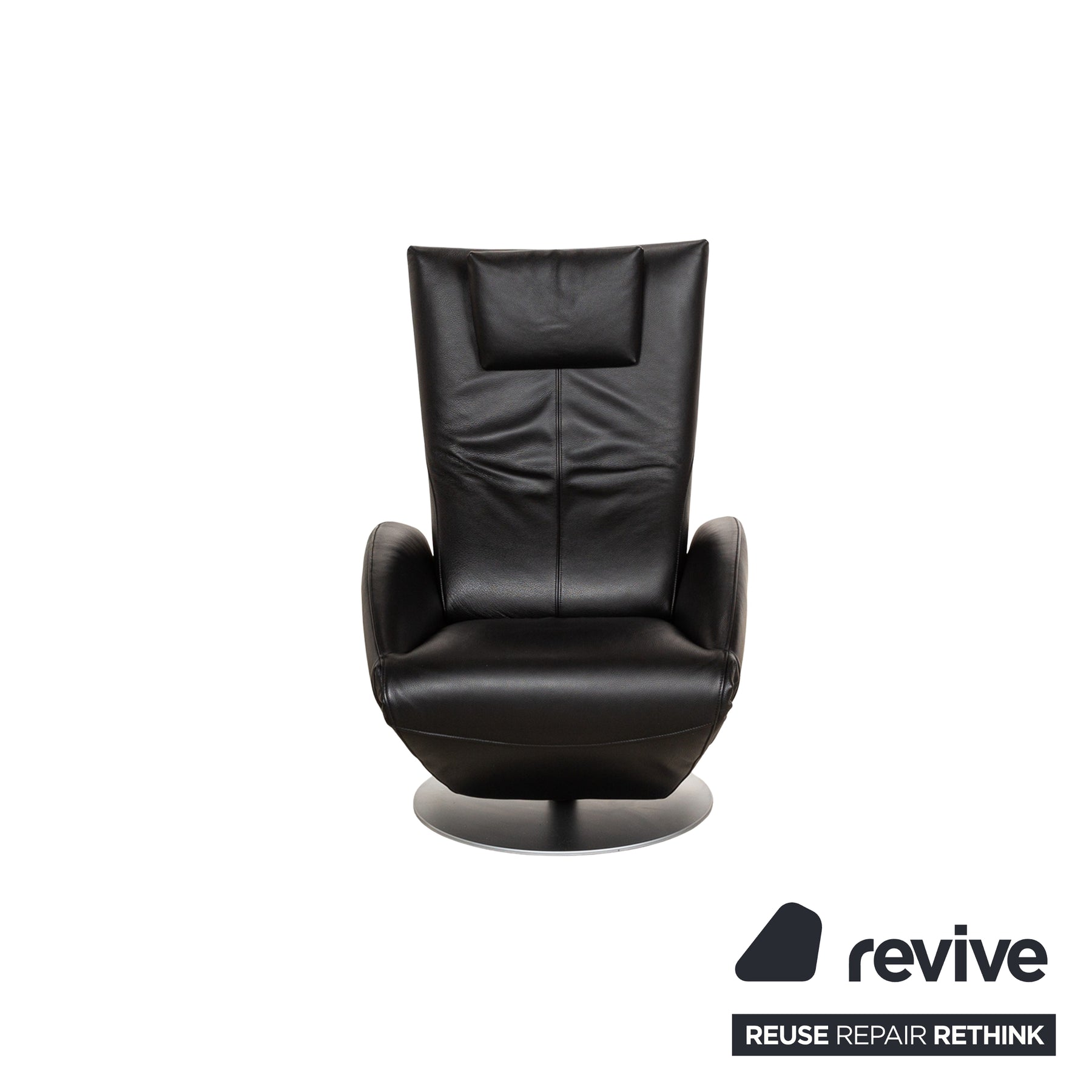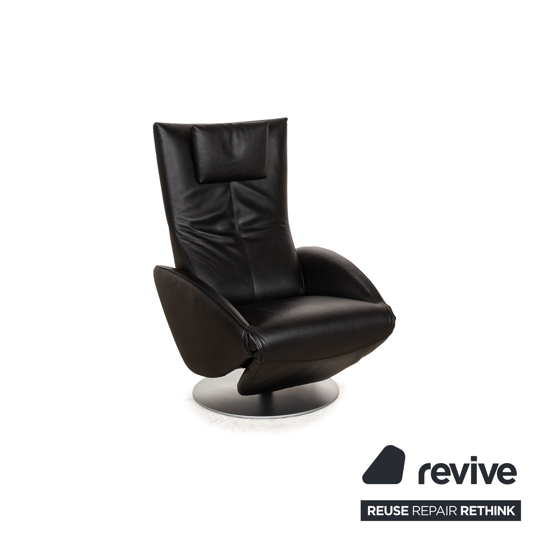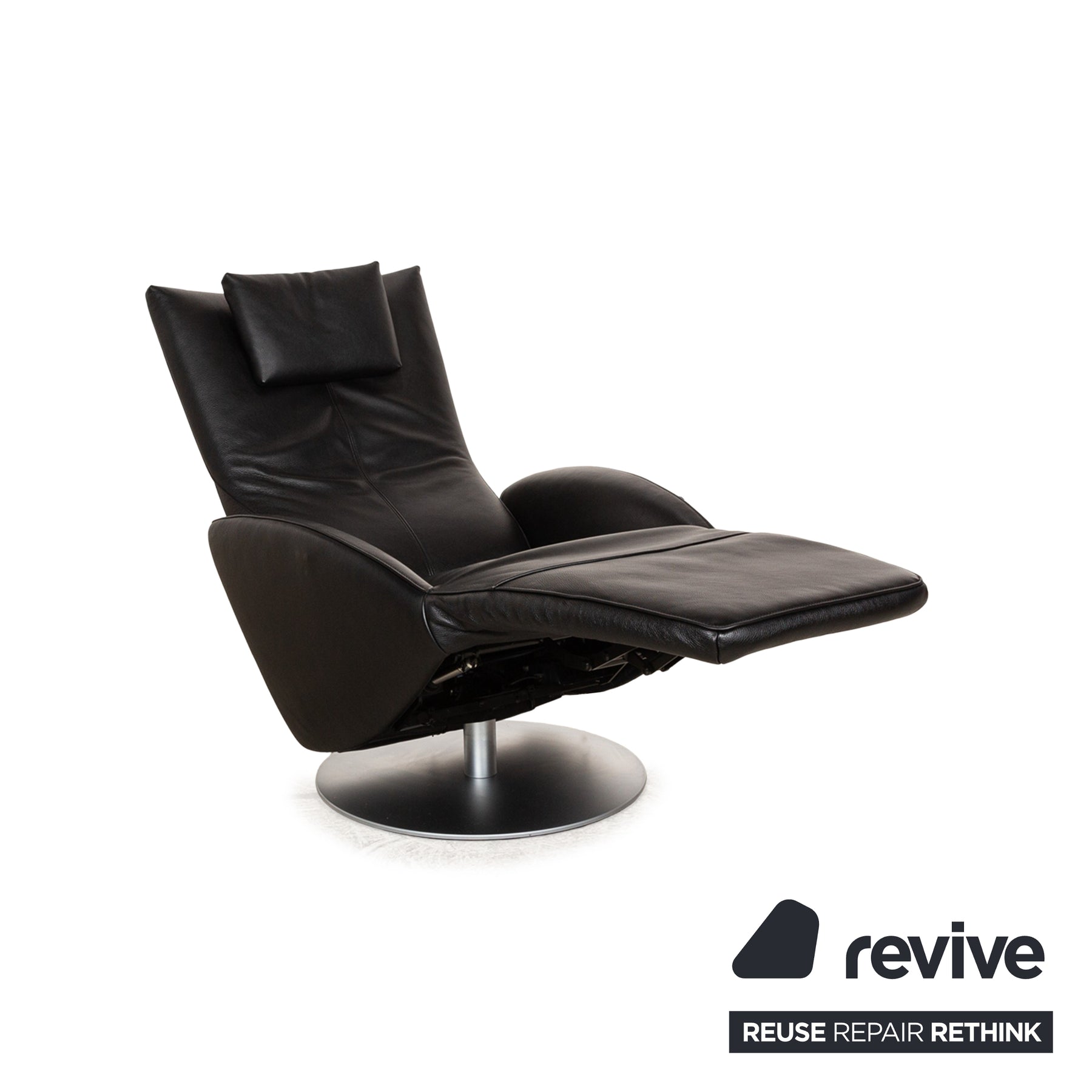 The Mate armchair from FSM is upholstered in black genuine leather and stands on a sophisticated, round metal base. Its modern design and comfortable electric reclining function distinguish this armchair.