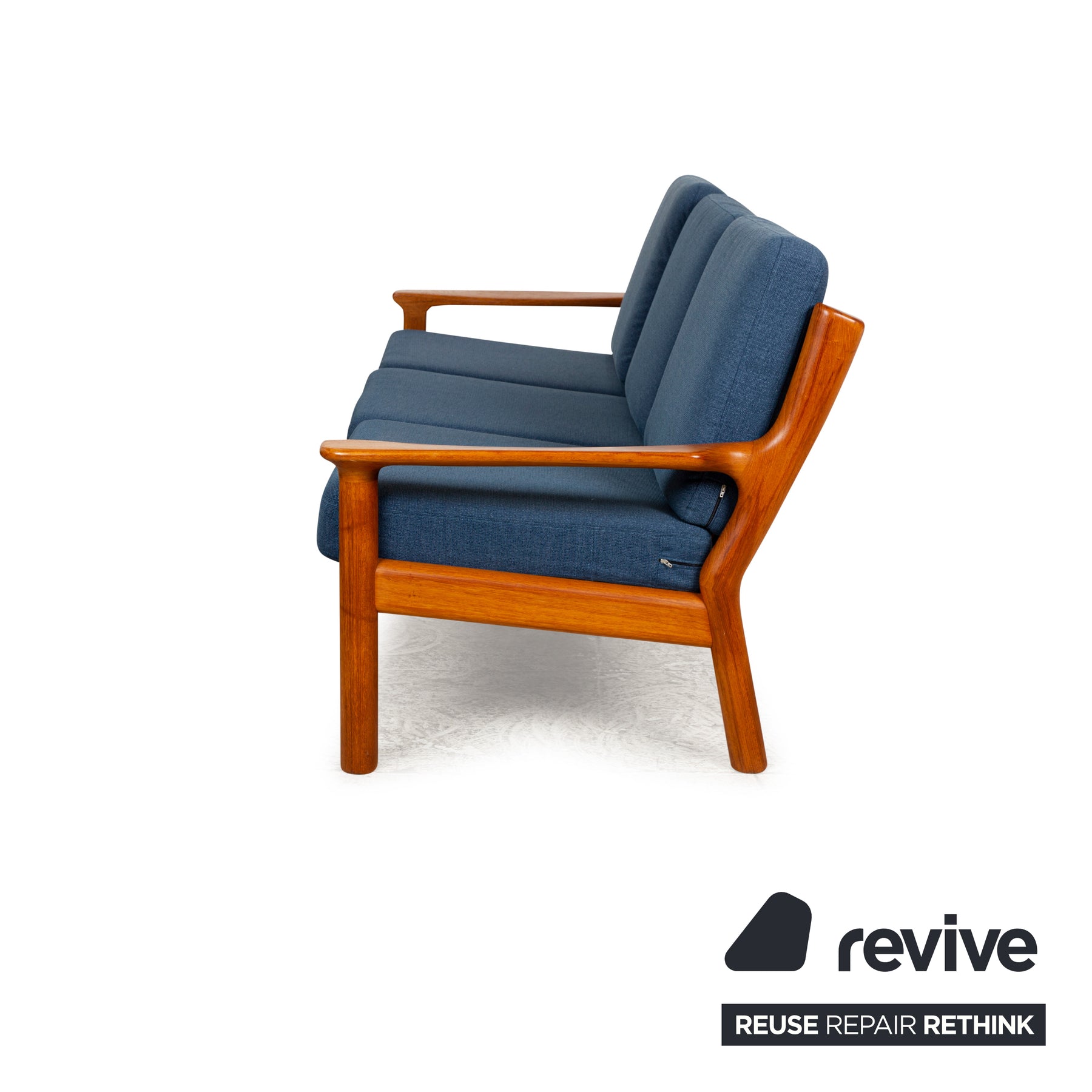 The sofa by Glostrup, designed by Juul Kristensen, is upholstered in blue fabric and made from a wooden frame. The three-seater is characterized by its classic mid-century style with its reduced shapes and minimal curves.