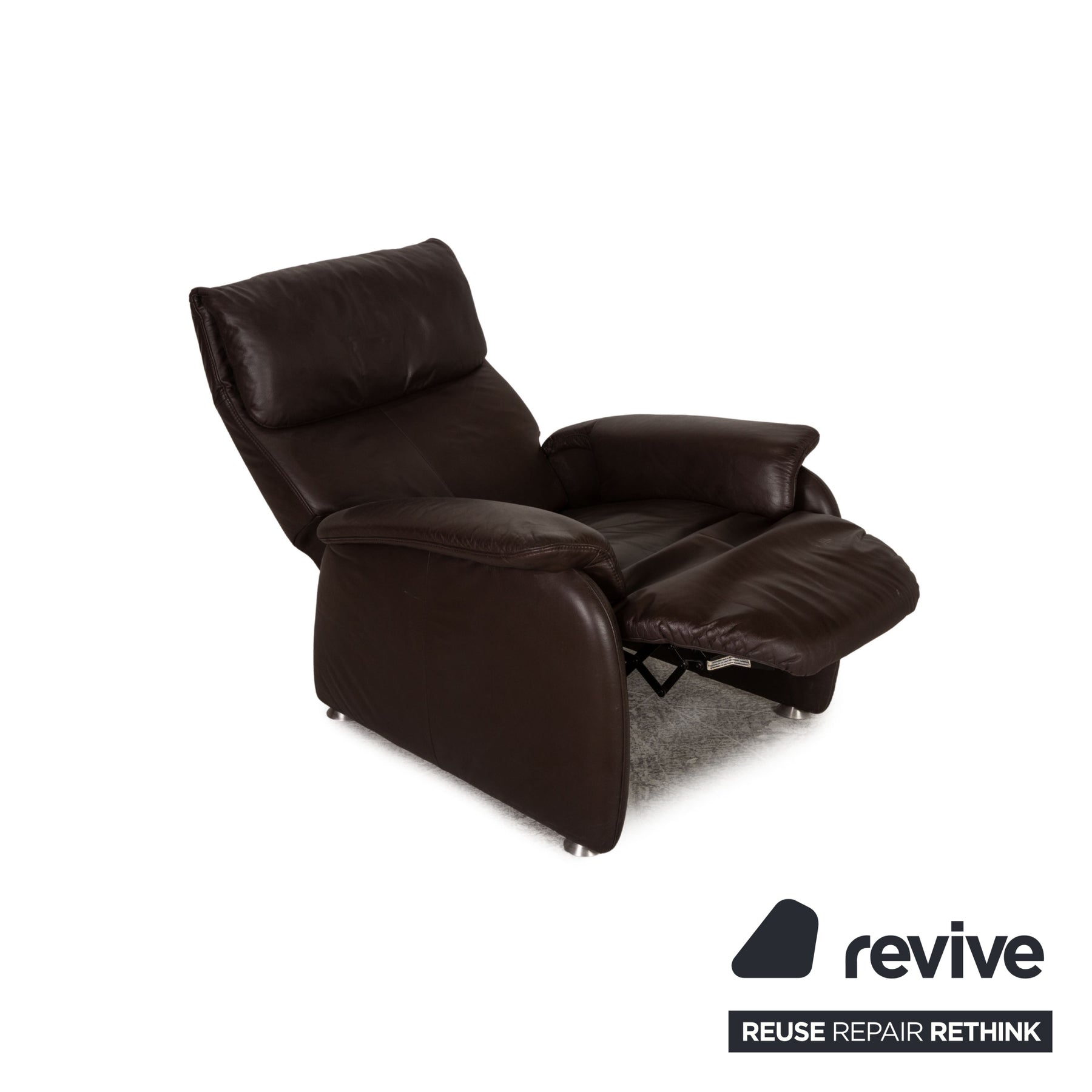 The Cumuly armchair by Himolla is covered with brown genuine leather and stands on inconspicuous metal feet. The timeless, simple design and the comfortable relax function distinguish it.
