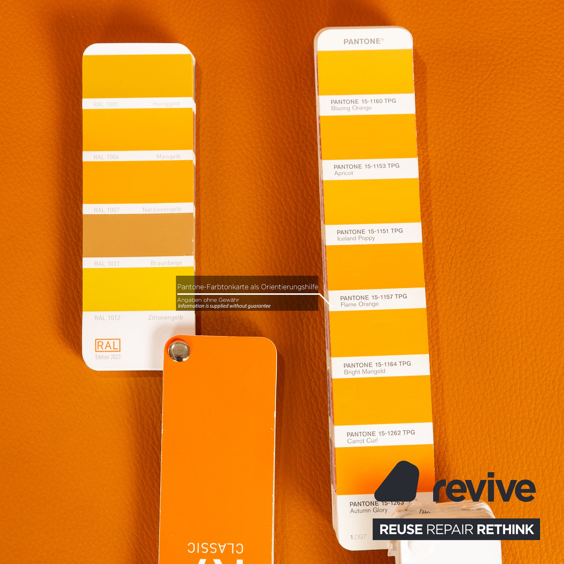 The two-seater from Himolla is covered in orange genuine leather and stands on inconspicuous feet. It is characterized by its simple appearance and classic, timeless design.