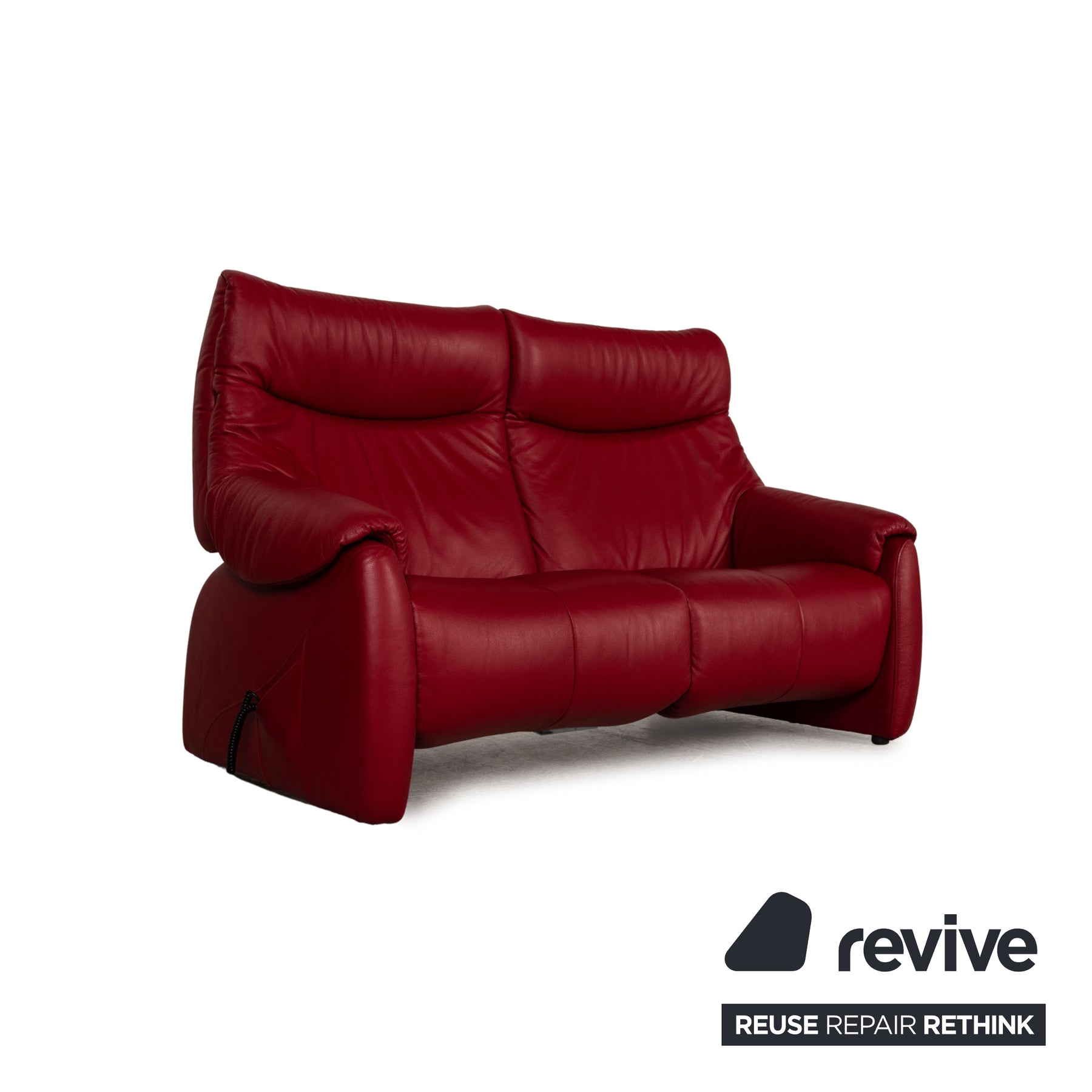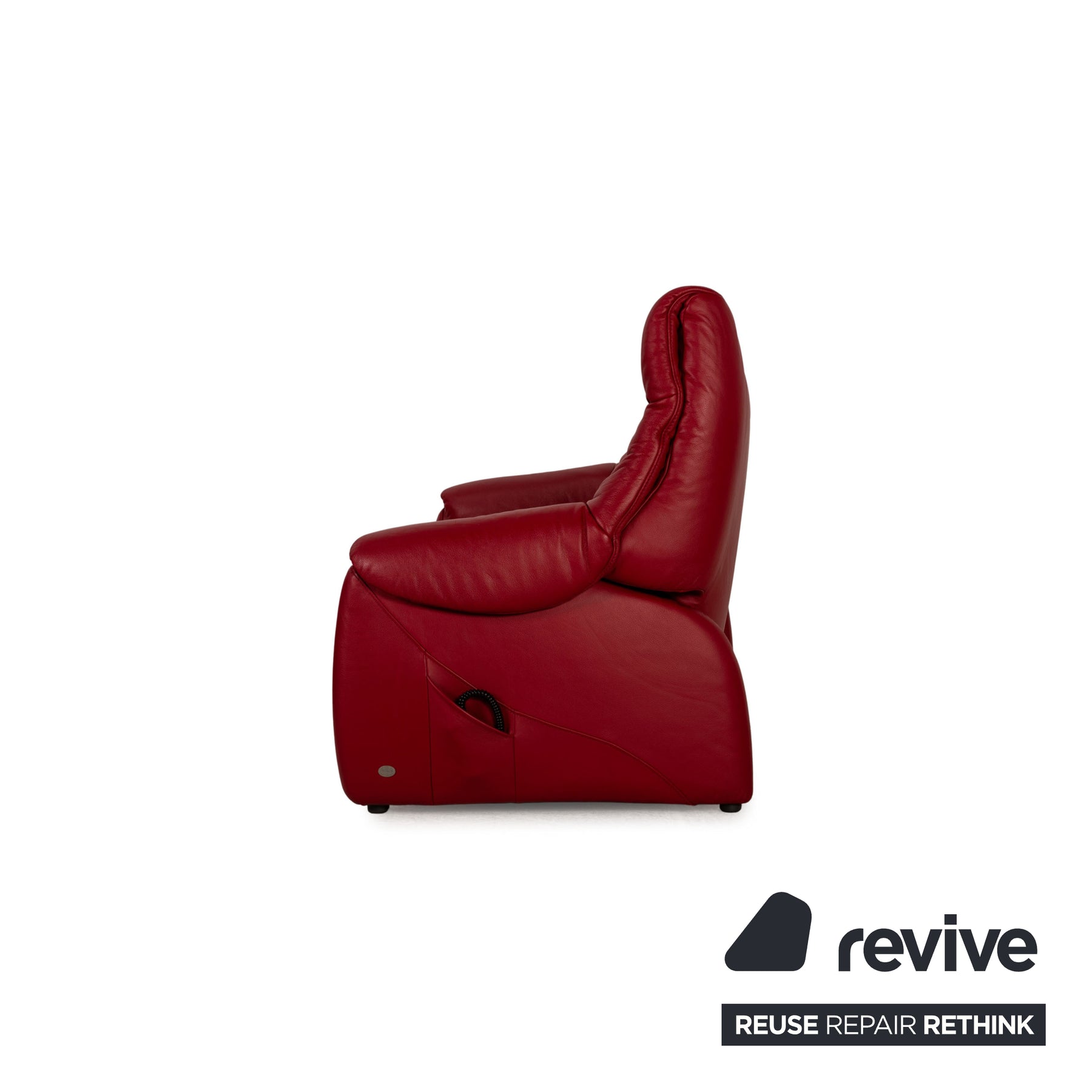 The two-seater Cumuly by Himolla is covered with red genuine leather and stands on inconspicuous feet. It is characterized by the electric relaxation function and the classic design.