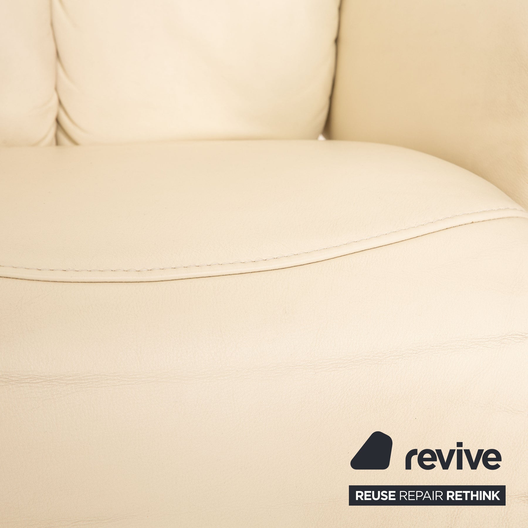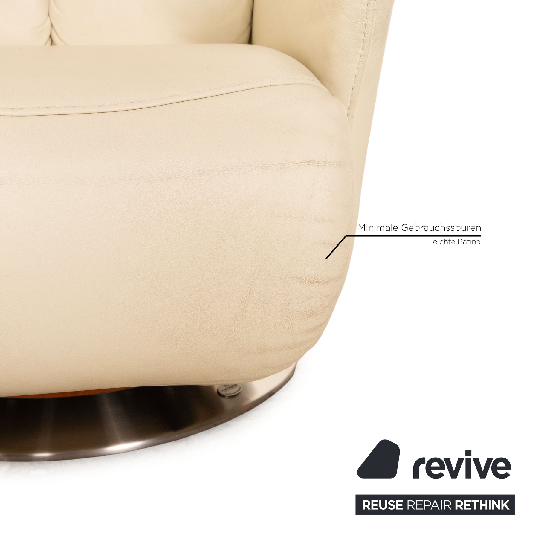 The Easyswing armchair by Himolla is covered with cream-colored real leather and stands on a round base. The classic design and the practical relax function distinguish it.