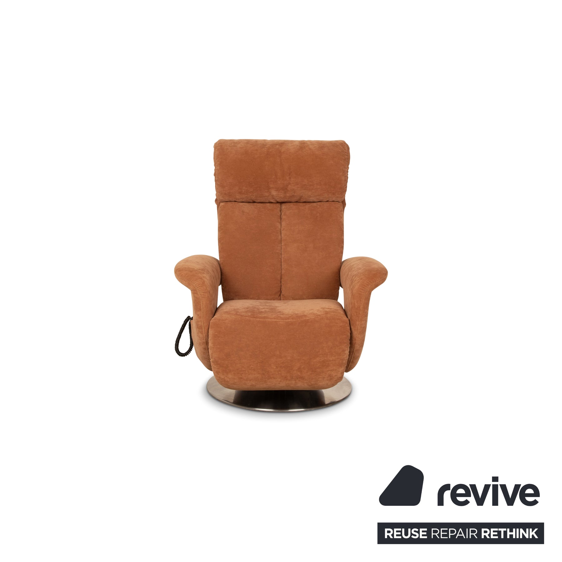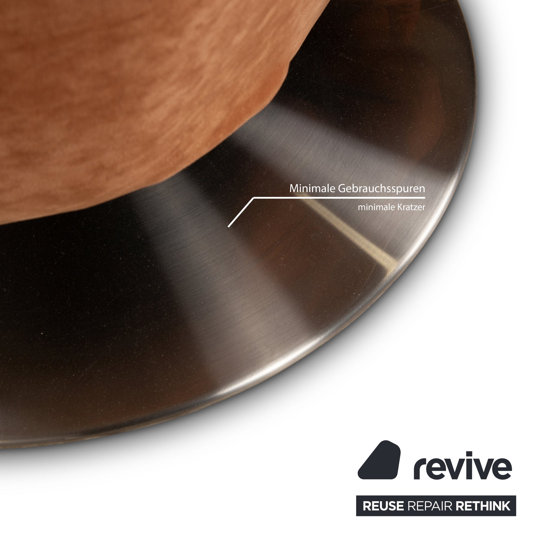The Easy-Swing armchair stands on a round metal base and is covered with a brown fabric. Its classic design and relaxation function are what make it stand out.