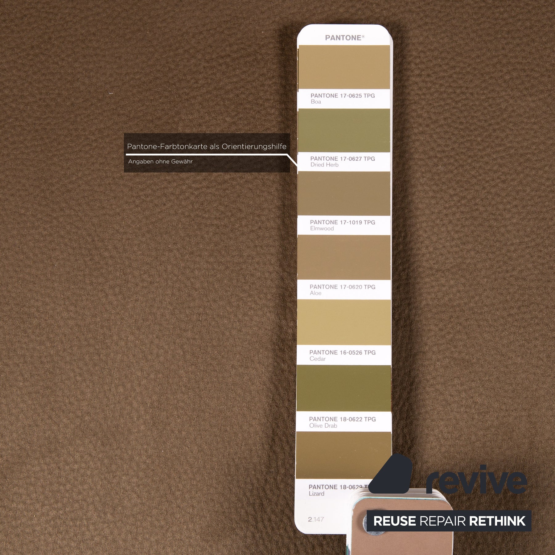 The two-seater Inca by Himolla is covered with an olive-green Alcantara fabric and stands on slender metal feet. The sofa is characterized by a simple, cubic design. For more comfort, both seats can be brought into a relaxation position by electric control.