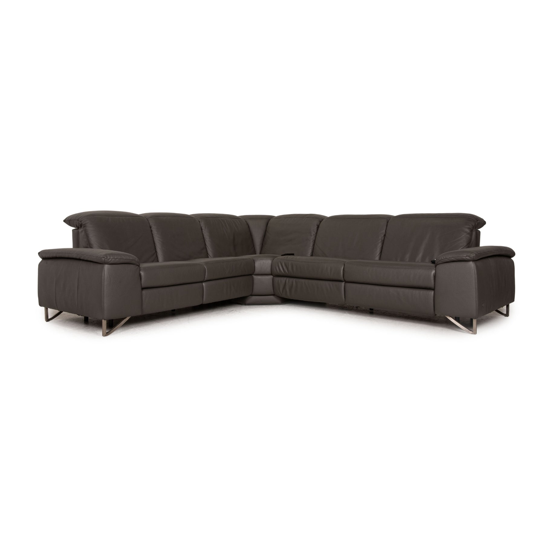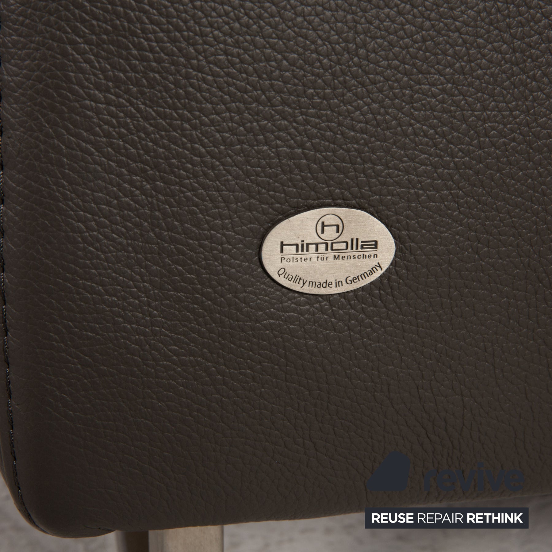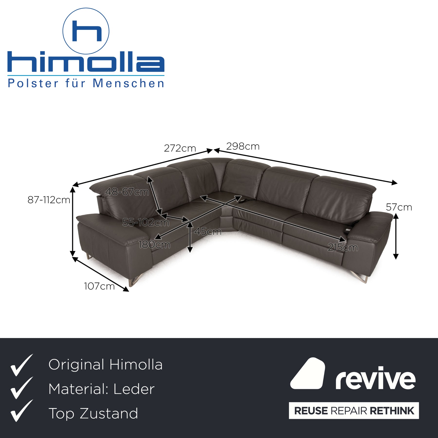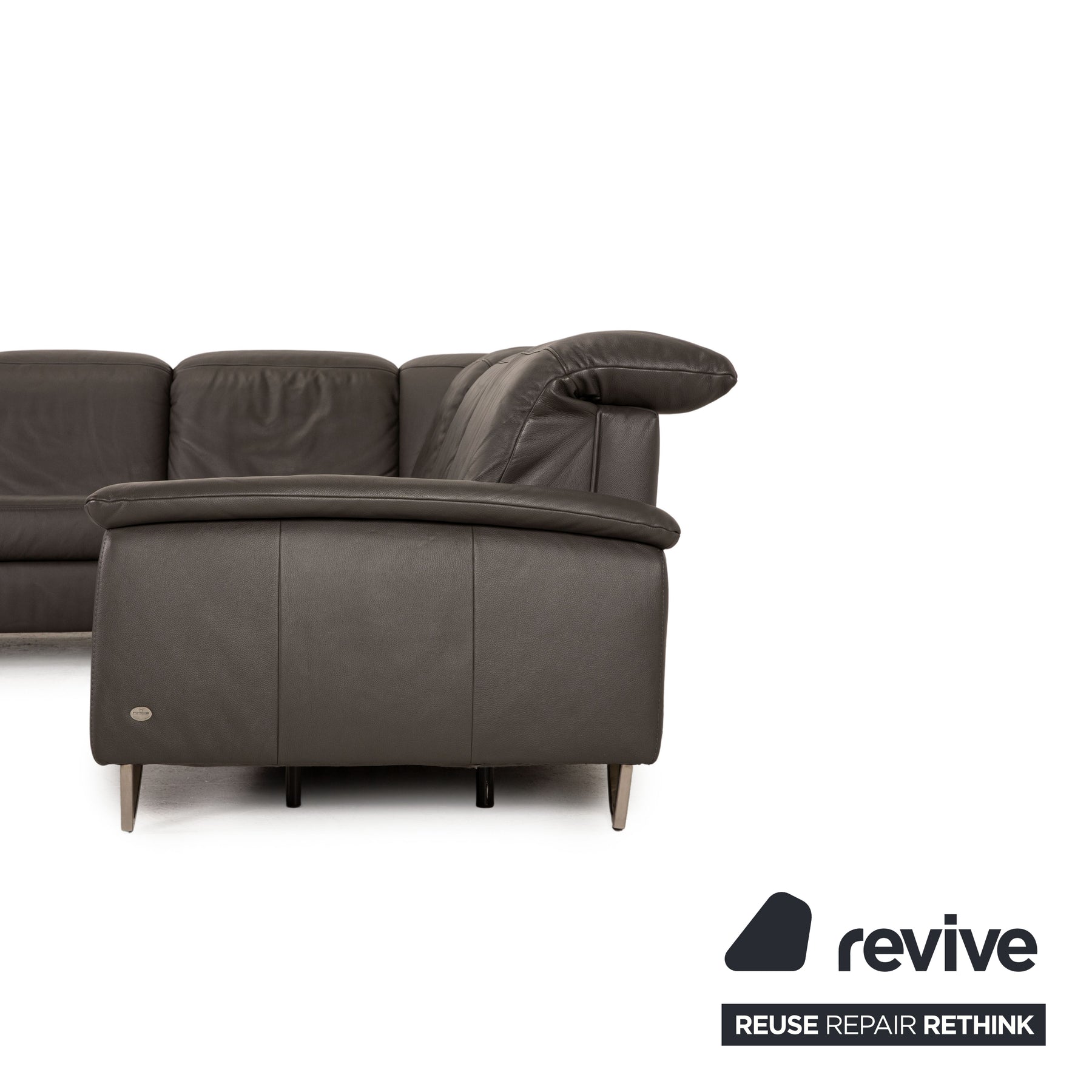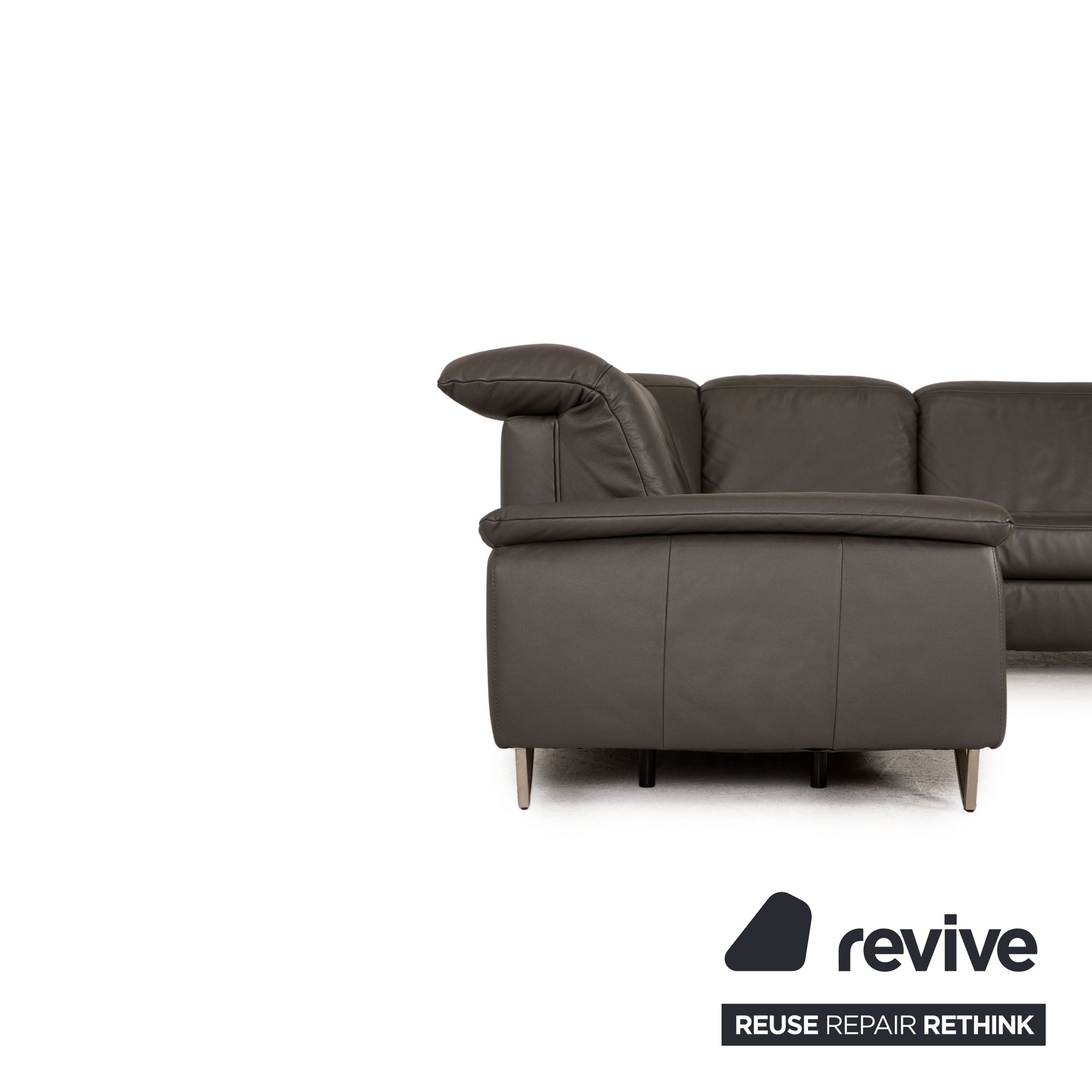 The Himolla sofa is covered with gray genuine leather and stands on silver metal feet. The classic design and the comfortable, electric relaxation function characterize the corner sofa.