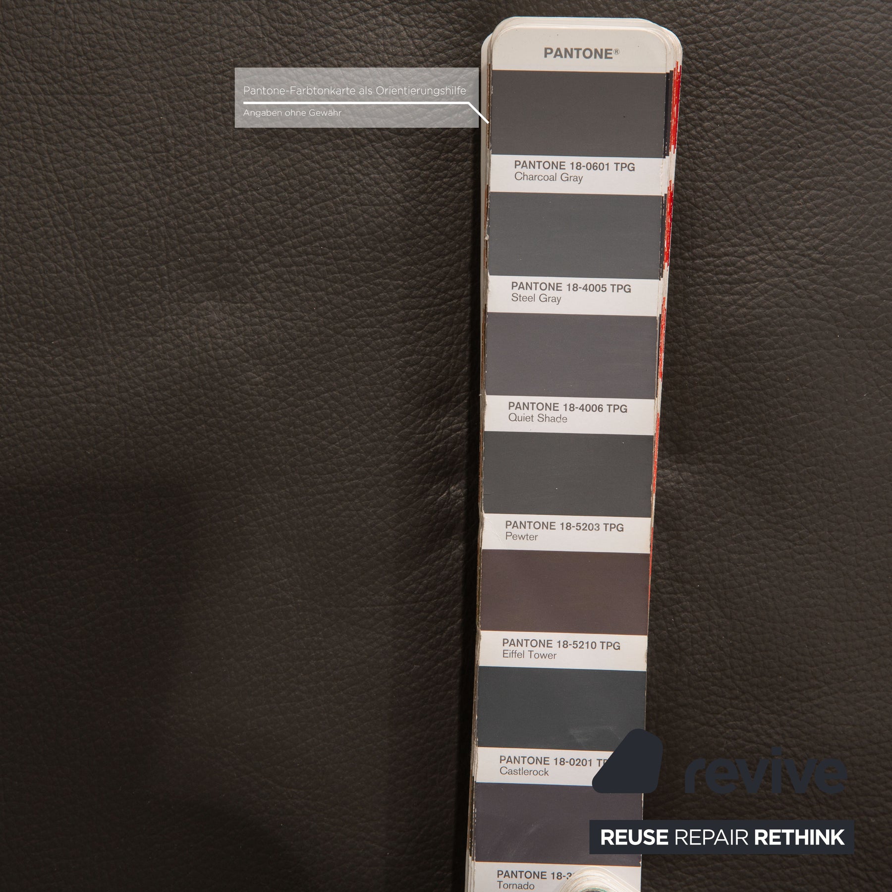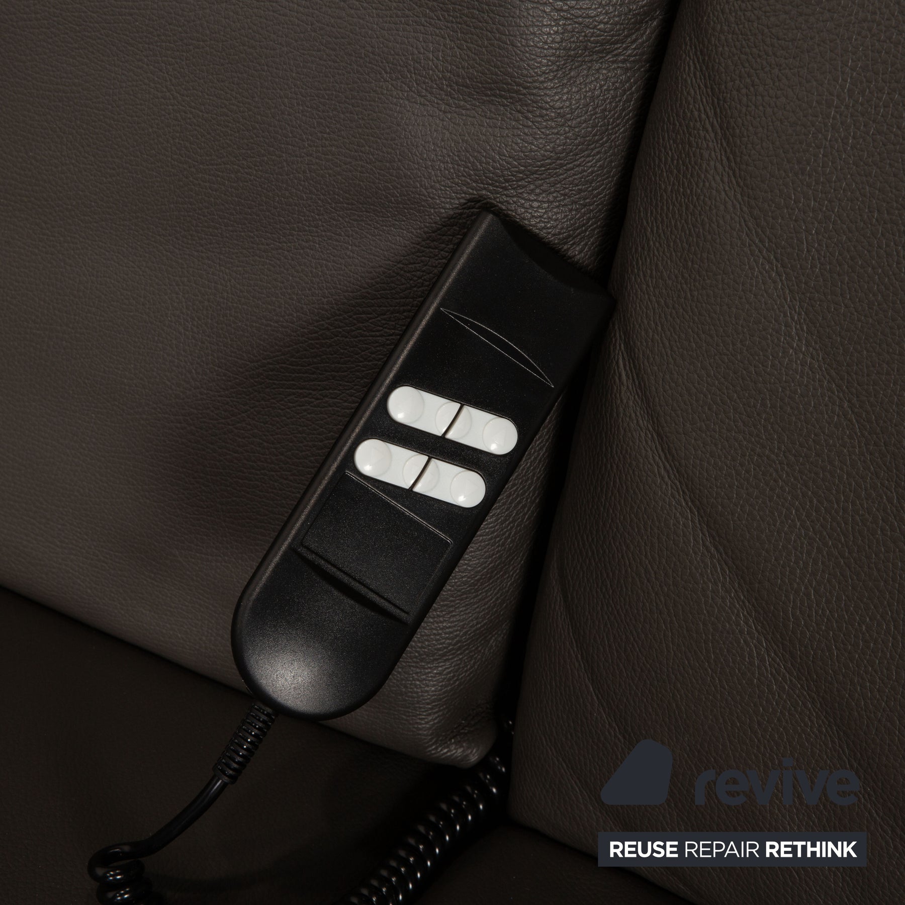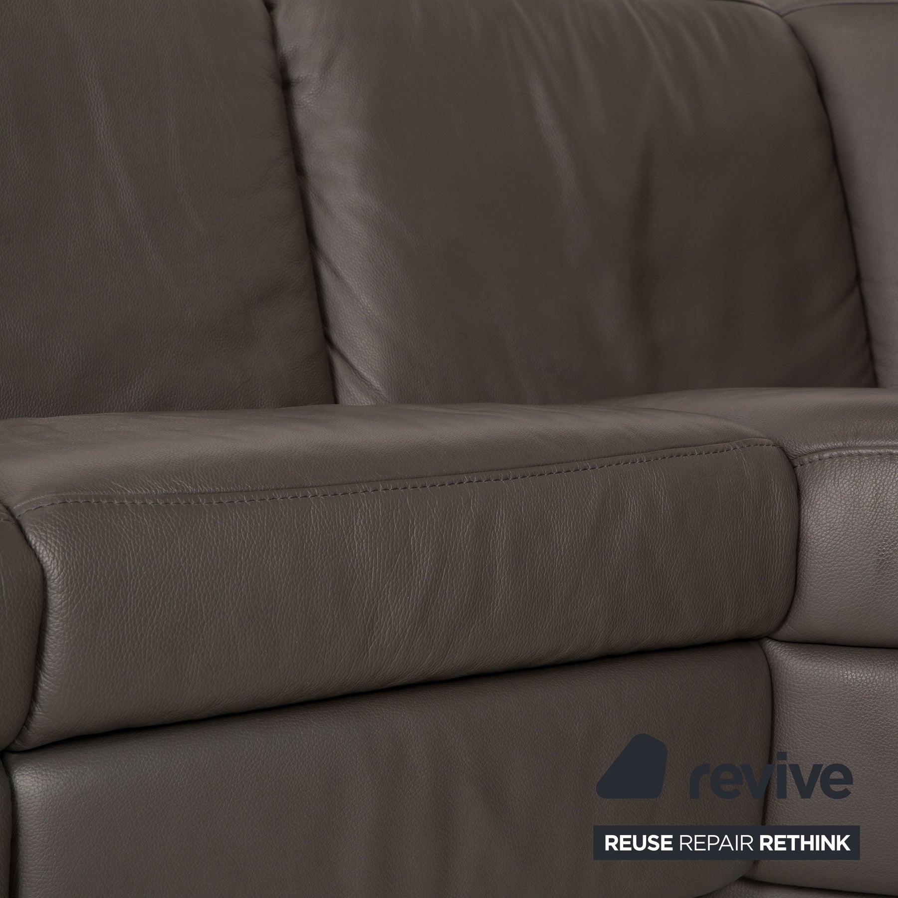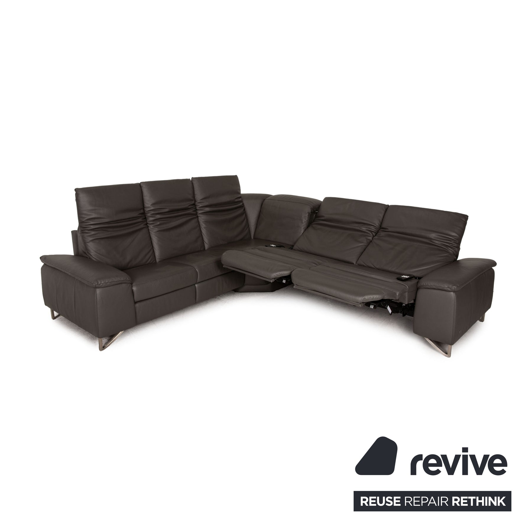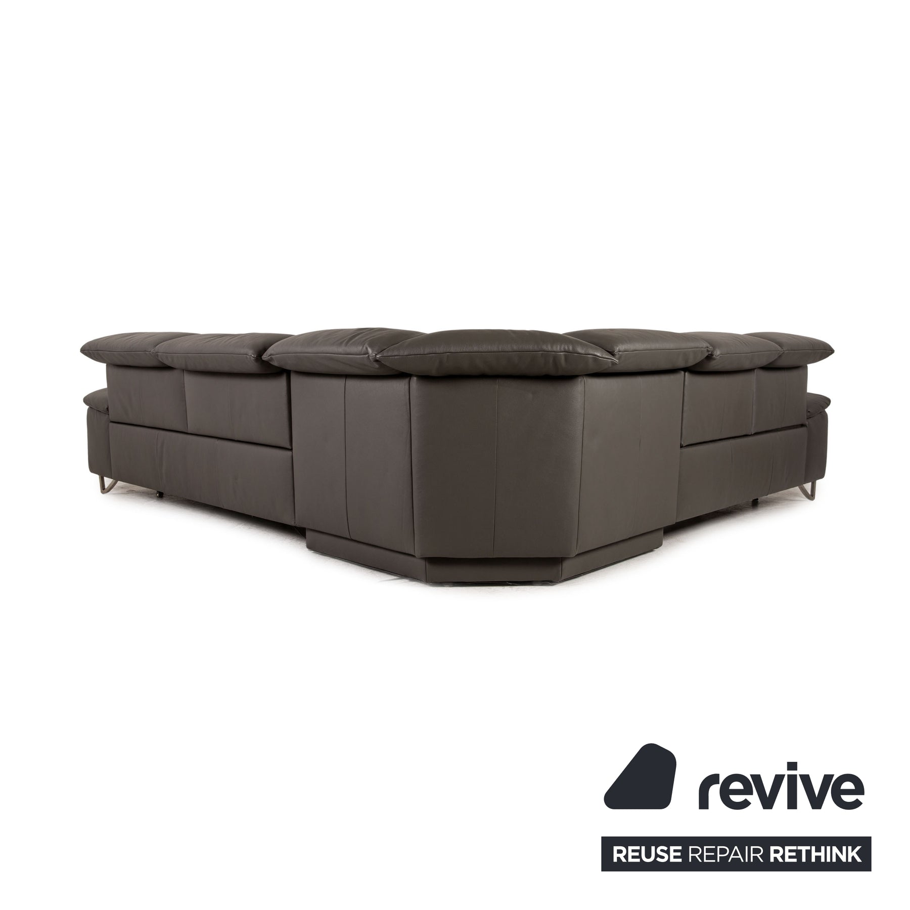 The Himolla sofa is covered with gray genuine leather and stands on silver metal feet. The classic design and the comfortable, electric relaxation function characterize the corner sofa.