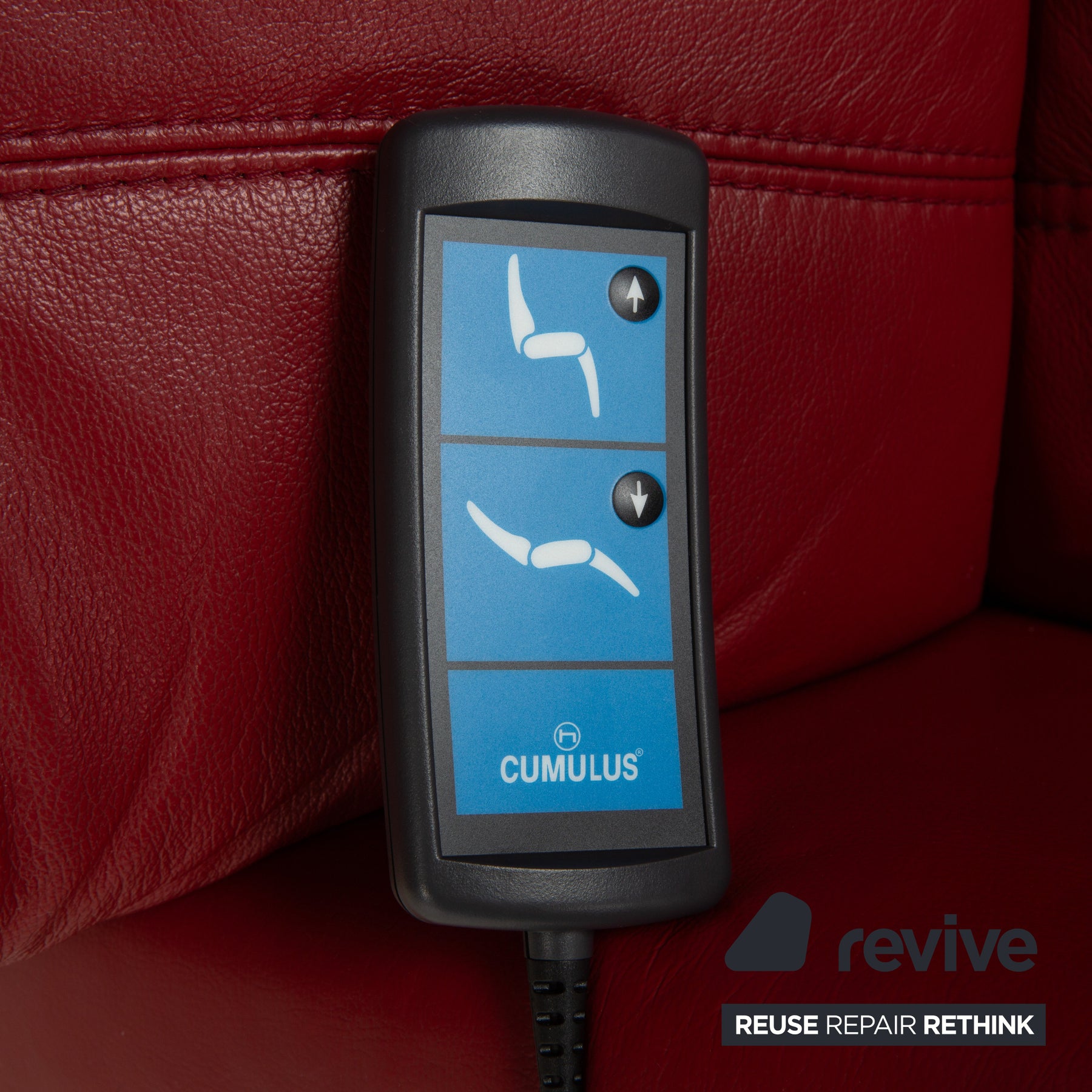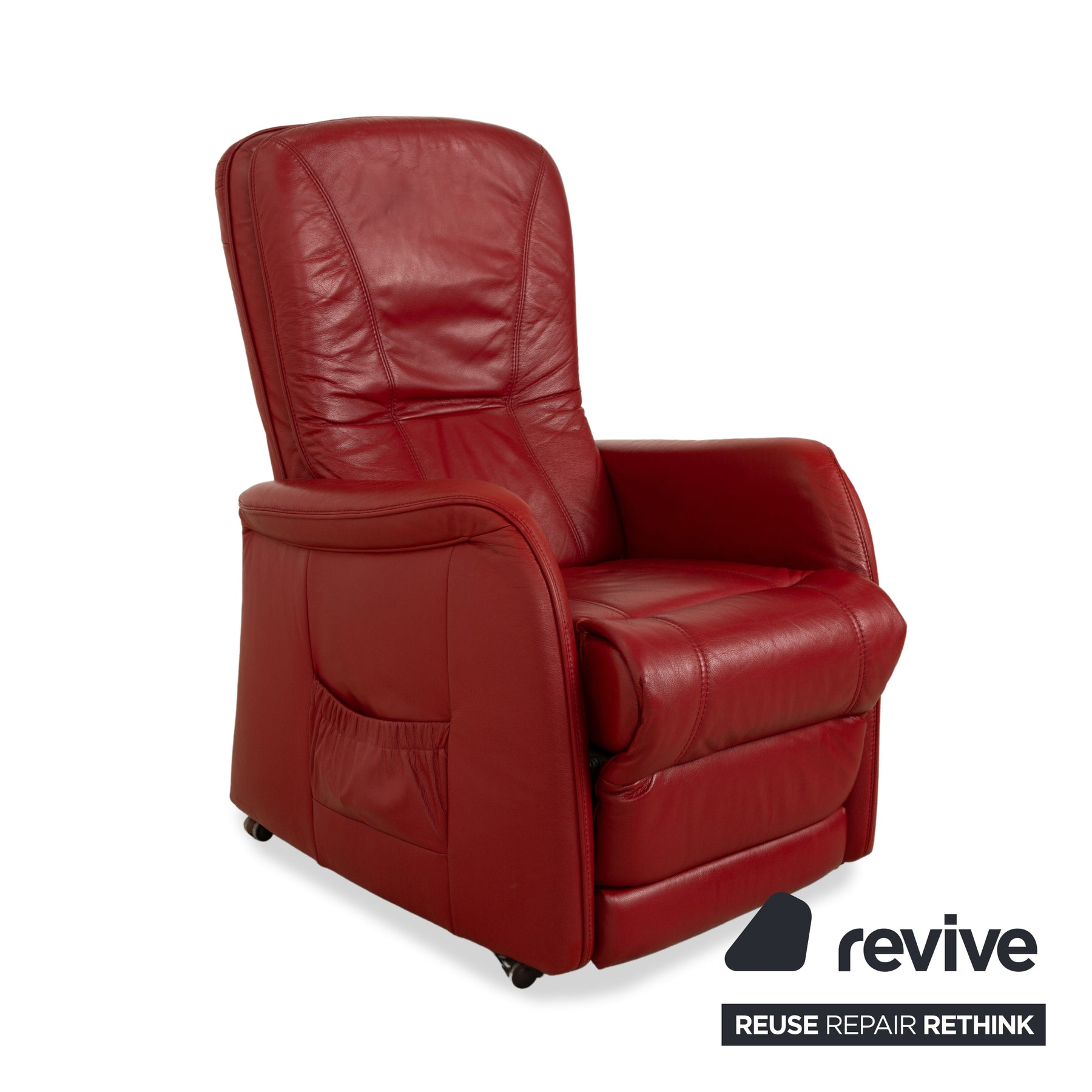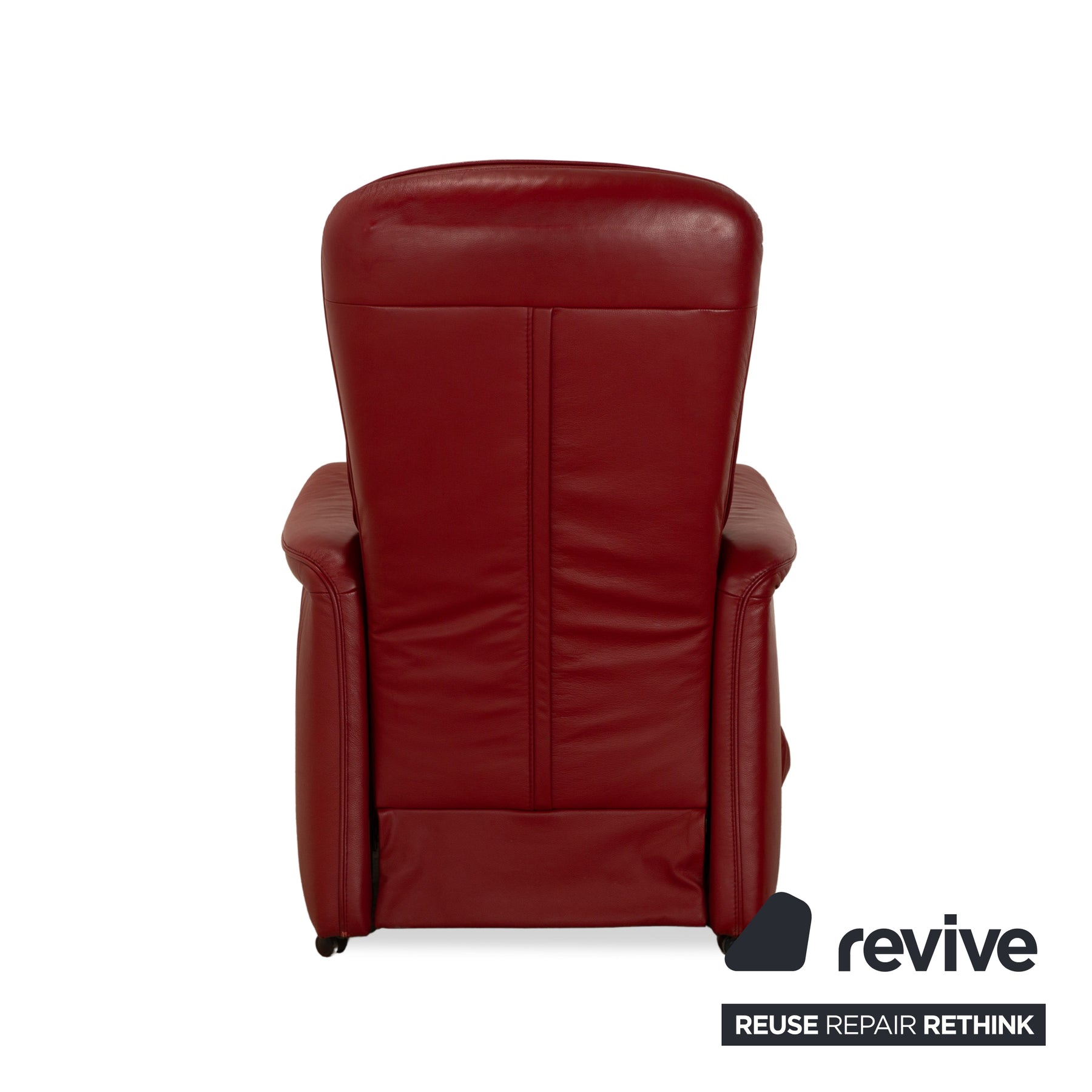 The Himolla armchair is upholstered in red genuine leather and stands on casters. Its rounded edges and comfortable, ergonomic seating position set it apart.