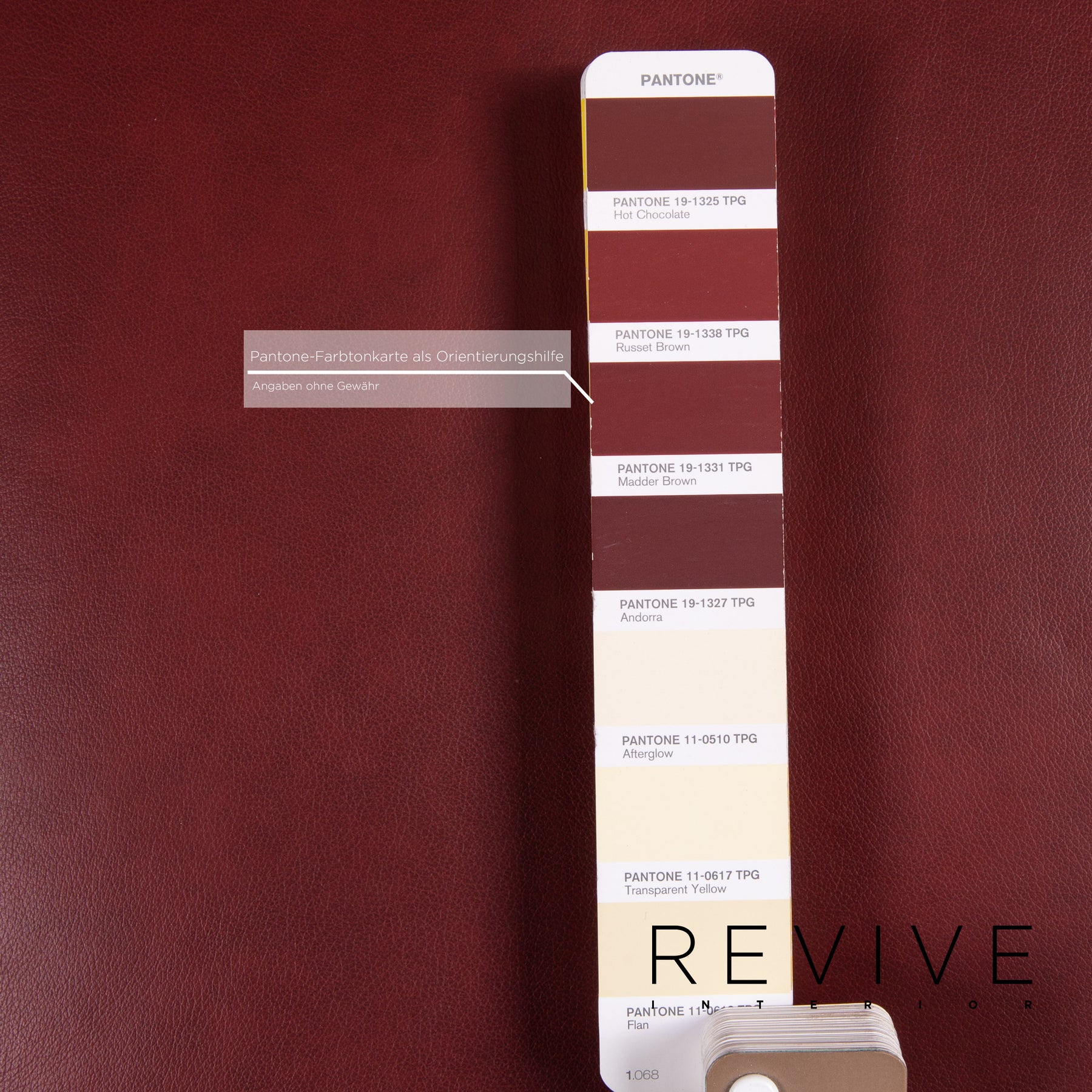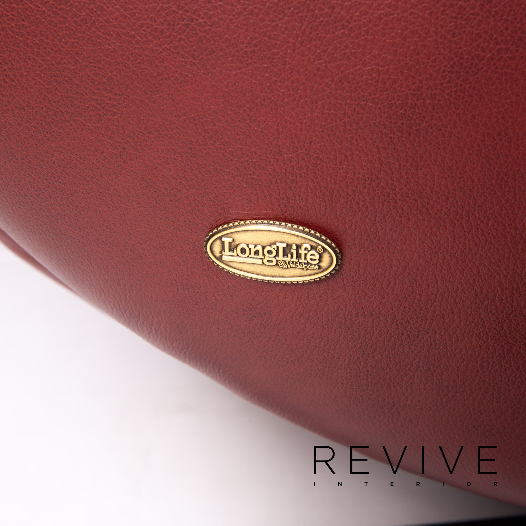 The Himolla two-seater is covered with dark red real leather and stands on dark metal feet. Soft cushions ensure comfort. For more relaxation, the sofa can be brought into a relaxation position by pressing the head.